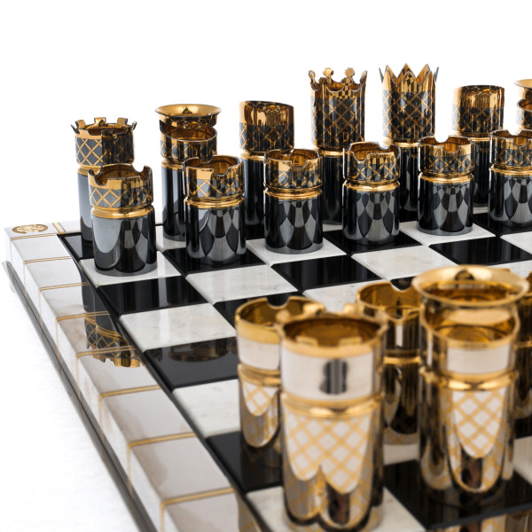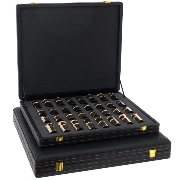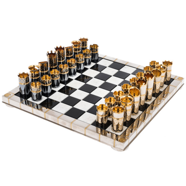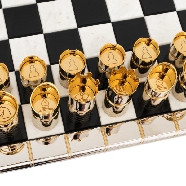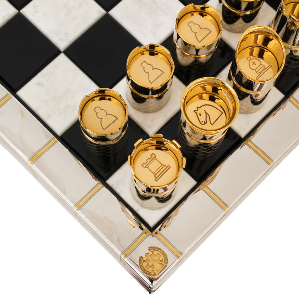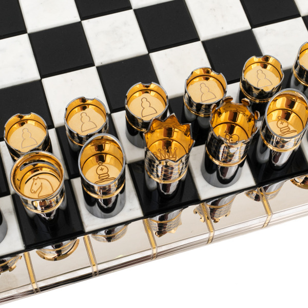 Фигуры, выполненные в оригинальной цилиндрической форме, отсылают к образам корон, башен и царственных артефактов. Позолоченные элементы сверкают в лучах света, создавая эффект торжественной игры, где каждая фигура будто воплощает титул — от короля до пешки. В отделке использованы фирменные златоустовские техники гравировки и золочения, благодаря которым шахматы приобретают статус не просто предмета досуга, но и произведения декоративно-прикладного искусства.