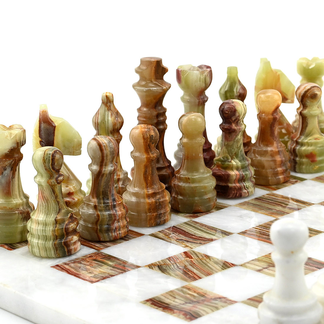 Шахматные фигуры демонстрируют богатство оттенков и фактур: один комплект выполнен из белого мрамора, второй — из оникса с переливами зелёного, песочного и терракотового. Каждая фигура — не просто элемент игры, а миниатюрная скульптура, несущая в себе отпечаток ремесленного мастерства и природной уникальности камня.