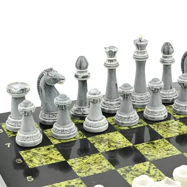 Шахматная доска, выполненная из змеевика и долерита, создает элегантный фон для фигур, подчеркивая их красоту и уникальность. Этот набор идеально подойдет для ценителей искусства и коллекционеров, а также станет великолепным подарком для тех, кто ценит традиции и культурное наследие.