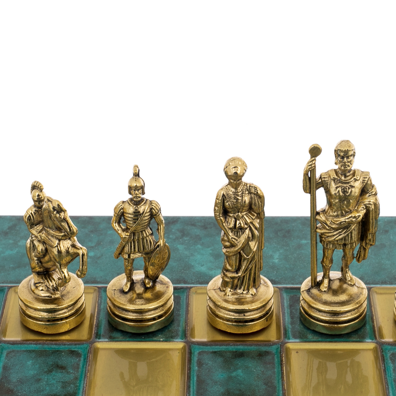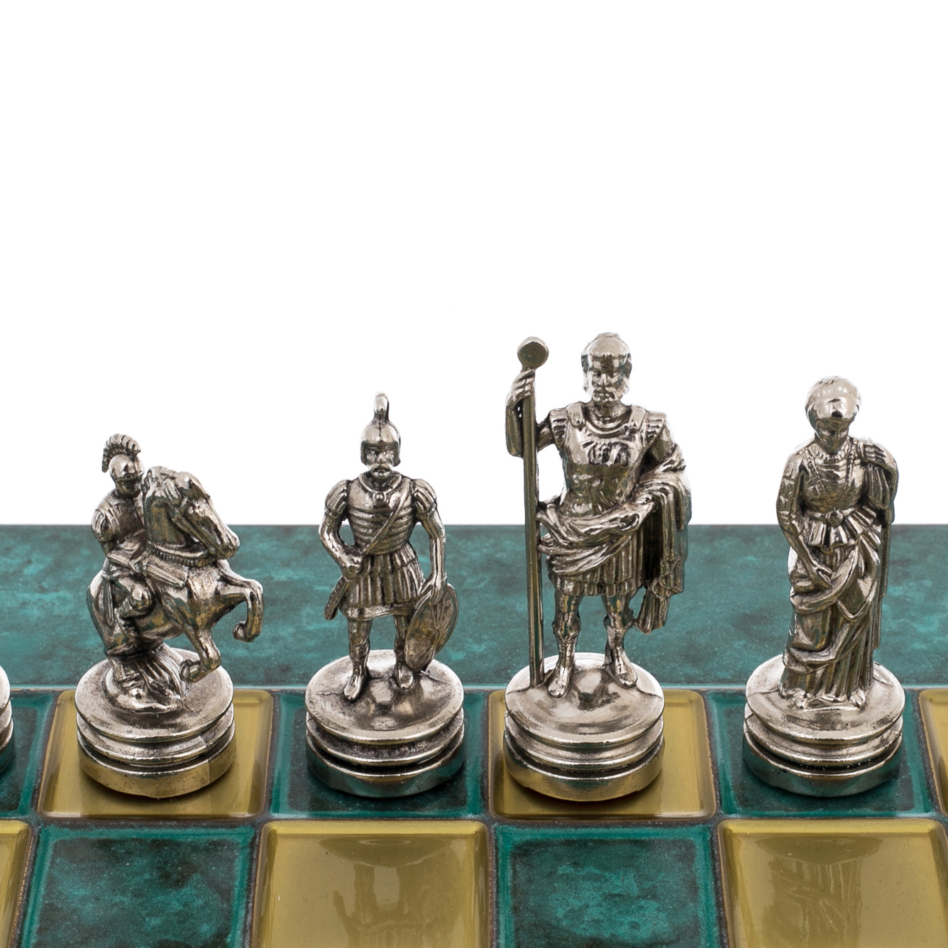 Шахматный набор «Античные войны» — произведение искусства, вобравшее в себя величие древних империй и строгость классической формы. На квадратной доске, отделанной искусственной патиной и украшенной золотистыми и бирюзовыми клетками, разворачивается противостояние двух античных армий. Шахматные фигуры отлиты из металла и покрыты двумя контрастными финишами — золотым и серебристым. Каждая фигура — миниатюрная скульптура, созданная с филигранной точностью: цари, вооружённые вождями и легионерами, царицы, благородные матроны, кавалерия на гарцующих скакунах и пешие воины, чья осанка внушает уважение.