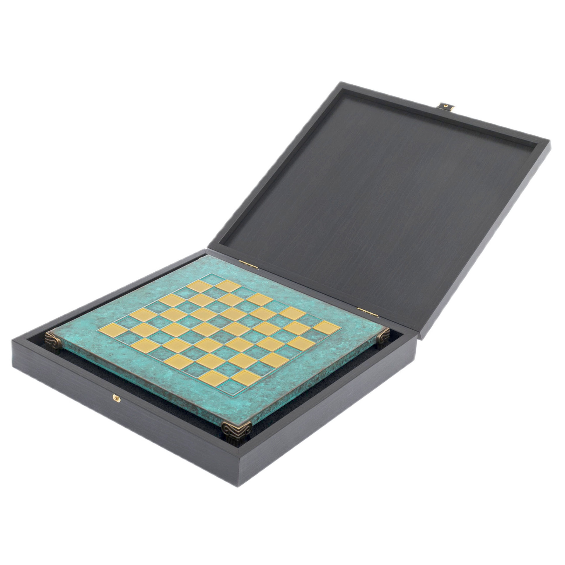 Игра происходит не на простой доске, а на утончённом предмете с архитектурными деталями, отсылающими к храмовой классике: ножки стилизованы под античные колонны, словно переносят действие в мраморные залы Акрополя. Цветовая гамма доски — от насыщенного изумрудного до матового золотого — создает ощущение драгоценного артефакта, изъятого из собрания музея. Всё это хранится в строгом футляре, выложенном бархатом и обтянутом древесиной тёмного тона, под стать предмету коллекционного уровня.