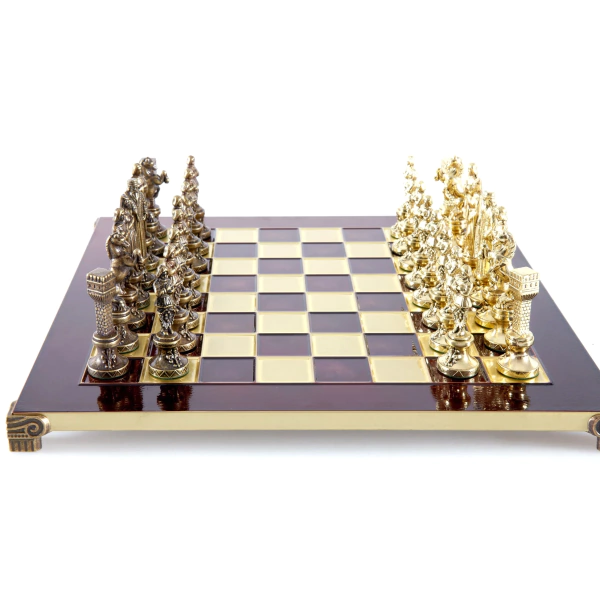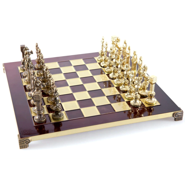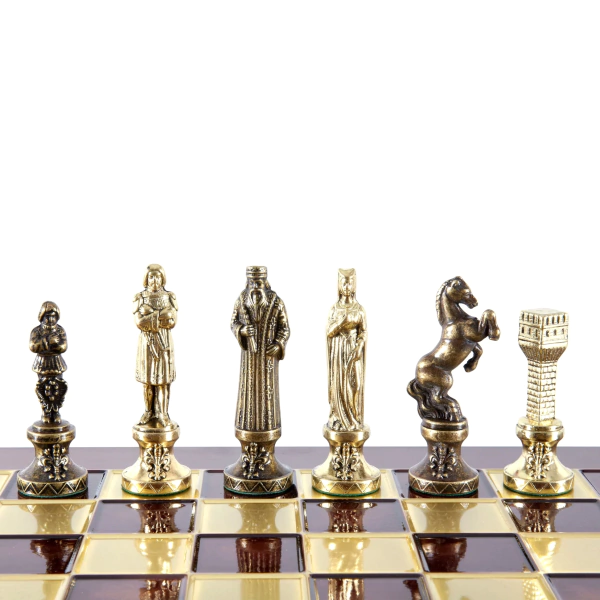 Подарочные шахматы «Ренессанс» — не просто игра, а интеллектуальный ритуал, облачённый в формы эпохи Возрождения. На доске, покрытой лаком с зеркальной глубиной, расставлены фигуры, отлитые из металла с гальваническим покрытием — благородным золотом и благородным серебром. Каждый персонаж — самостоятельная скульптура, созданная в духе флорентийских школ: дамы в драпированных платьях, рыцари в сложной броне, всадники на гарцующих конях, башни в виде сторожевых укреплений и пешие фигуры с суровыми лицами и средневековыми складками одежды.
