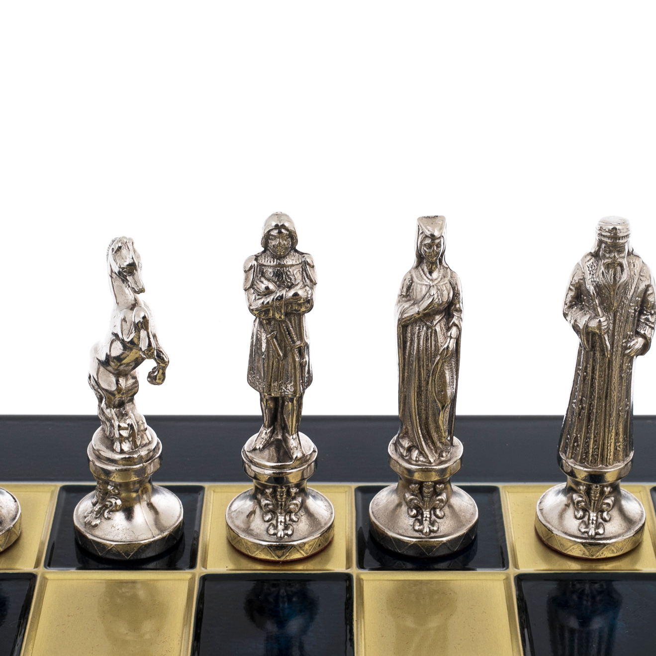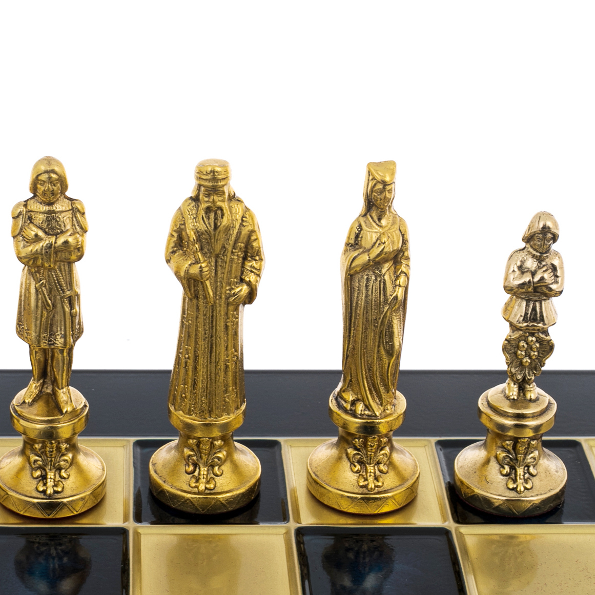 Подарочные шахматы «Ренессанс» — не просто игра, а интеллектуальный ритуал, облачённый в формы эпохи Возрождения. На черно-золотой доске, покрытой лаком с зеркальной глубиной, расставлены фигуры, отлитые из металла с гальваническим покрытием — благородным золотом и благородным серебром. Каждый персонаж — самостоятельная скульптура, созданная в духе флорентийских школ: дамы в драпированных платьях, рыцари в сложной броне, всадники на гарцующих конях, башни в виде сторожевых укреплений и пешие фигуры с суровыми лицами и средневековыми складками одежды.