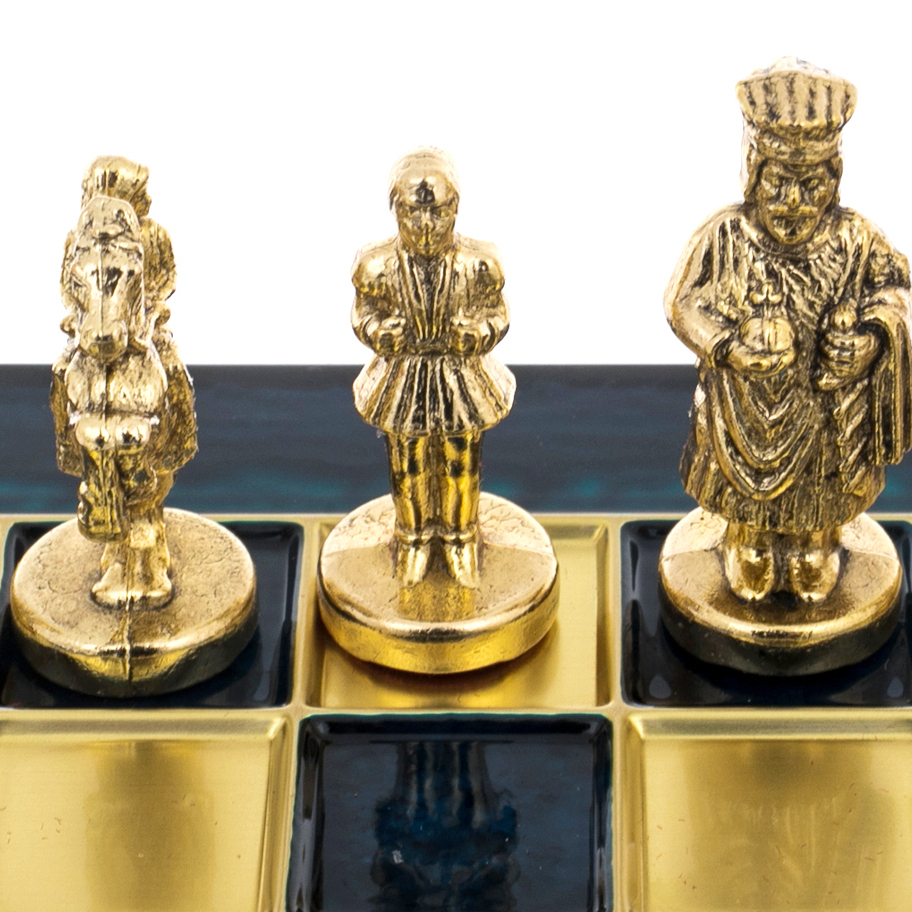 Настольный шахматный набор «Византийская империя» воплощает торжественность древней эпохи и изящество музейного экспоната, обретающего жизнь в доме взыскательного эстета. В нём нет места случайностям — каждая фигура отлита с филигранной точностью, запечатлев на себе черты императорской власти, церемониальной строгости и рыцарского достоинства. Золочёная и посеребрённая армия, разделённая на два стана, словно оживает на поле, выложенном чередующимися квадратами глубокого синего и солнечно-золотого цвета.