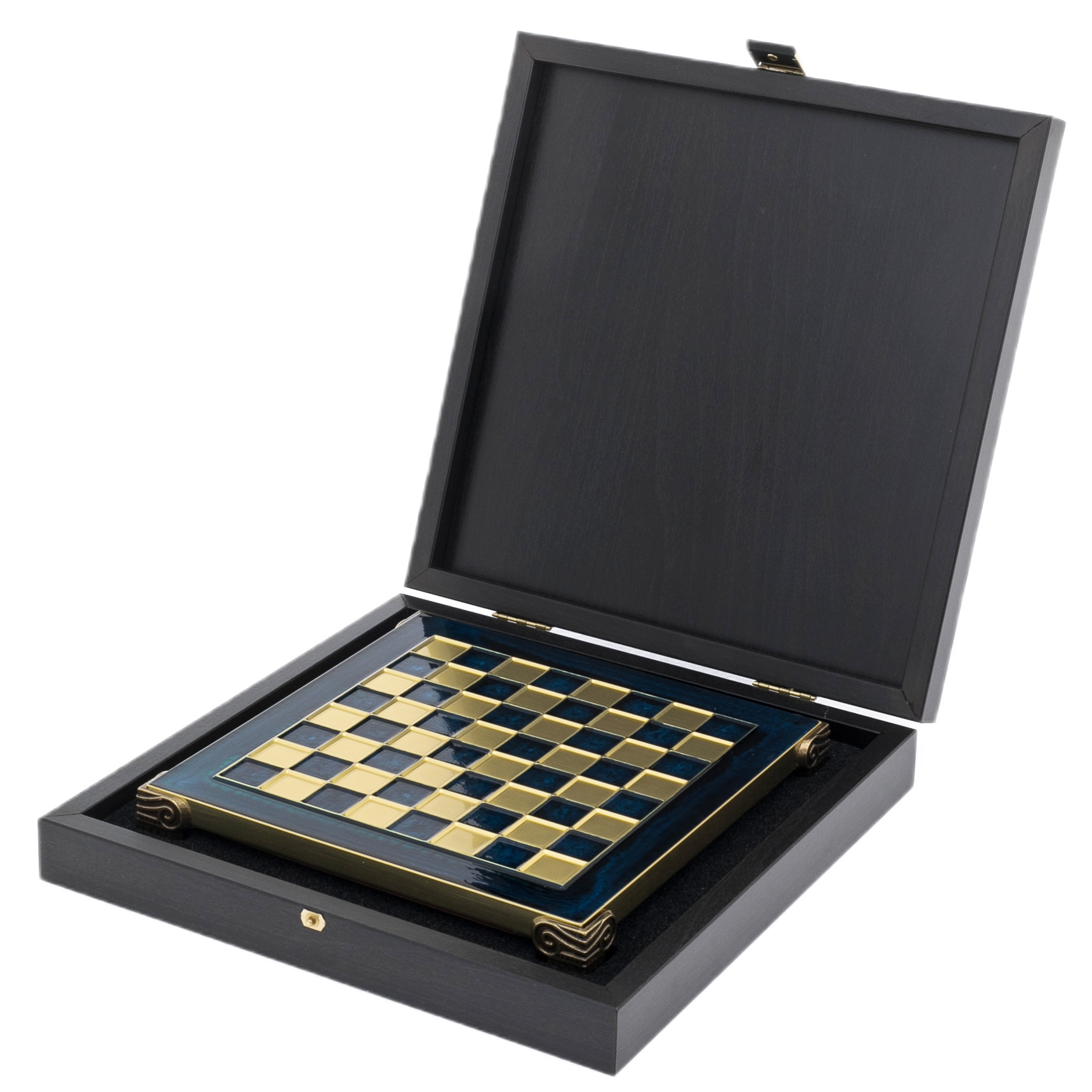 Игровое поле, обрамлённое сияющим кантом с бирюзовым переливом, покоится на ножках в виде ионических капителей — декоративный акцент, указывающий на греко-византийское вдохновение. Шахматы хранятся в элегантном футляре из благородного дерева тёмного оттенка, дополненном фетровой вставкой для бережного хранения. Поверхность доски защищена прочным глянцевым покрытием, придающим шахматам статус декоративного объекта, достойного места в кабинете, коллекции или парадной гостиной.