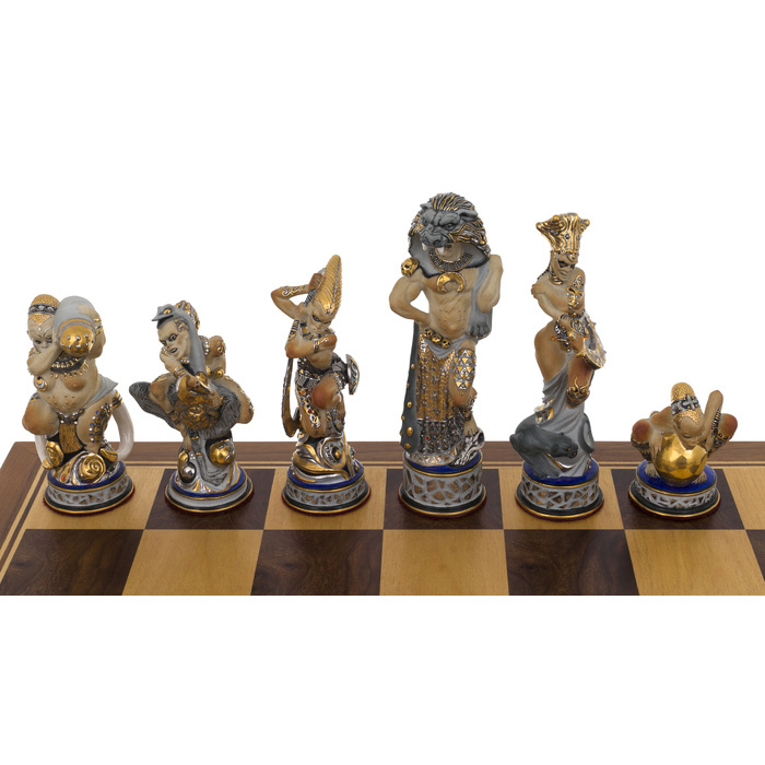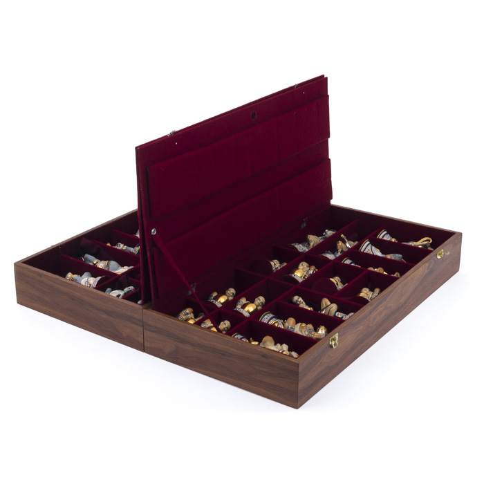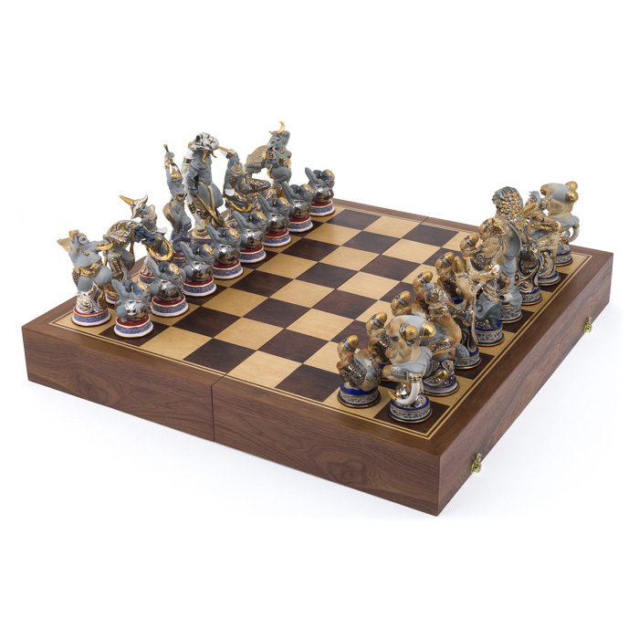 Доска, выполненная из благородного дерева, служит не просто полем битвы, а сценой, достойной легенды. Когда она закрыта, это произведение искусства; когда распахивается — дверь в мир древних героев, оживающих в каждой партии. Внутреннее убранство футляра, отделанное бархатом, подчеркивает статус владельца, словно подготавливая к осознанию собственной исключительности.