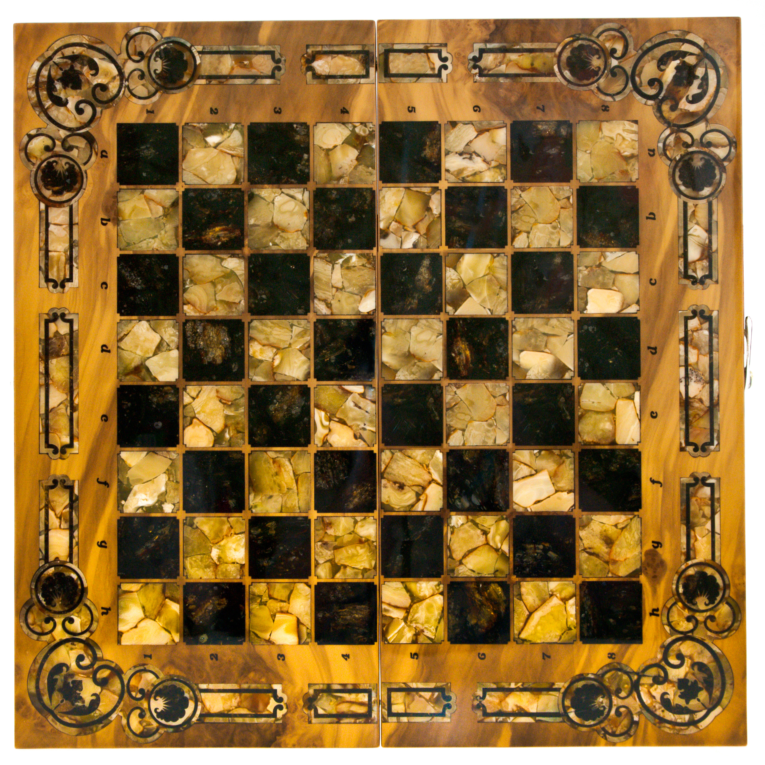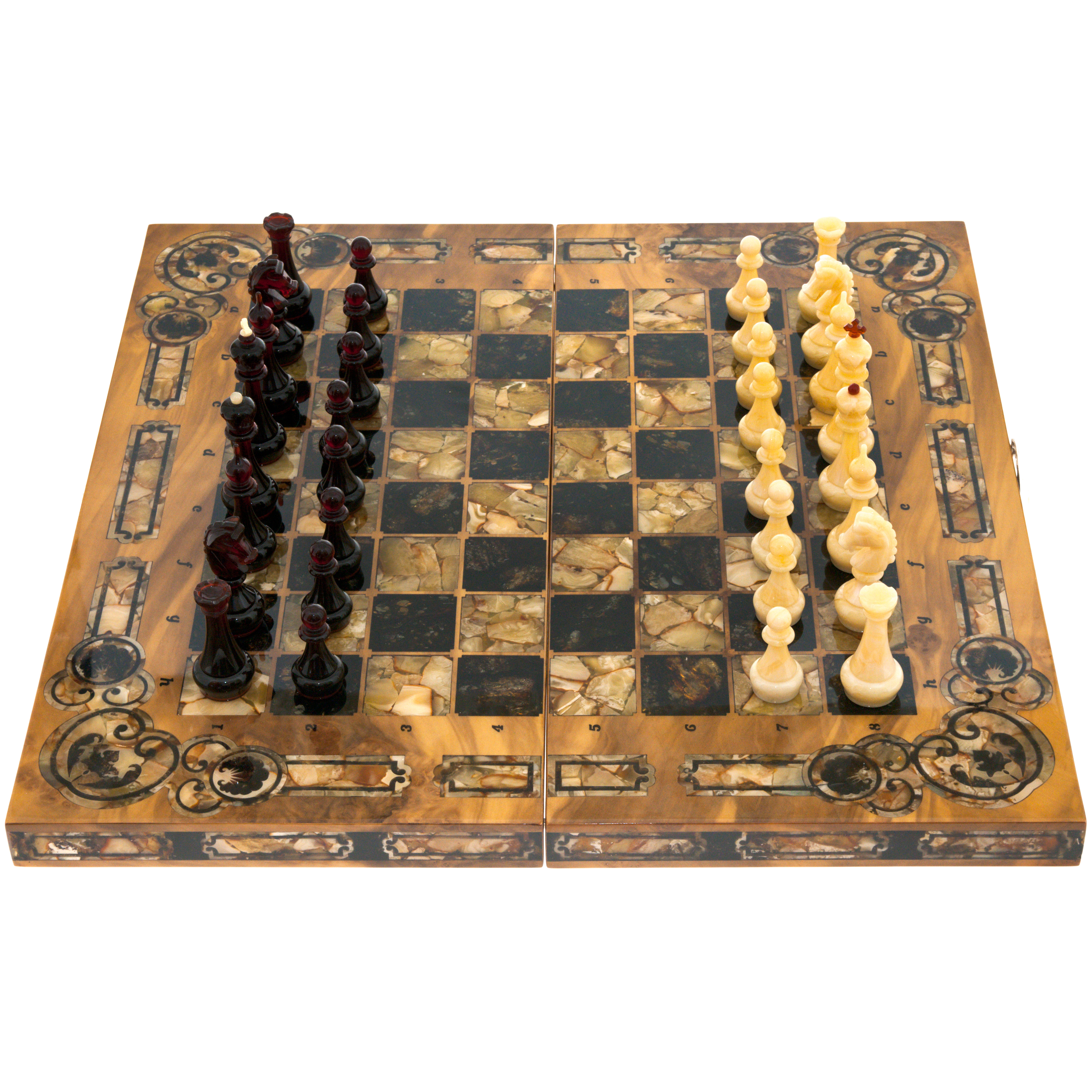 Шахматы из вавоны и янтаря "Арабески-Марин"Шахматы из вавоны и янтаря "Арабески-Марин"Безупречное качество и эксклюзивный дизайн элитных шахмат не оставят равнодушным истинного ценителя добротных и красивых вещей! Эти шахматы изготавливаются вручную из натурального янтаря в технике «Ковровская мозаика». Текстура материалов неповторима: невозможно изготовить двое совершенно одинаковых шахмат. Для изготовления игровой фурнитуры используется янтарный композит самых разных оттенков.