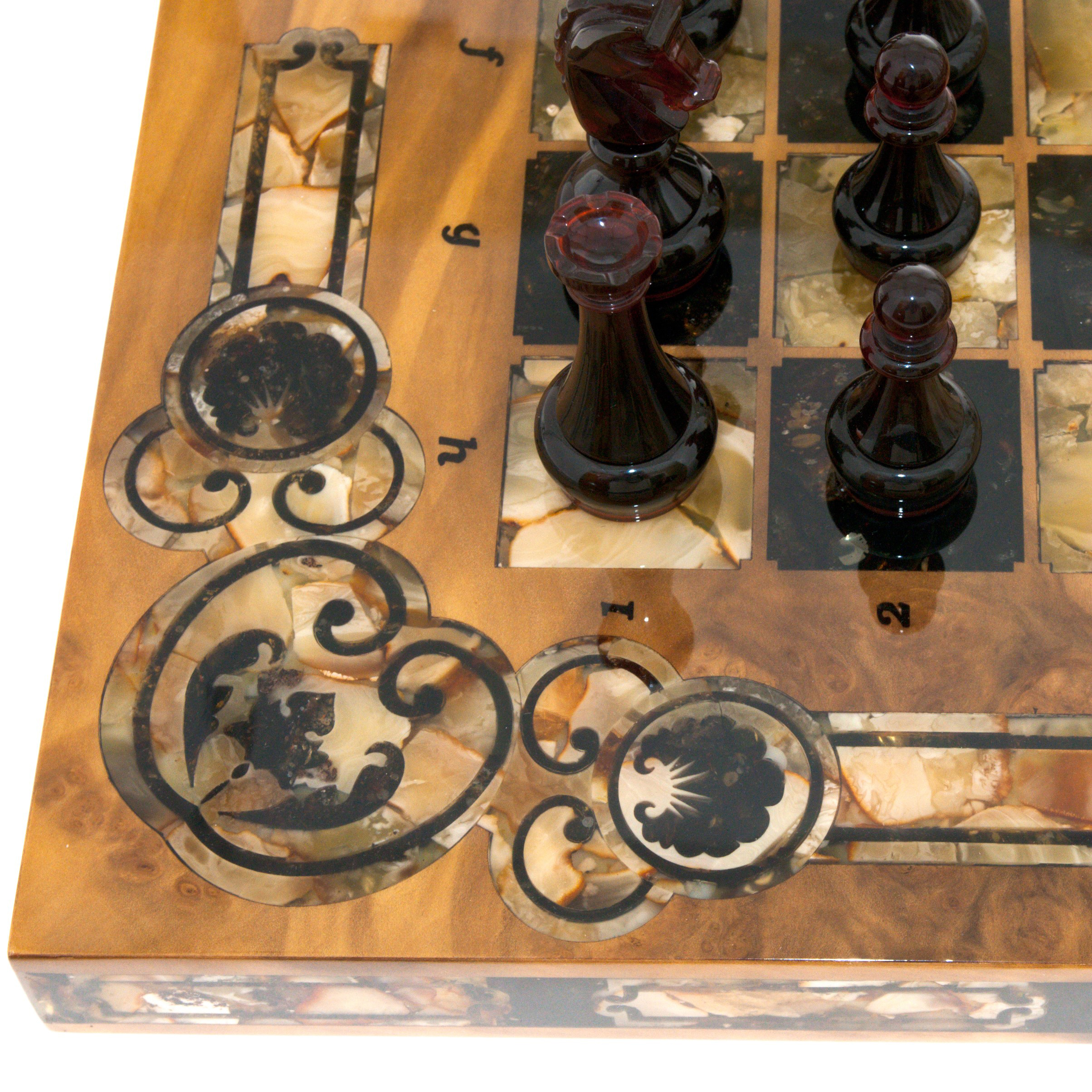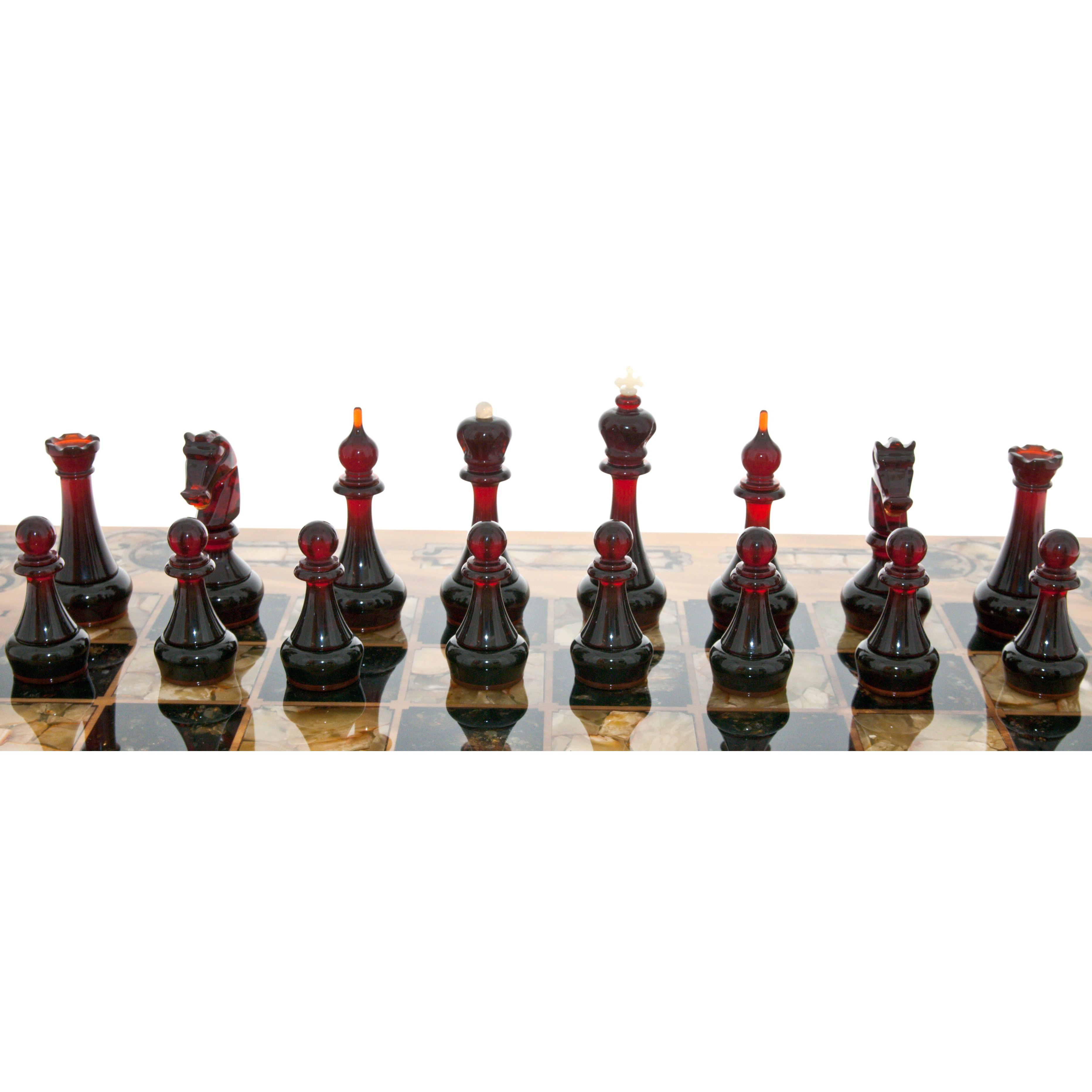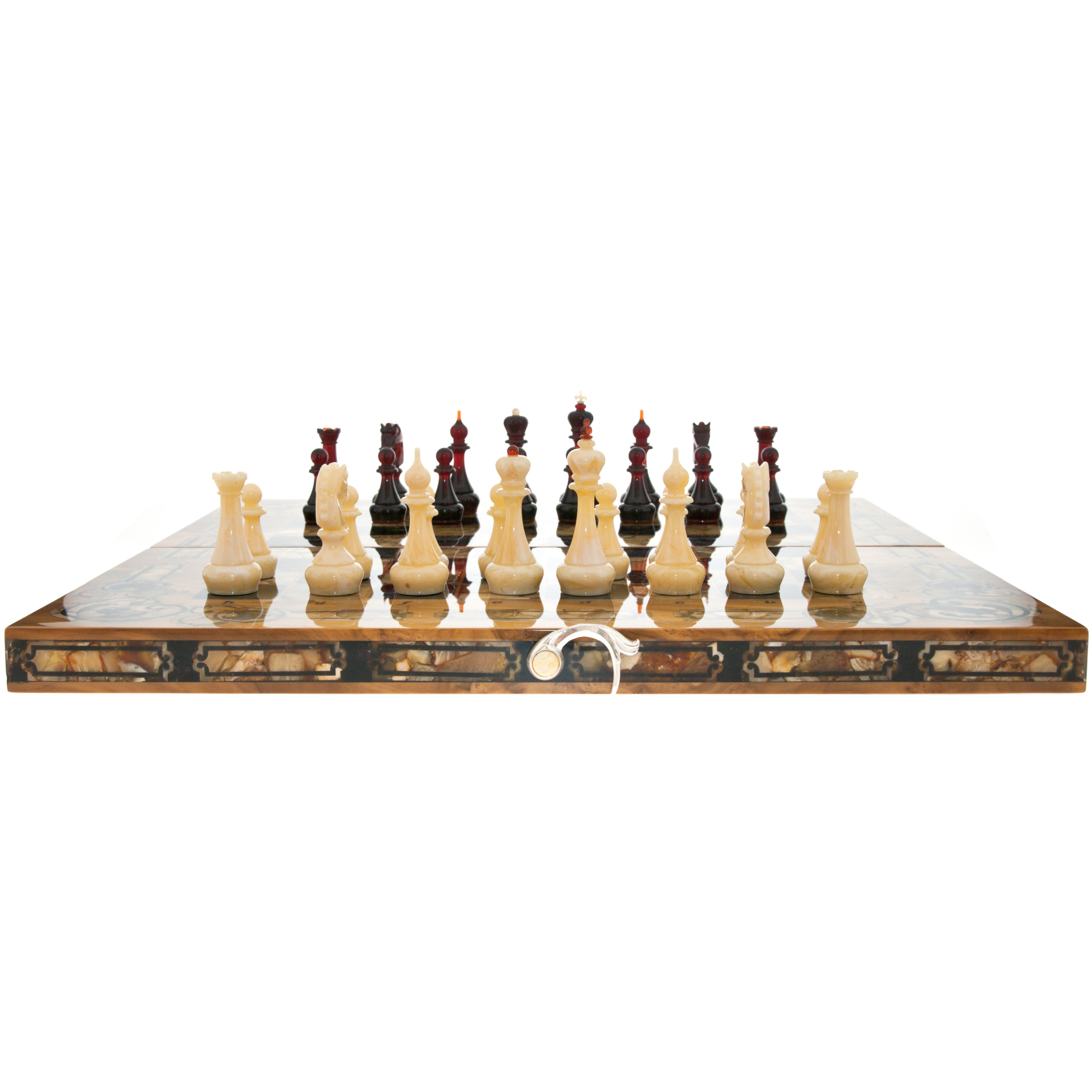 Безупречное качество и эксклюзивный дизайн элитных шахмат не оставят равнодушным истинного ценителя добротных и красивых вещей! Эти шахматы изготавливаются вручную из натурального янтаря в технике «Ковровская мозаика». Текстура материалов неповторима: невозможно изготовить двое совершенно одинаковых шахмат. Для изготовления игровой фурнитуры используется янтарный композит самых разных оттенков.