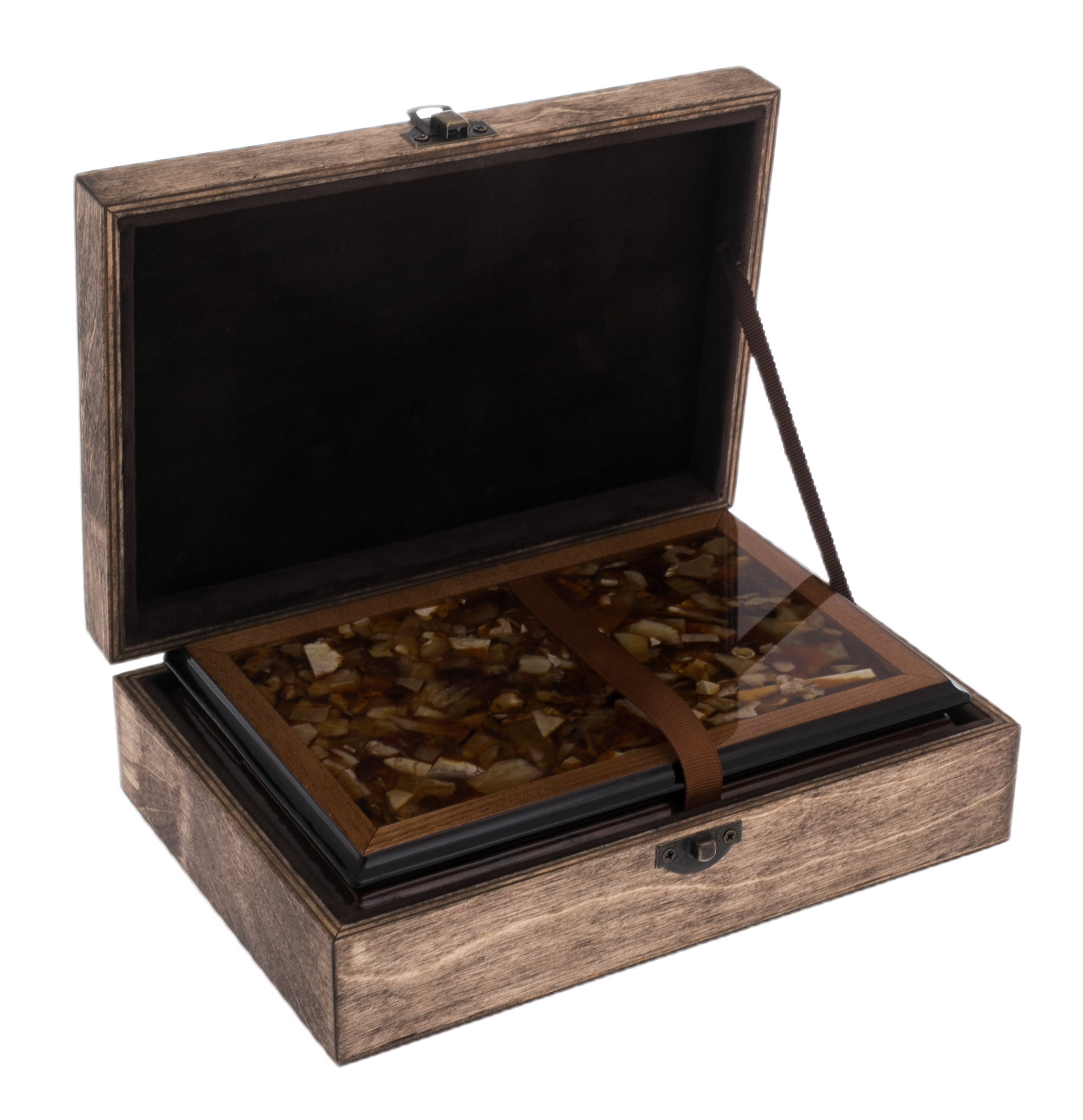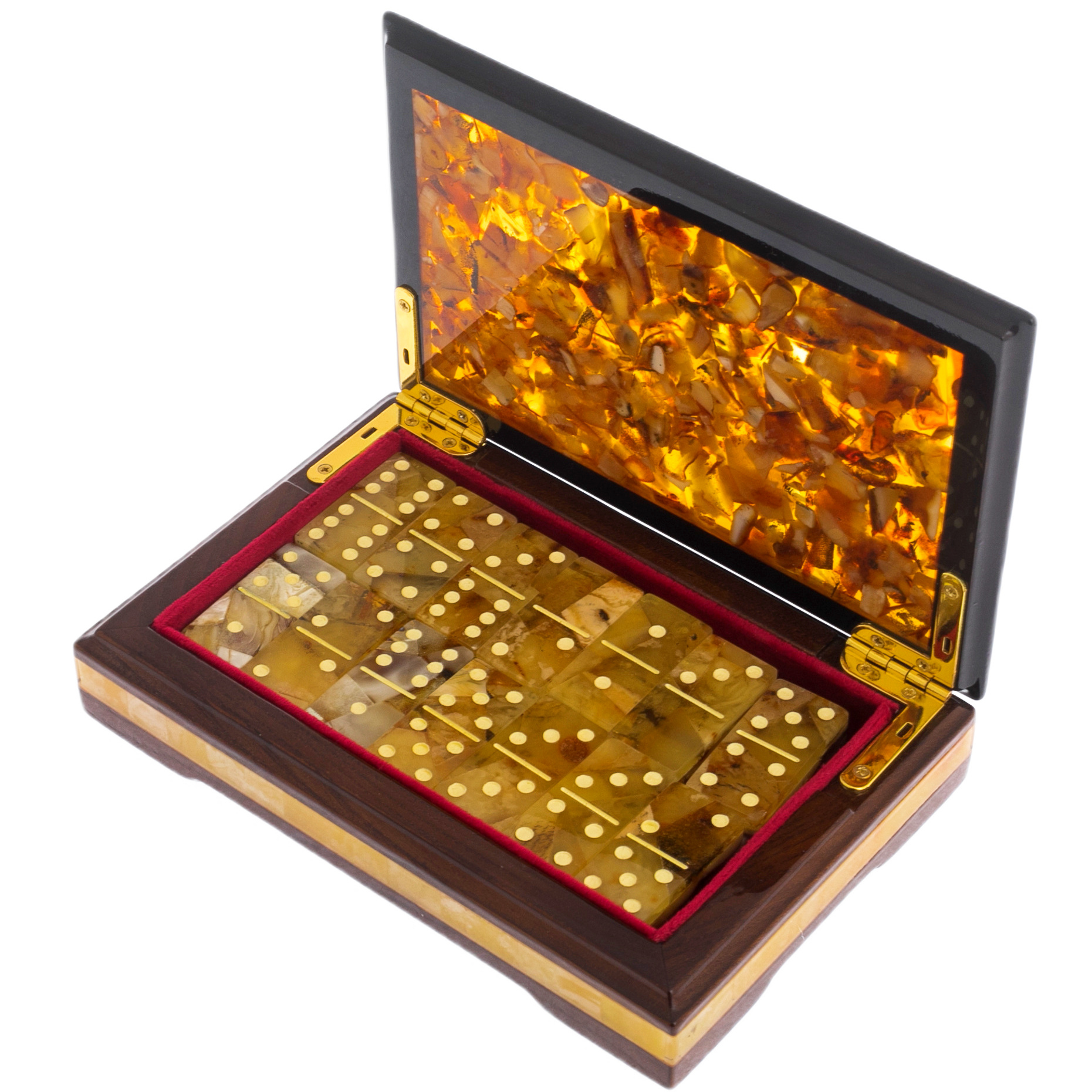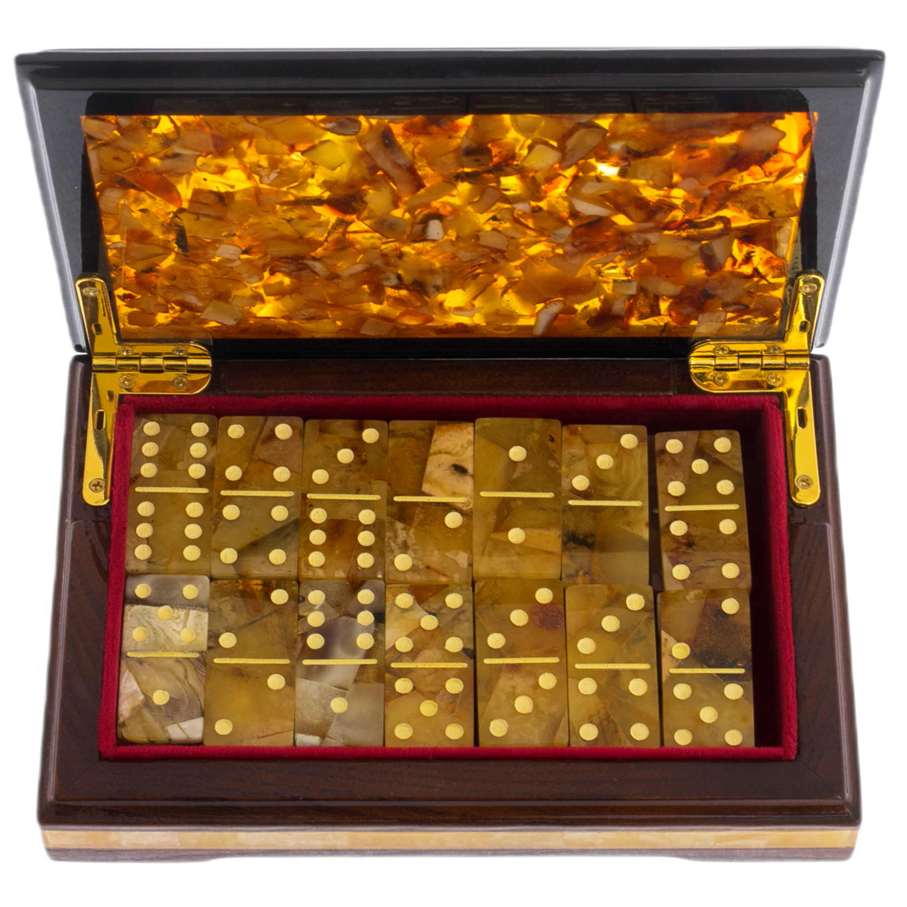 Великолепный набор домино из натурального янтаря — это не просто игра, а подлинный шедевр, призванный восхищать. Каждая костяшка, будто окутанная солнечным светом, заключает в себе многовековую историю, сохранившуюся в каждом переливе природного камня. Янтарь с его золотистыми и медовыми оттенками словно оживает, переливаясь теплом и внутренней энергетикой, которую невозможно не почувствовать.
