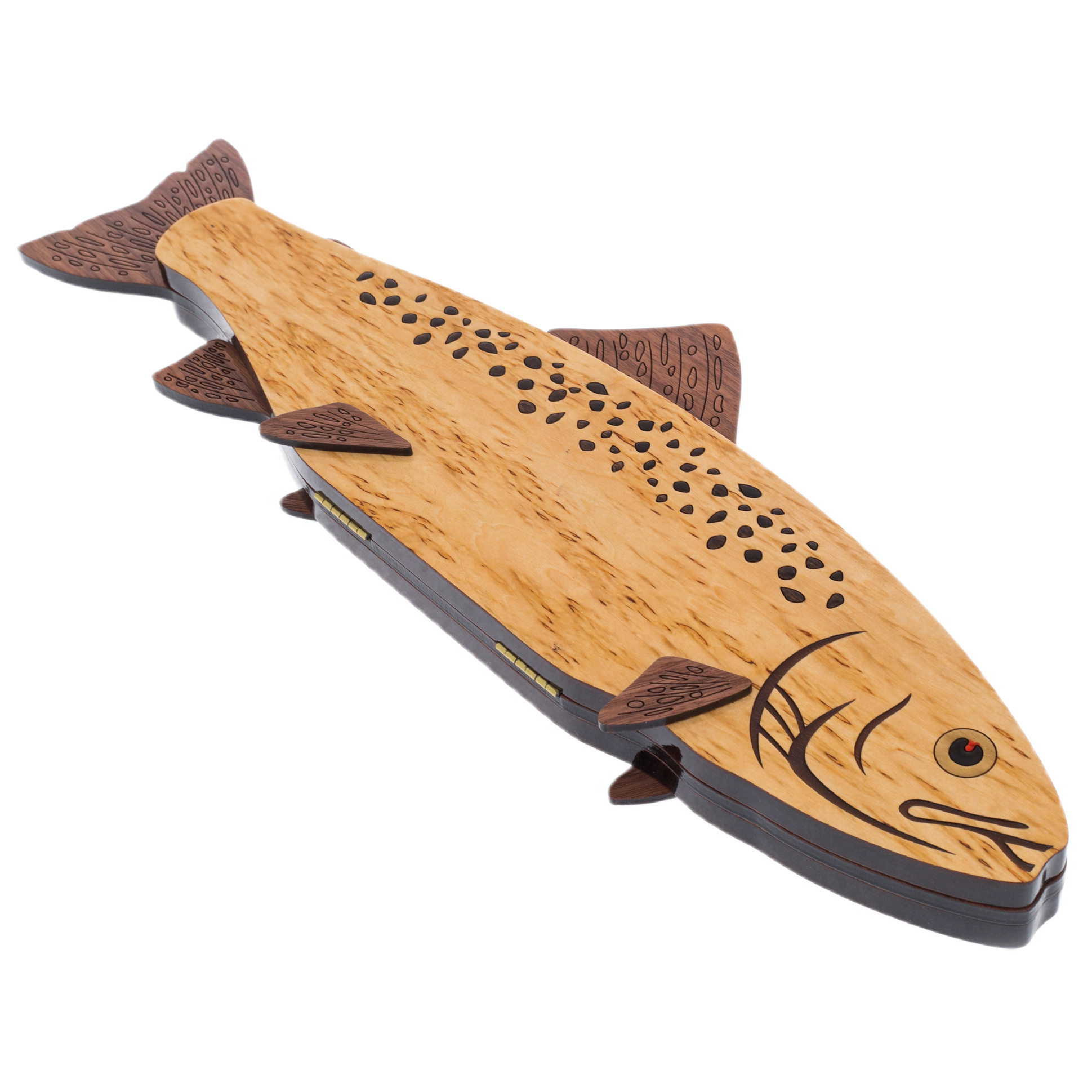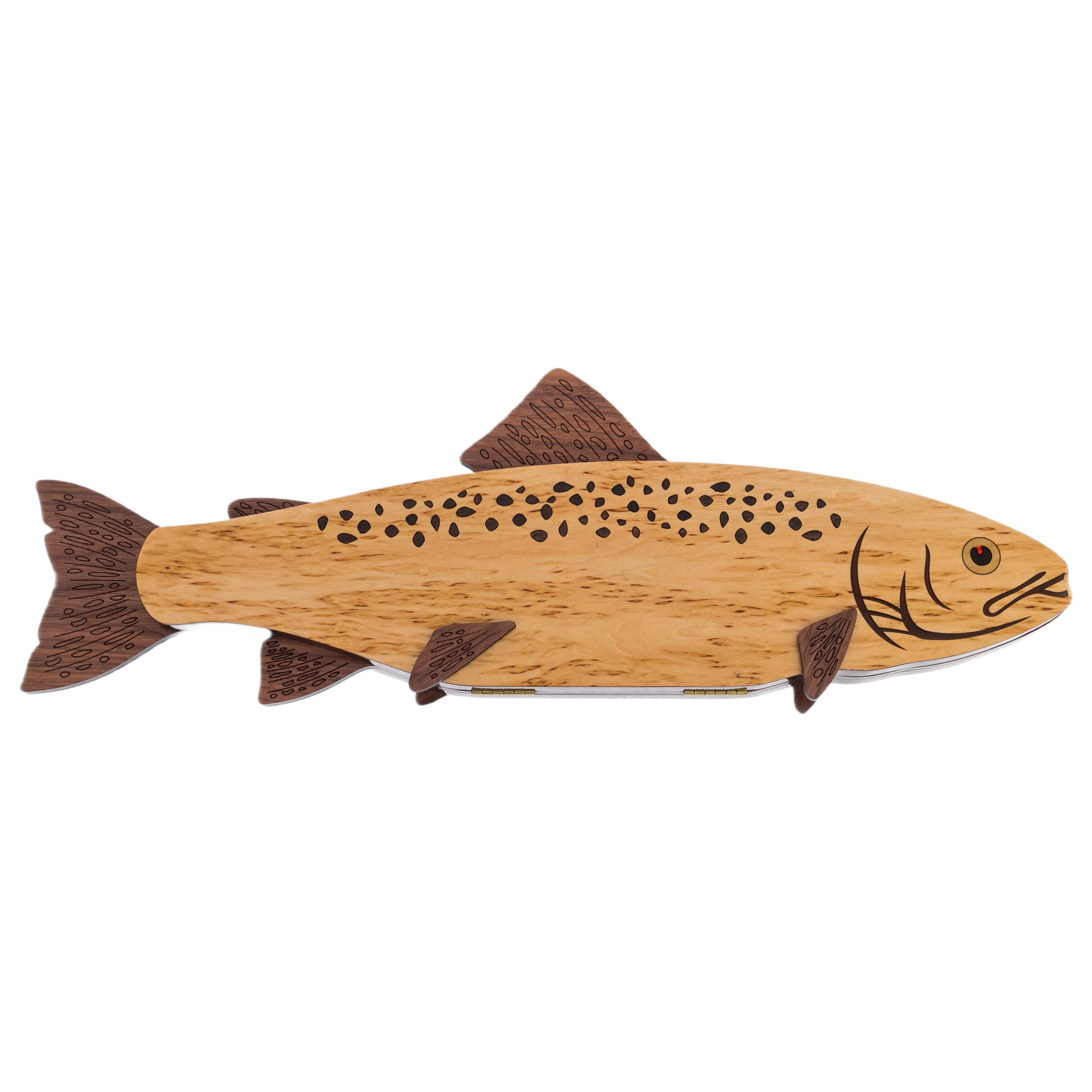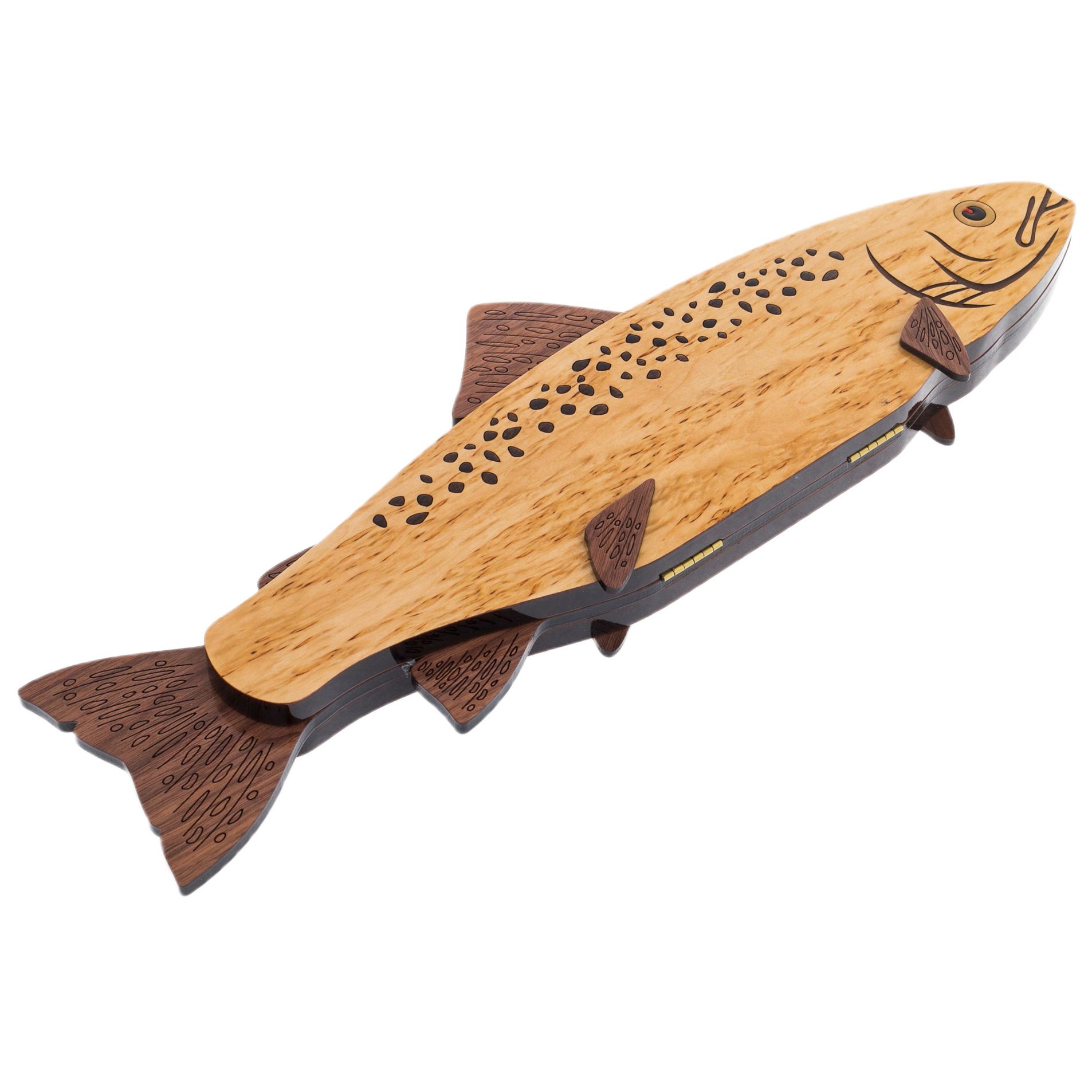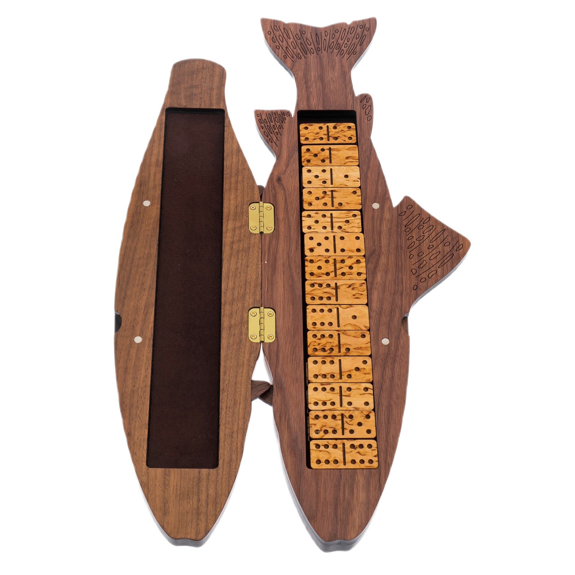 Домино из карельской берёзы в форме форели — это настоящее произведение искусства, объединяющее природную красоту древесины и мастерство ремесленников. Элегантный дизайн, воспроизводящий изящные очертания рыбы с характерным узором на теле, подчёркивает уникальность и изысканность изделия. Каждая деталь — от плавников до глаз — проработана с тонким чувством стиля, превращая классическую игру в эстетическое наслаждение и особый ритуал общения.