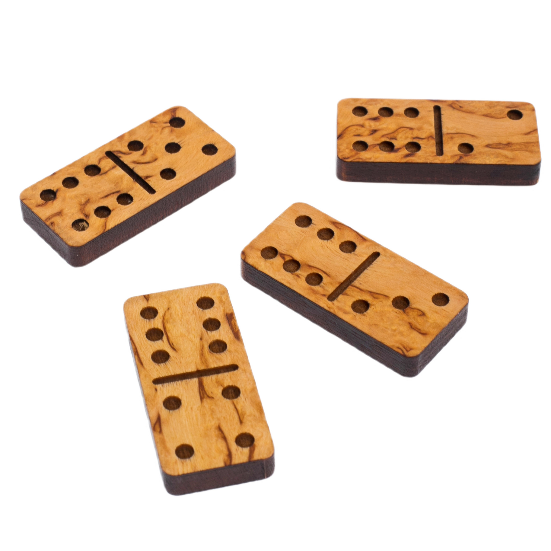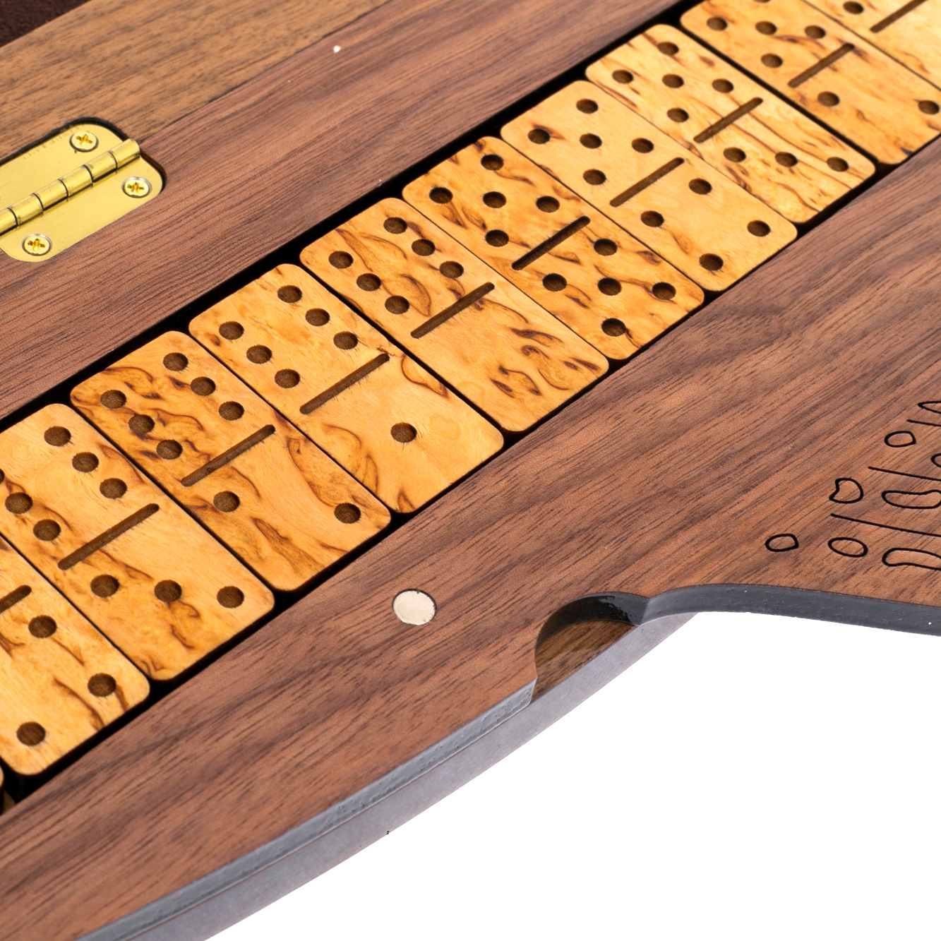 Корпус выполнен из благородной карельской берёзы с насыщенным рисунком и тёплыми оттенками, дополненный элементами из тёмной древесины, создающей выразительный контраст и подчёркивающей природную текстуру. Внутреннее пространство аккуратно организовано для хранения фишек домино, выполненных из того же высококачественного материала с чёткой прорисовкой точек и линий. Мягкая бархатистая подкладка защищает содержимое, а надёжные металлические петли и магнитные застёжки обеспечивают долговечность и удобство эксплуатации.