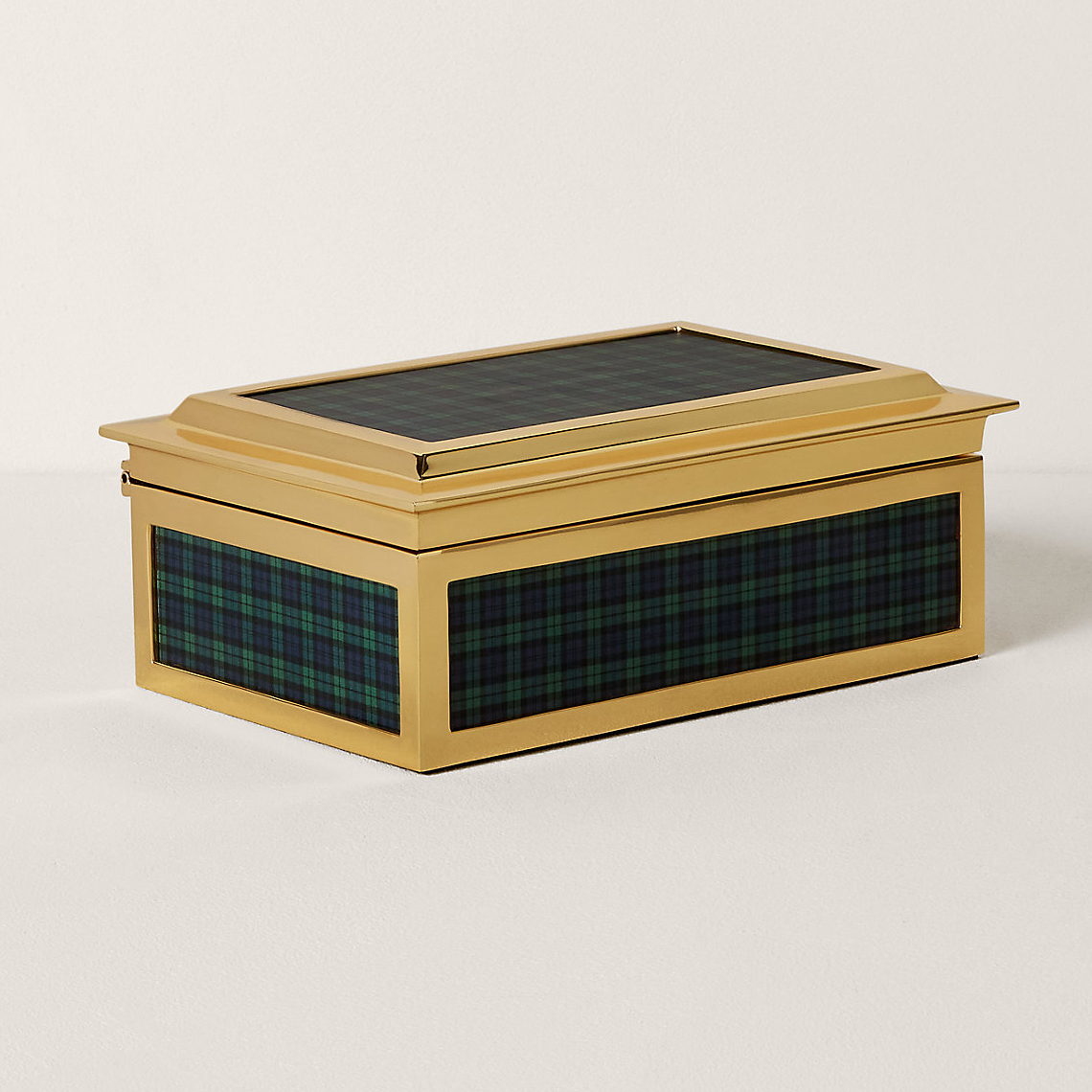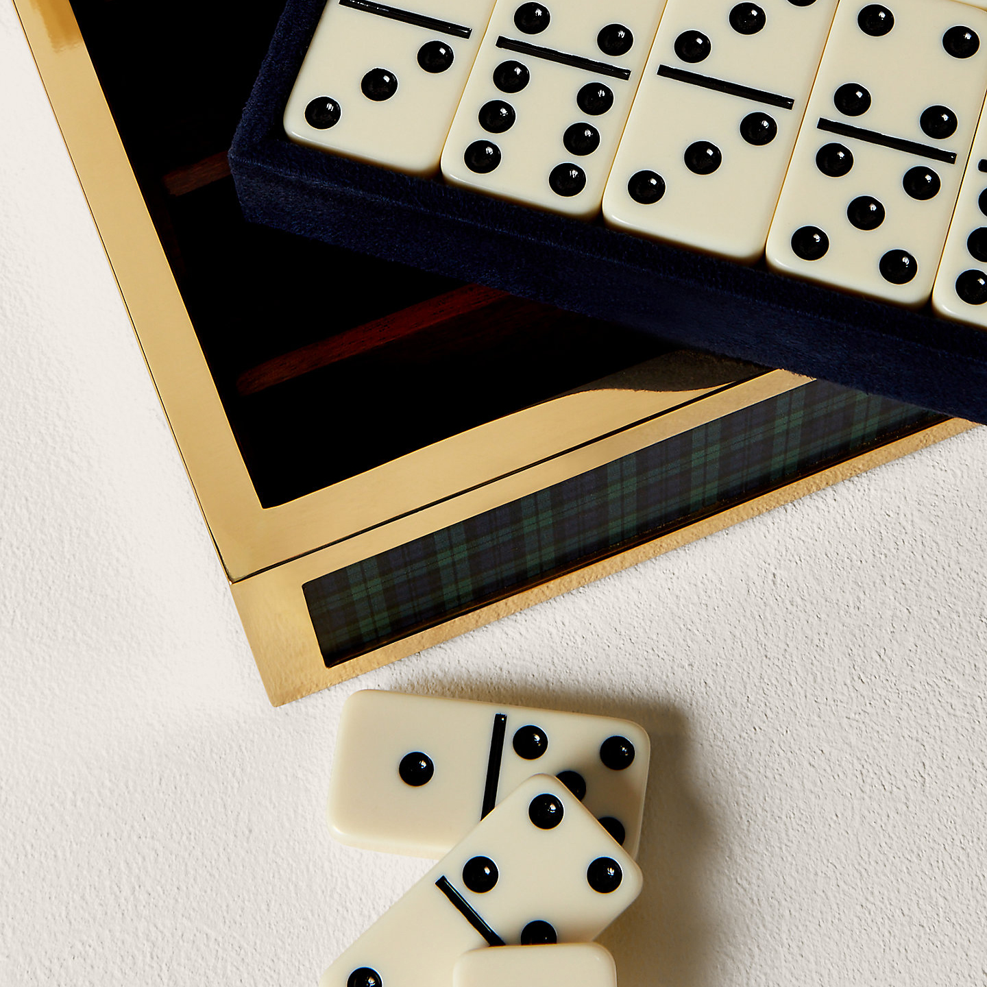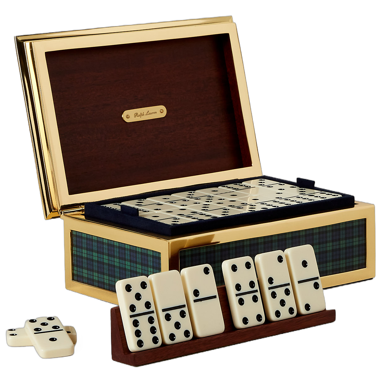 Набор домино Ferren помещен в роскошный футляр, изготовленный из цельной латуни и украшенный знаковым узором тартан Ральфа Лорена.