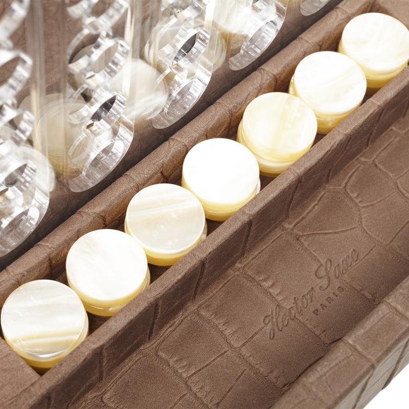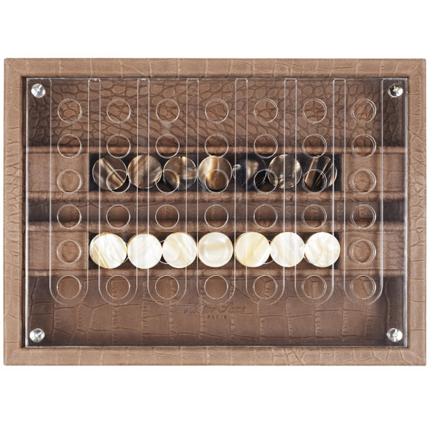 Комплектация:игровое поле, 21х2 перламутровых ацетатных фишек, футляр.