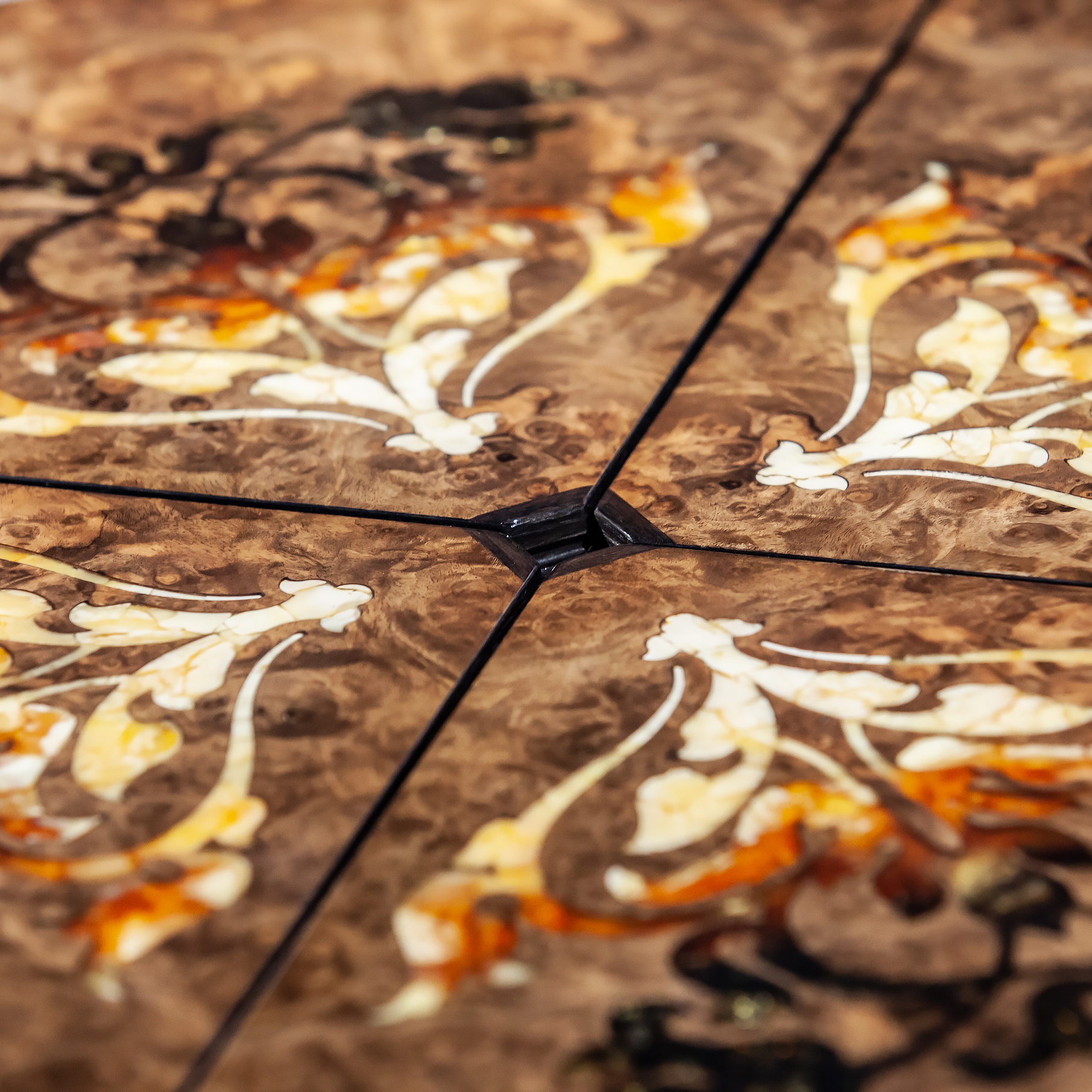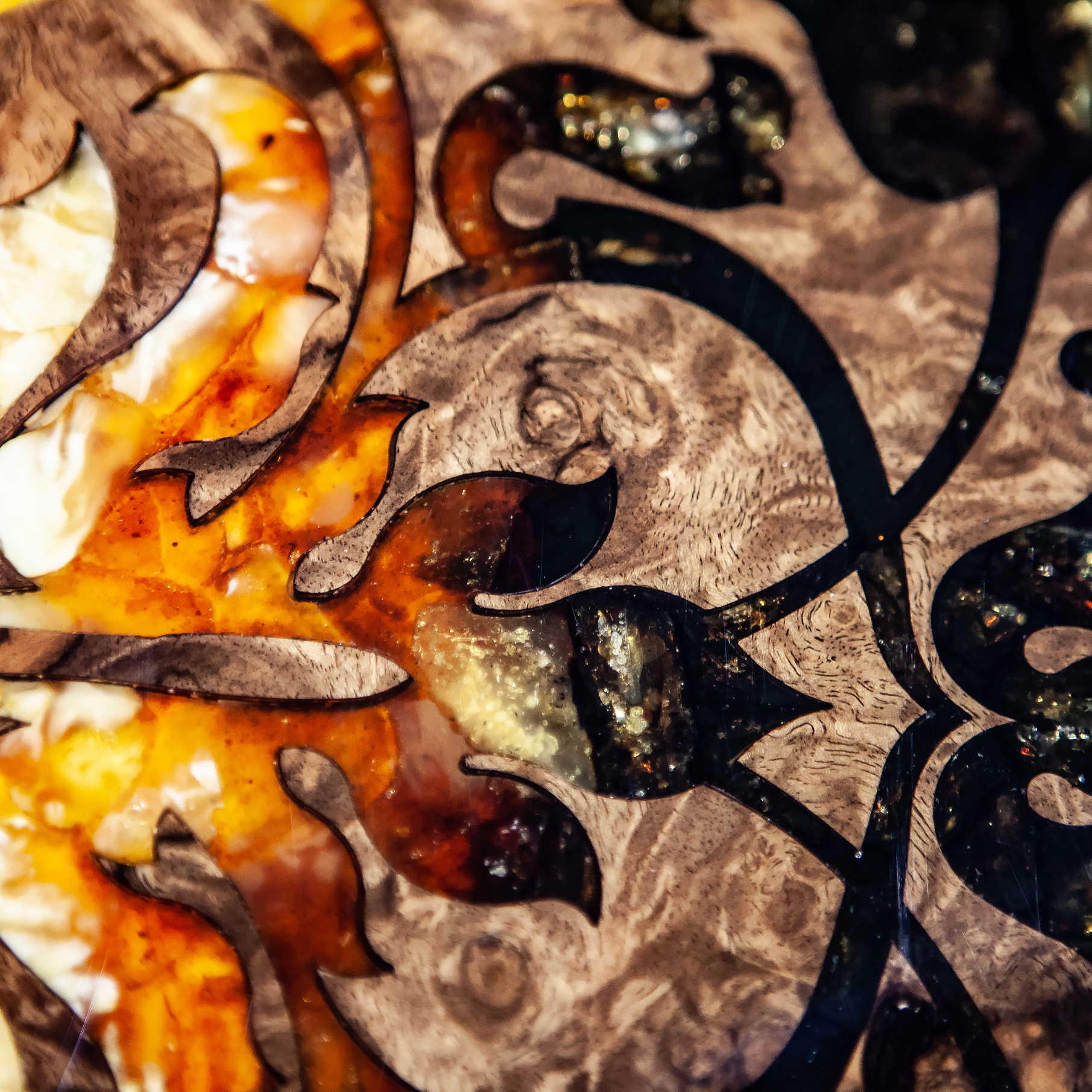 Материалы: корень ореха, дуб тонированный, янтарь.