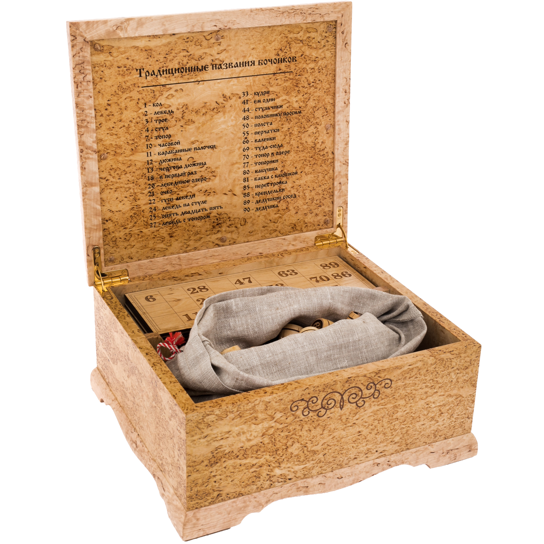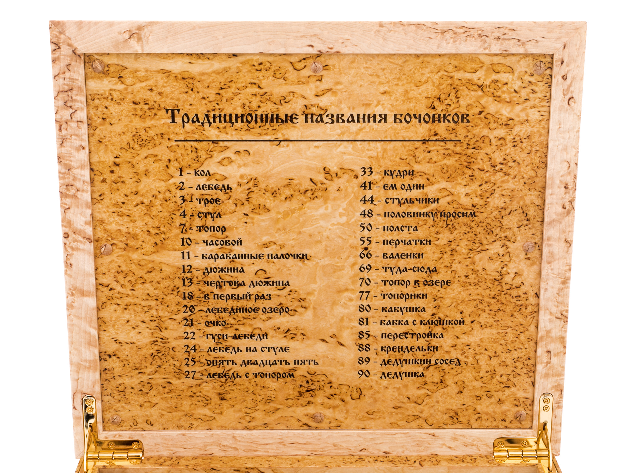 Материалы:игровой набор - карельская береза; короб - джутовый канат, фанера, стальные замки, изнутри обшит карпетом.