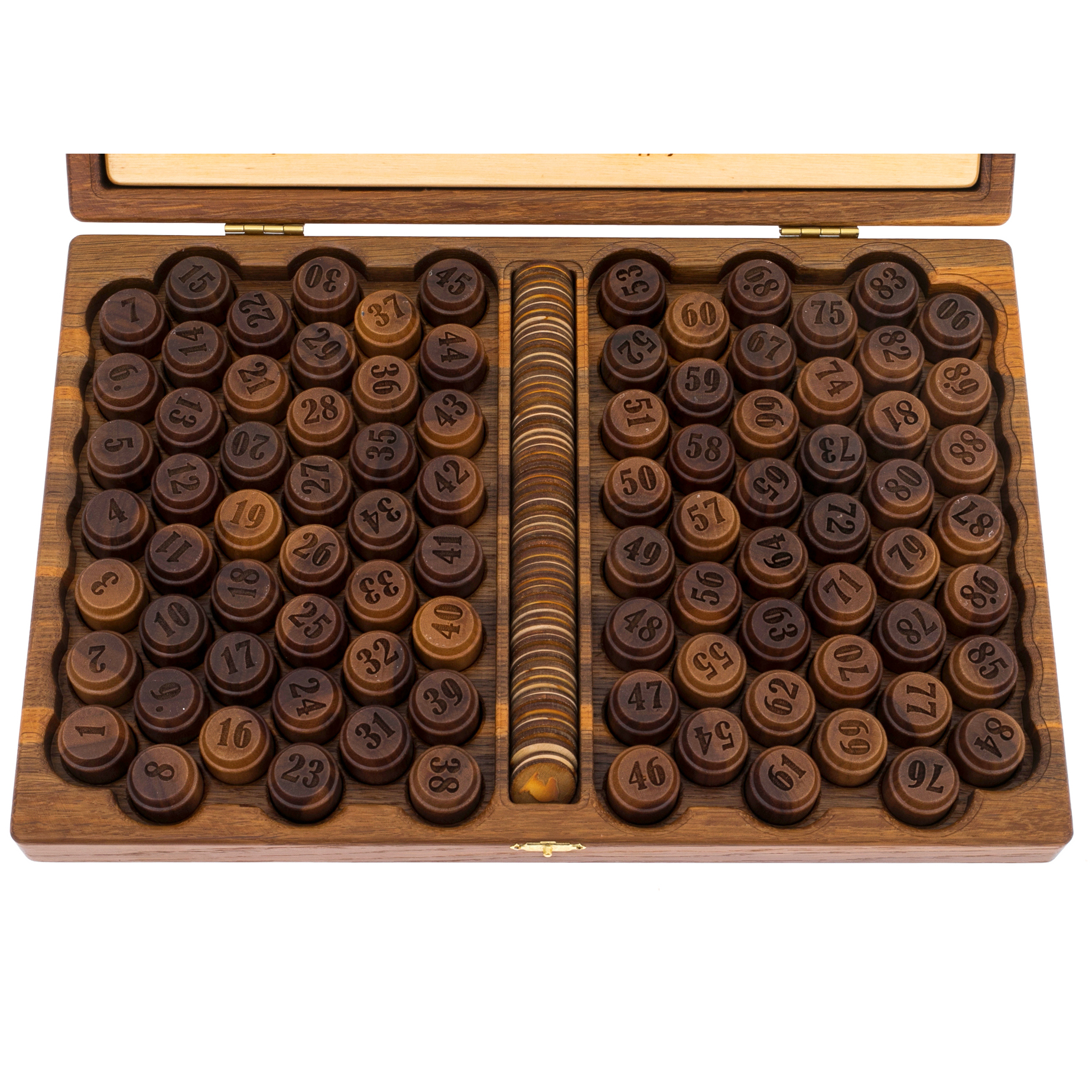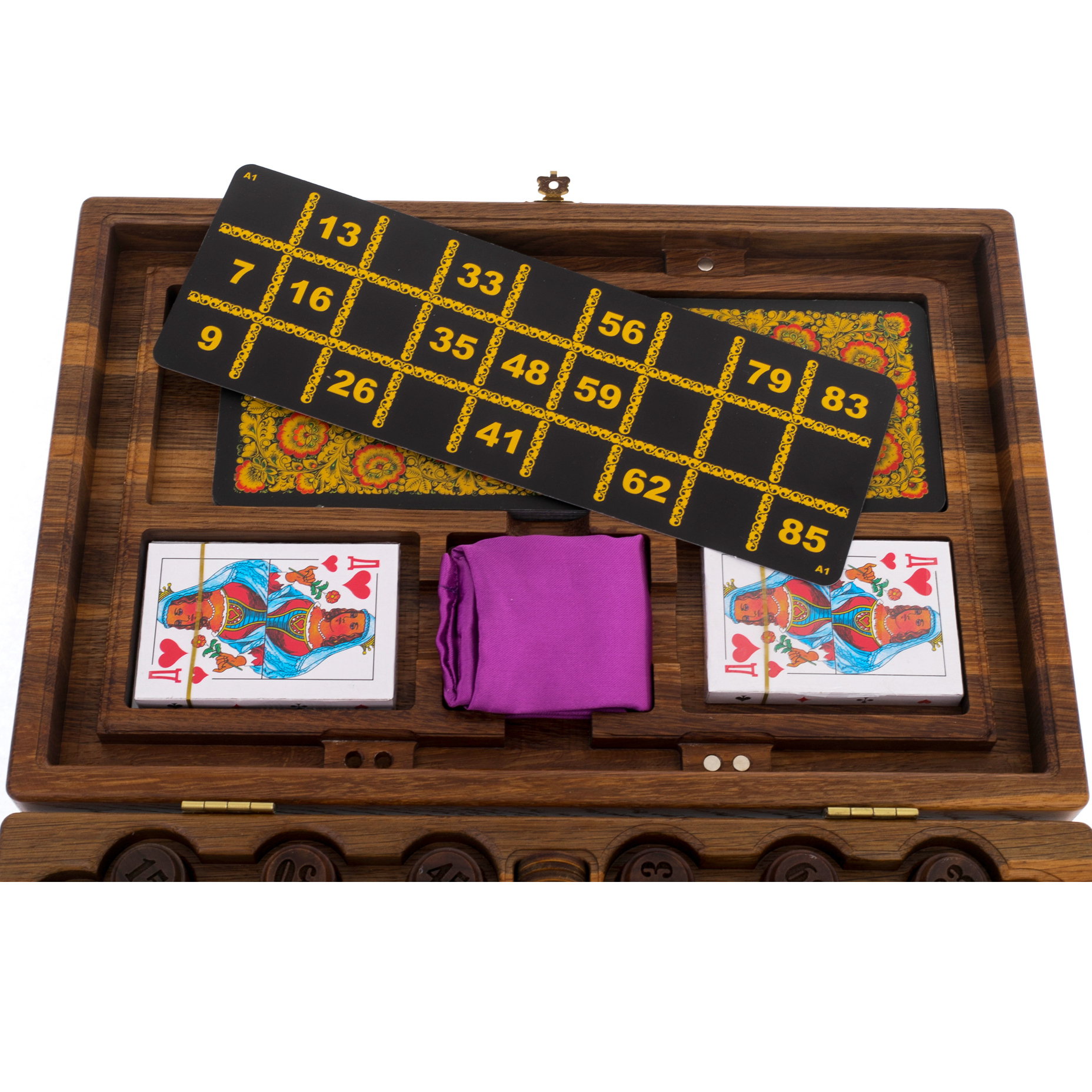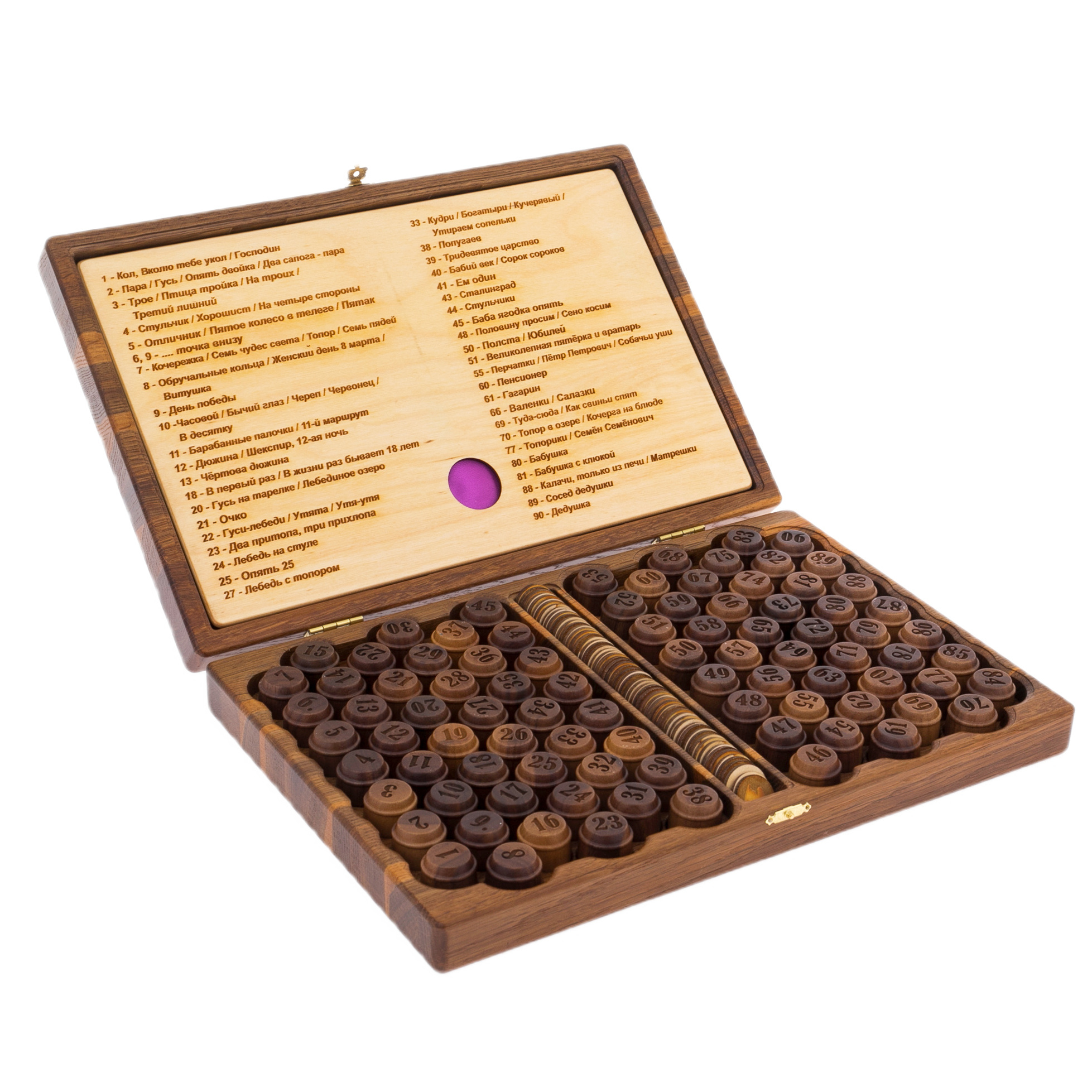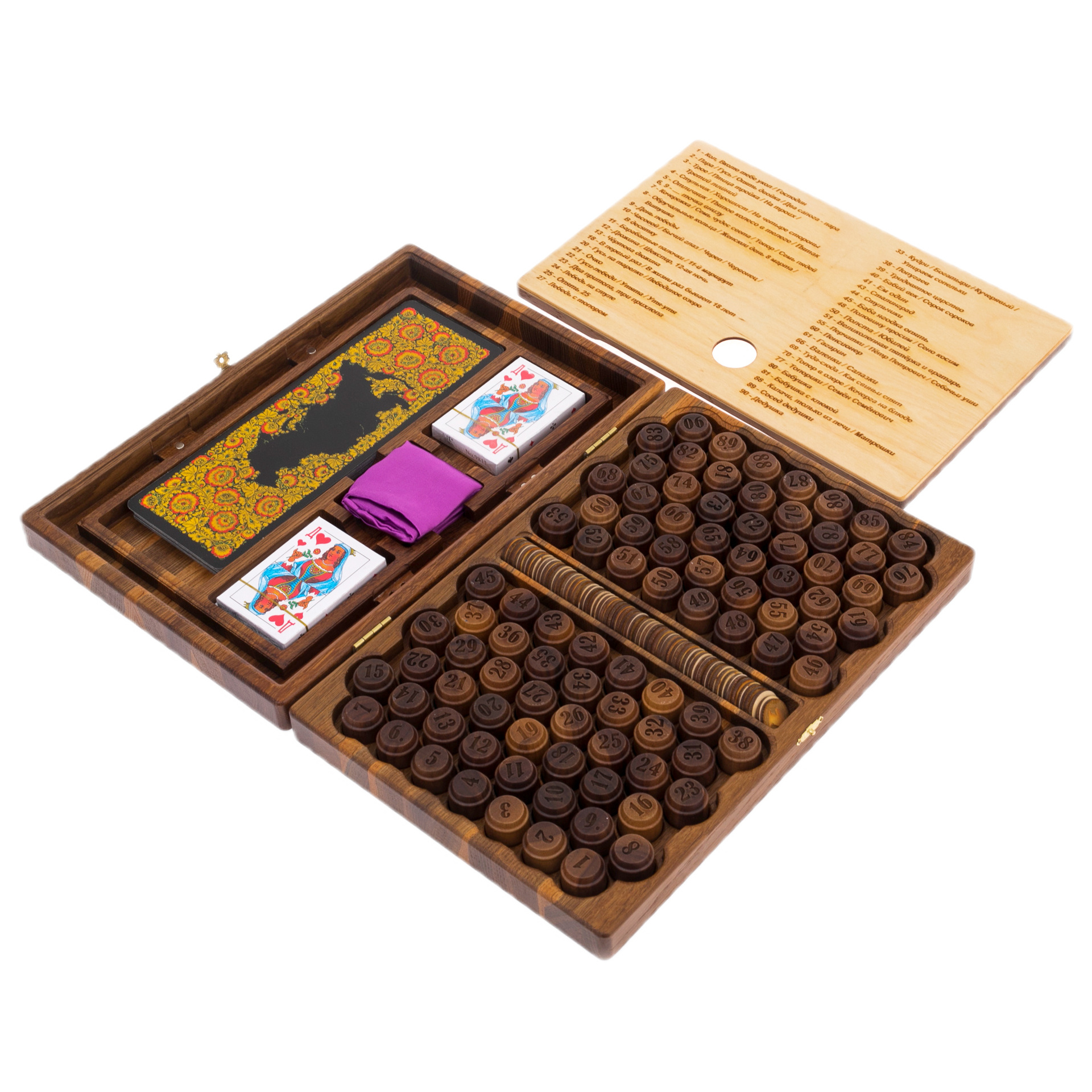 Набор для игры в лото, выполненный из натурального дуба, представляет собой изысканное сочетание функциональности и художественного мастерства, являясь настоящим украшением любого интерьера. Набор включает деревянную шкатулку, фишки, бочонки и карточки, каждый элемент которого выполнен с безупречным вниманием к деталям. Основной фон изделий покрыт утончённой резьбой, переплетающейся с золотыми и чёрными оттенками, придающими набору особую глубину и благородство. Золотистые и чёрные элементы, используемые в росписи, делают набор ещё более привлекательным. Каждый элемент набора, будь то изящный узор на фишках или утончённые детали шкатулки, выполнен с безупречным вниманием к деталям, демонстрируя высочайший уровень мастерства.