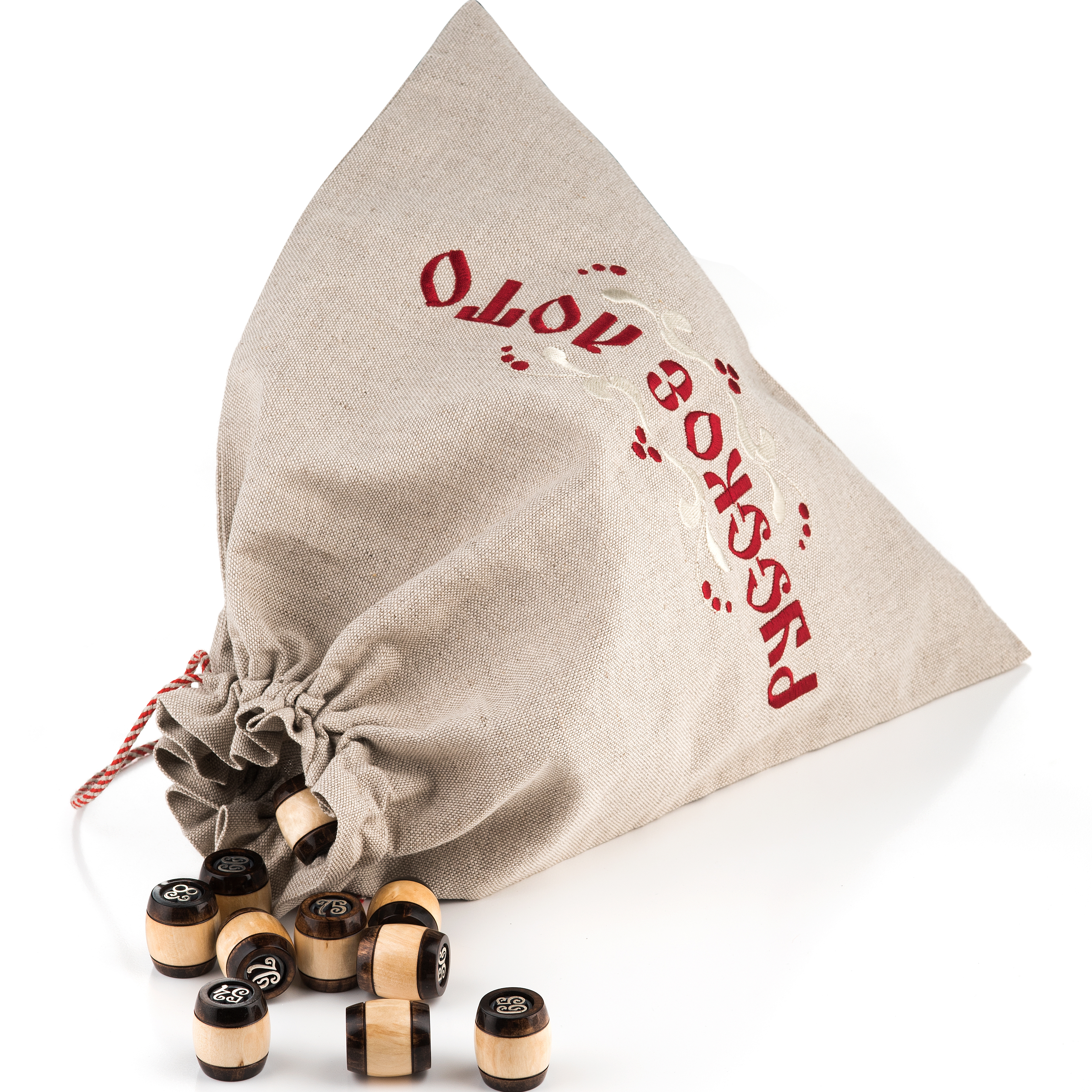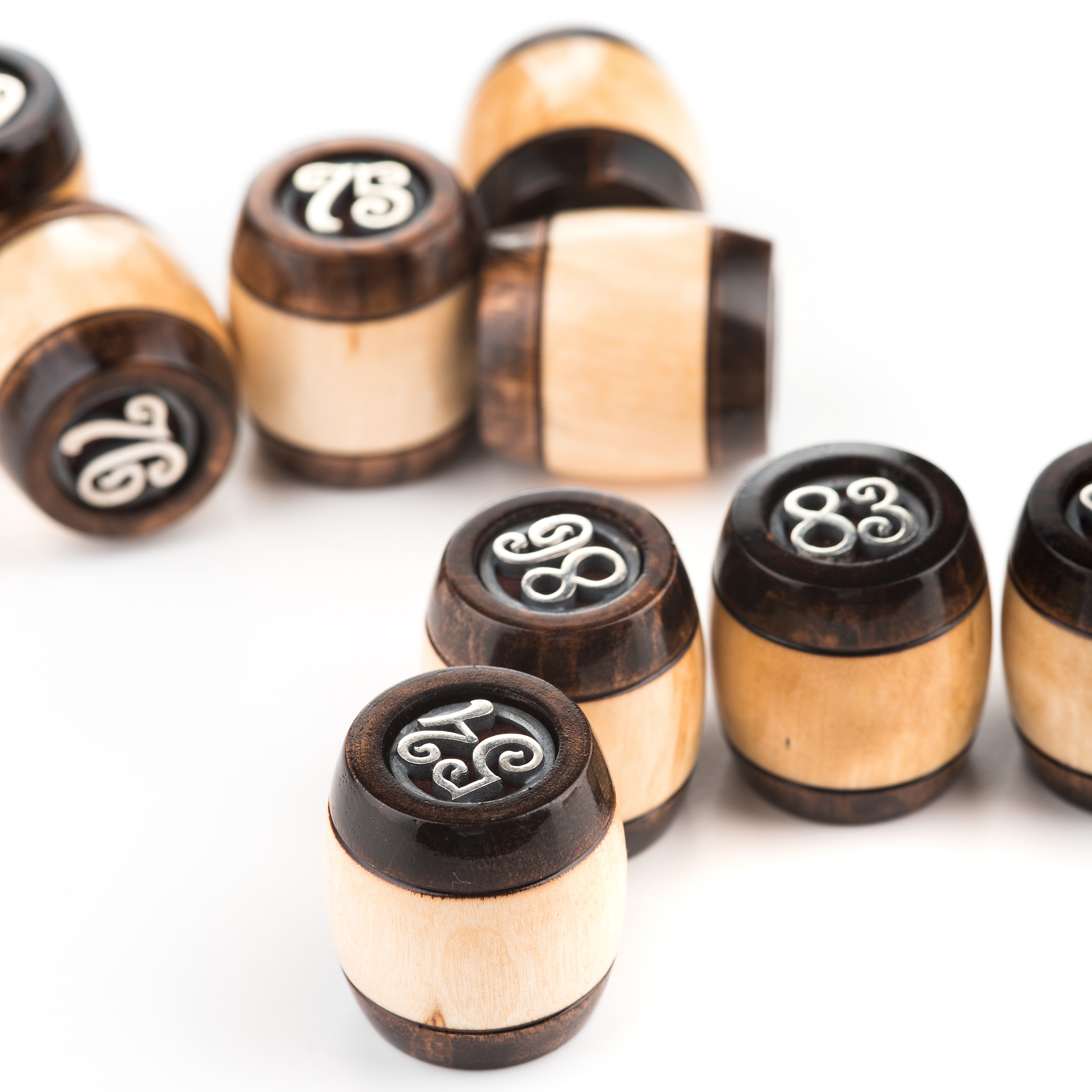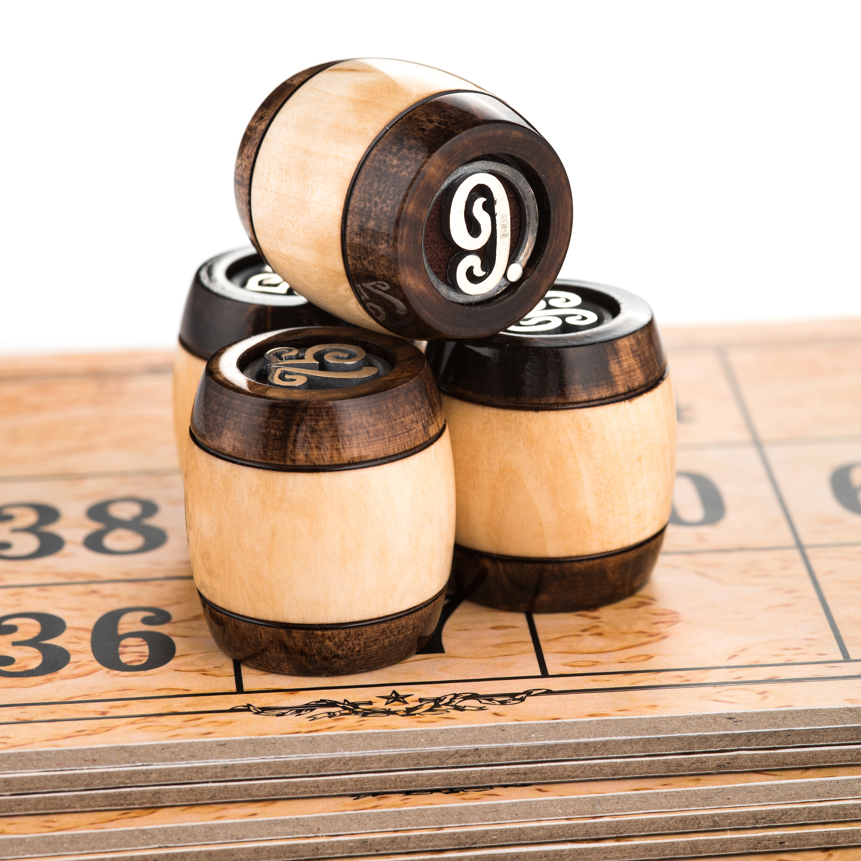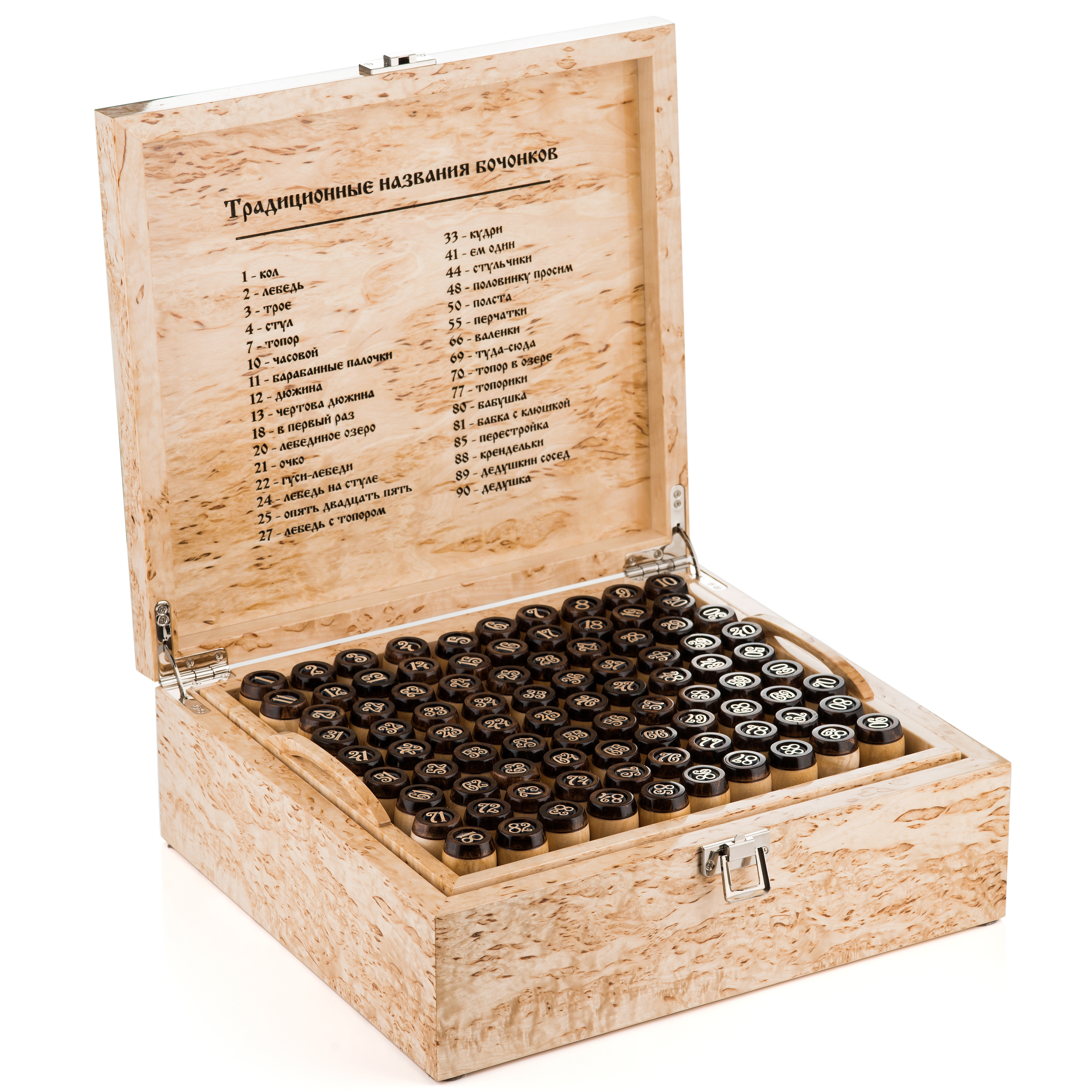 - бочонки из массива карельской березы (90 штук), с серебряными цифрами на торцах от 1 до 90