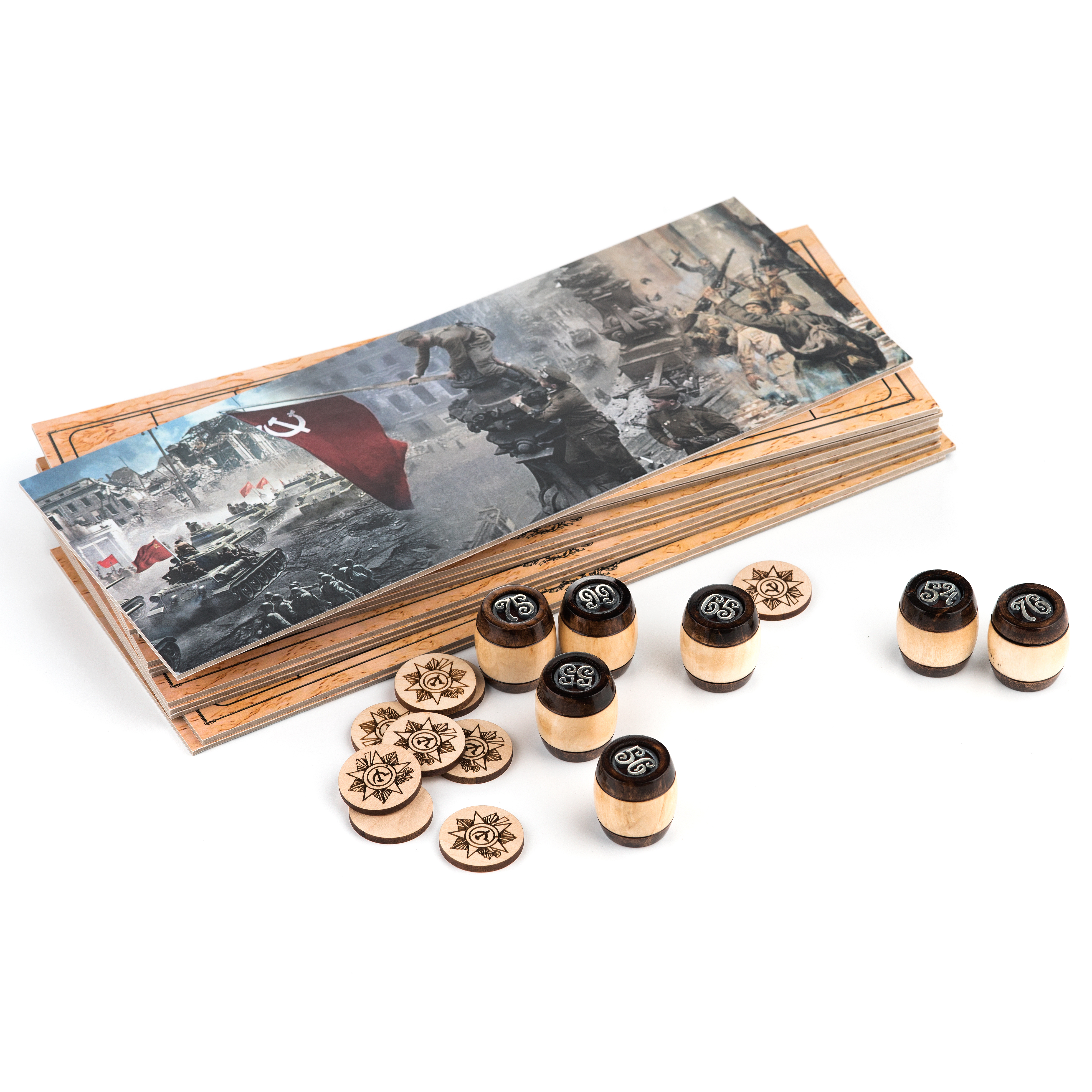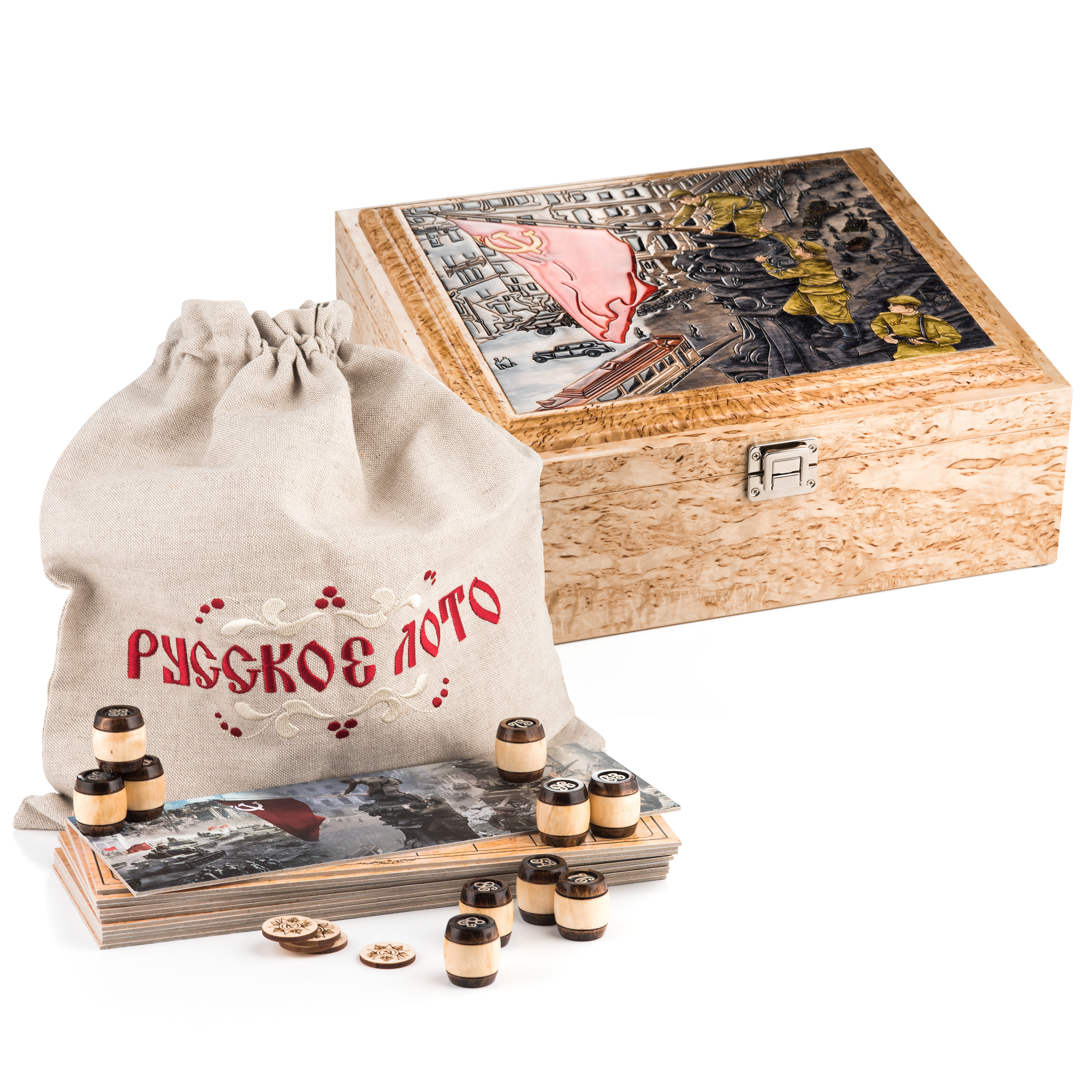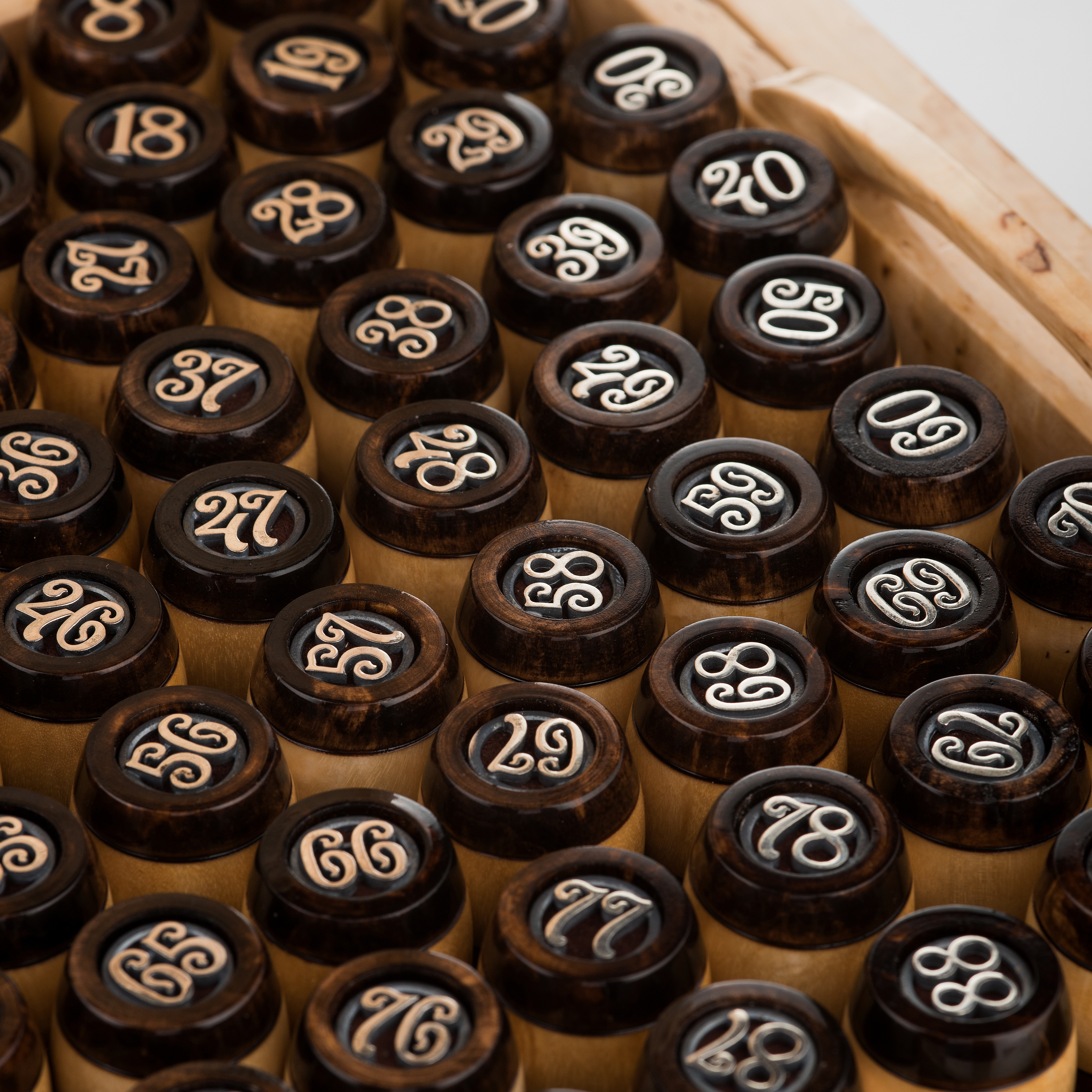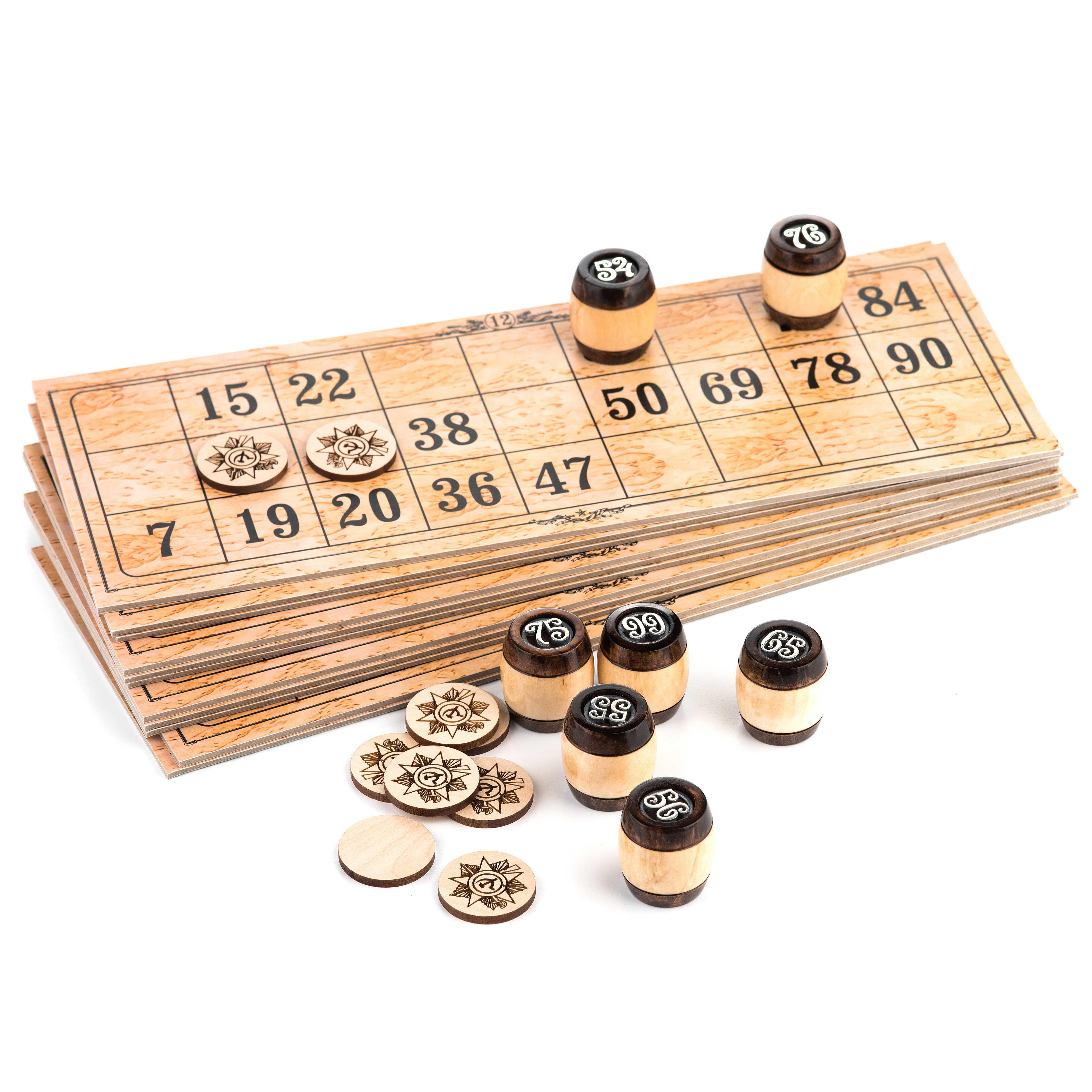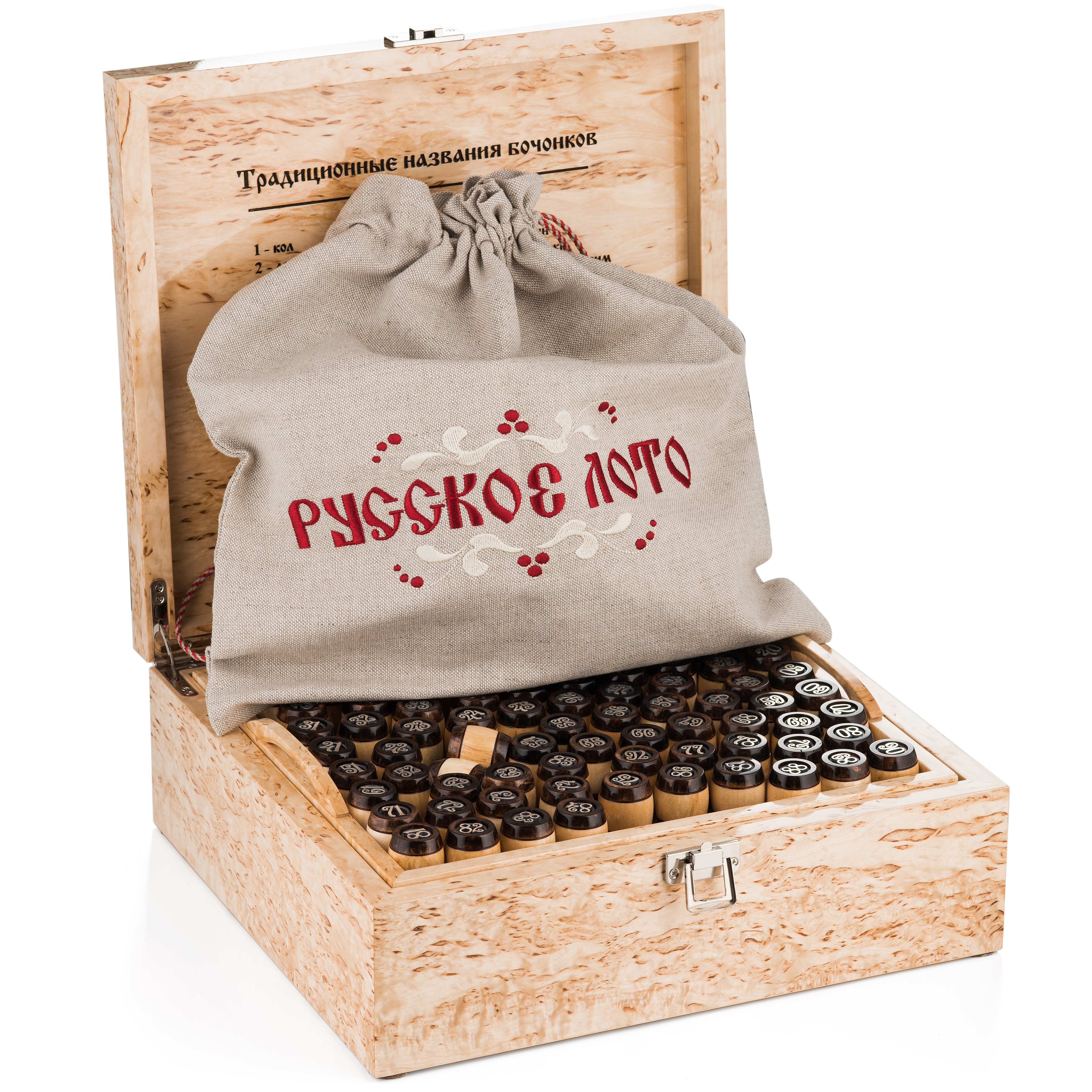 - бочонки из массива карельской березы (90 штук), с серебряными цифрами на торцах от 1 до 90