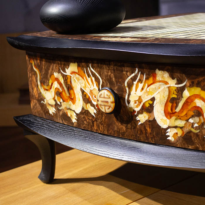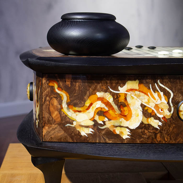 Столик из корня ореха и мореного дуба, инкрустированный янтарем, не только создаст идеальные условия для игры, но и станет центральным элементом интерьера вашего дома или офиса. Янтарные драконы на доске вдохновят вас на новые свершения, а благородные материалы обеспечат долговечность и надежность использования.