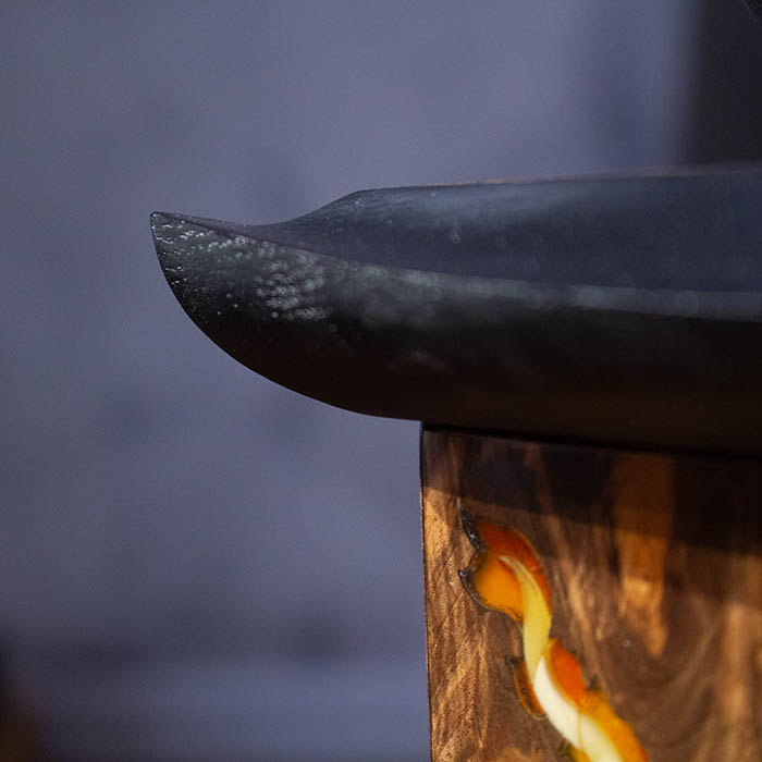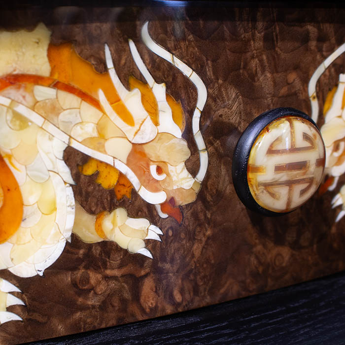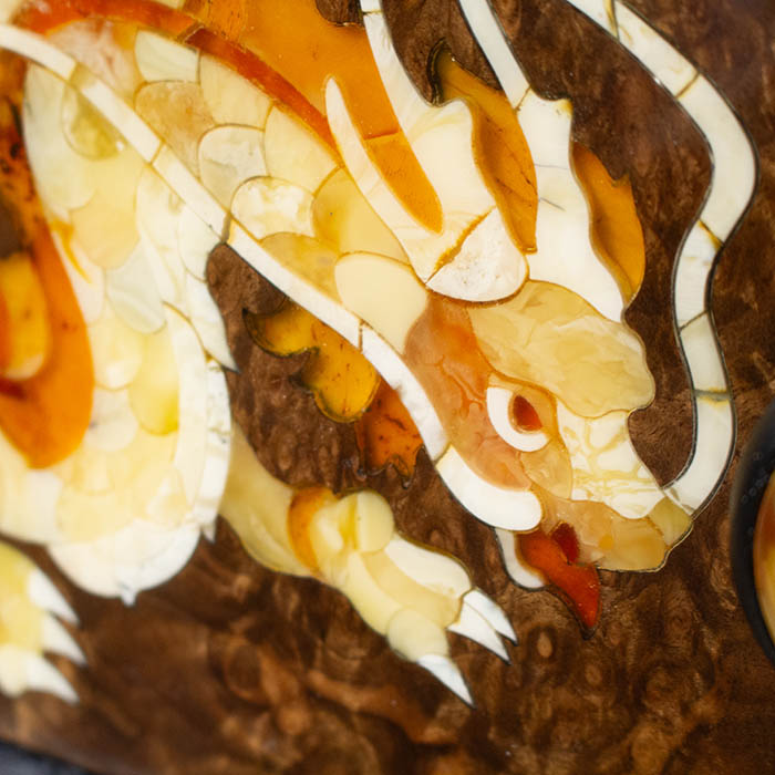 Особое внимание привлекает инкрустация янтарем, из которого выложена доска для игры и изображение двух несущихся друг навстречу другу огненных драконов. Янтарь, символизирующий солнечную энергию и магическую силу, придает изделию особые теплоту и свет. Огненные драконы, изображенные в динамике, олицетворяют мощь и благородство, вдохновляя на стратегические победы и покорение новых вершин.