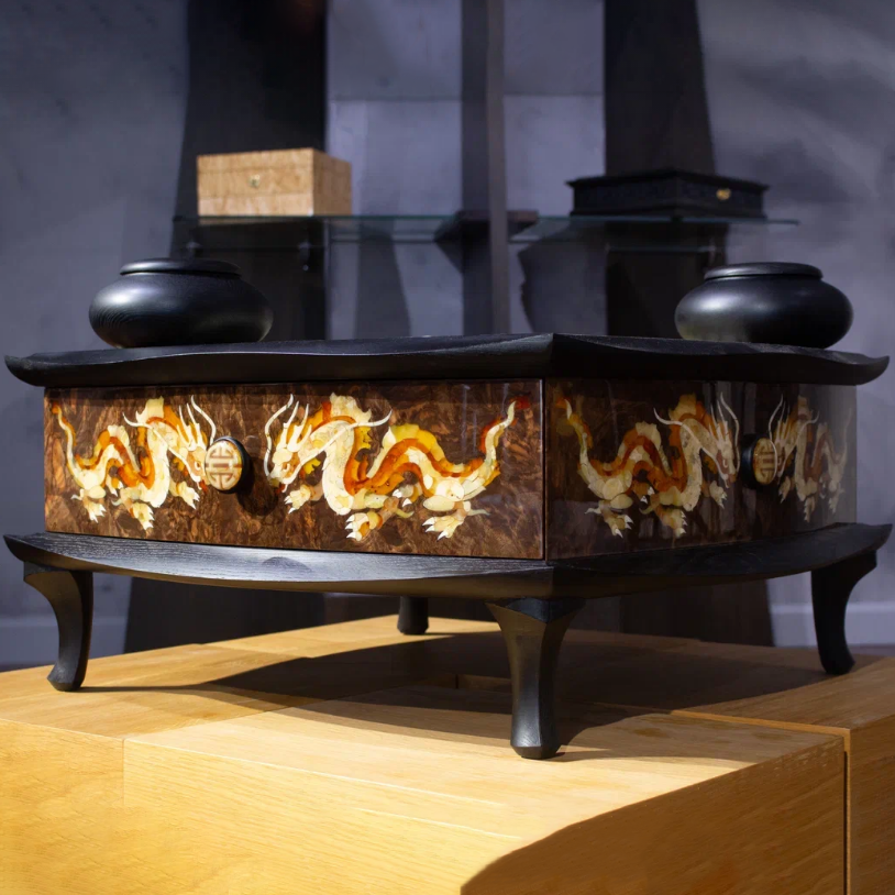 Столик, являющийся основой набора "Восточный дракон", выполнен из тщательно отобранных материалов, представляющих собой комбинацию корня ореха и мореного дуба. Эти ценные породы древесины символизируют силу и долголетие, объединяя в себе традиции древности и современность. Мастерски обработанный и отполированный до зеркального блеска, столик поражает своей естественной красотой и изысканностью линий.