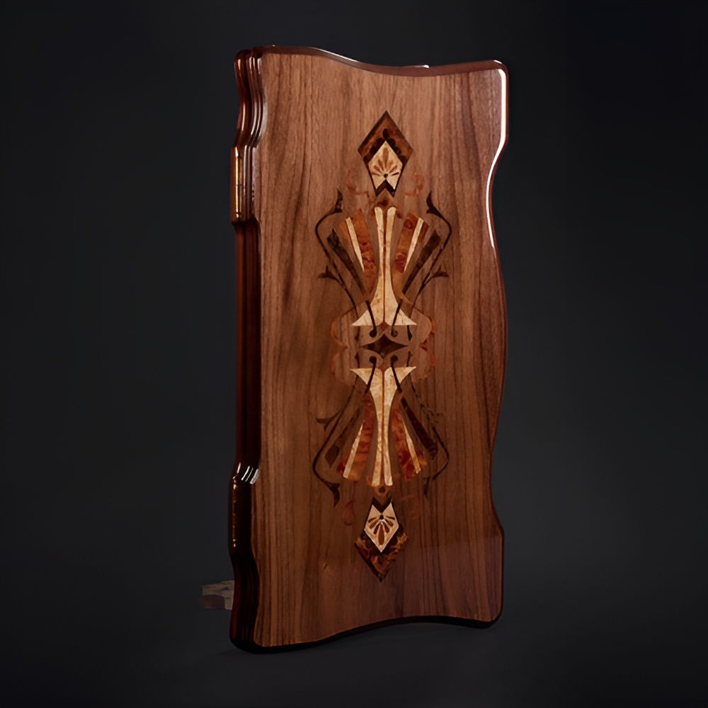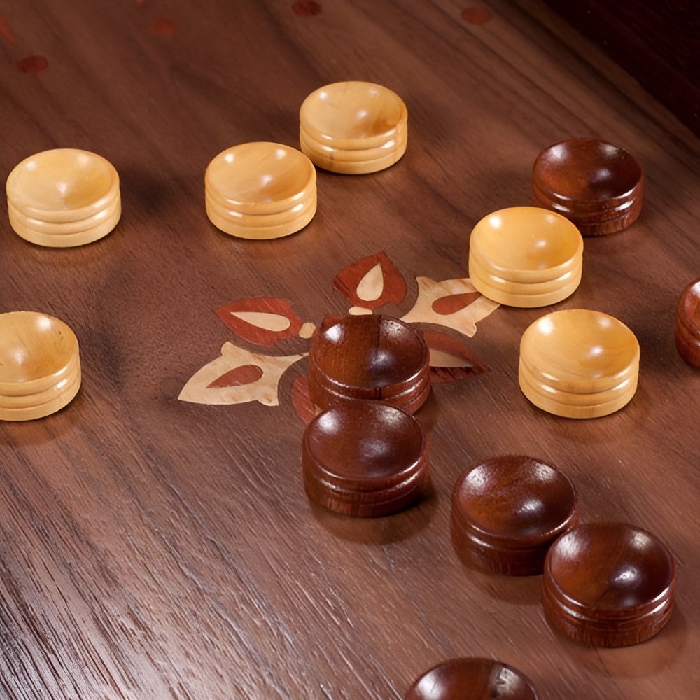 Материалы:корпус - орех, рояльный лак, рисунок в технике маркетри (мозаика); лицевая сторона - орех, карельская береза, корень ореха, красное дерево, корень камфоры; поле внутри - орех, бубинга, клен птичий глаз, корень камфоры; замки - потайные магниты; кейс - массив тонированного ясеня, мягкий ложемент; шашки светлые - колхидский самшит, темные - красное дерево, подклеены замшей; кубики - обсидиан.