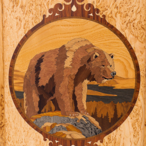 На внешней стороне игровой доски — мозаичное панно из янтаря с изображением волка. Игровое поле выдержано в том же стиле и дополнено волчьими следами. Каждый камень янтарной мозаики подобран по цвету, размеру и рисунку и гармонично смотрится на темном фоне. Игра света в кусочках янтаря создает ощущение движения — кажется, что дикий зверь замер лишь на мгновение, но в любой момент готов к прыжку. Благодаря потрясающей реалистичности мозаика напоминает картину, написанную с натуры.