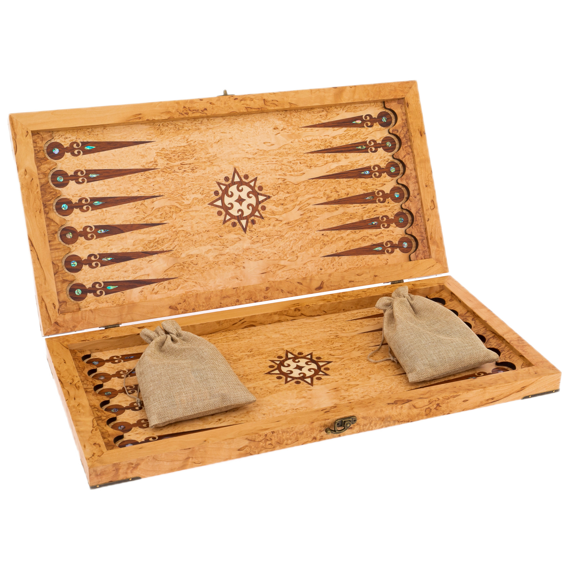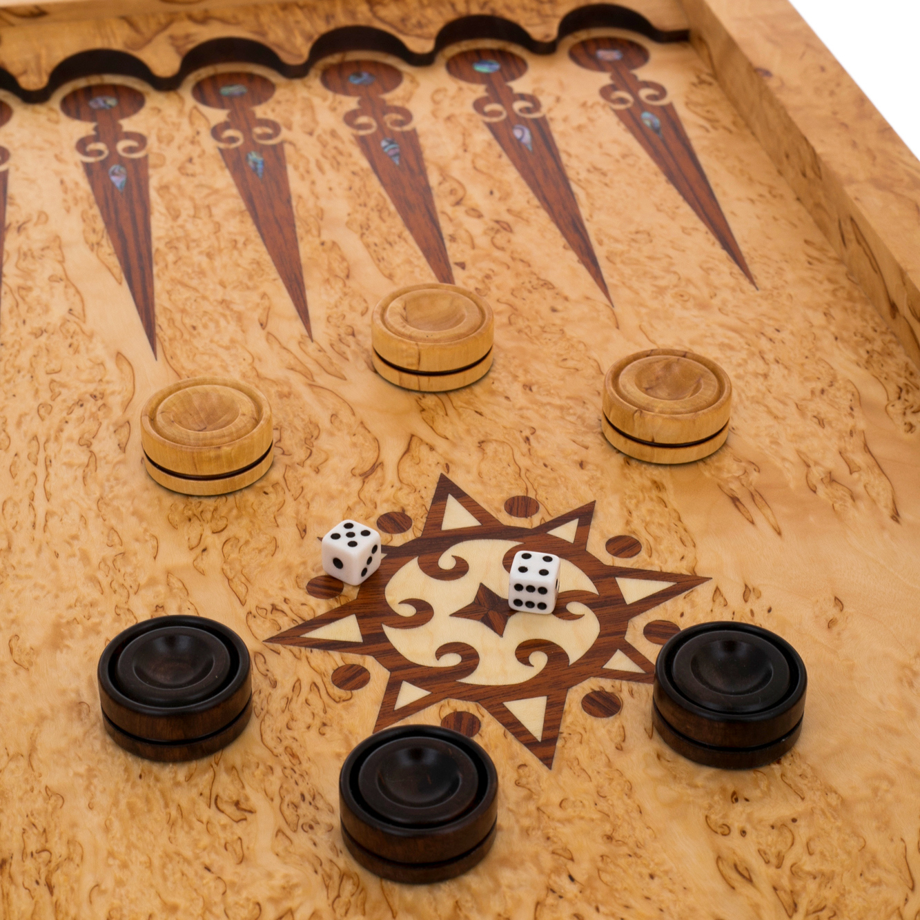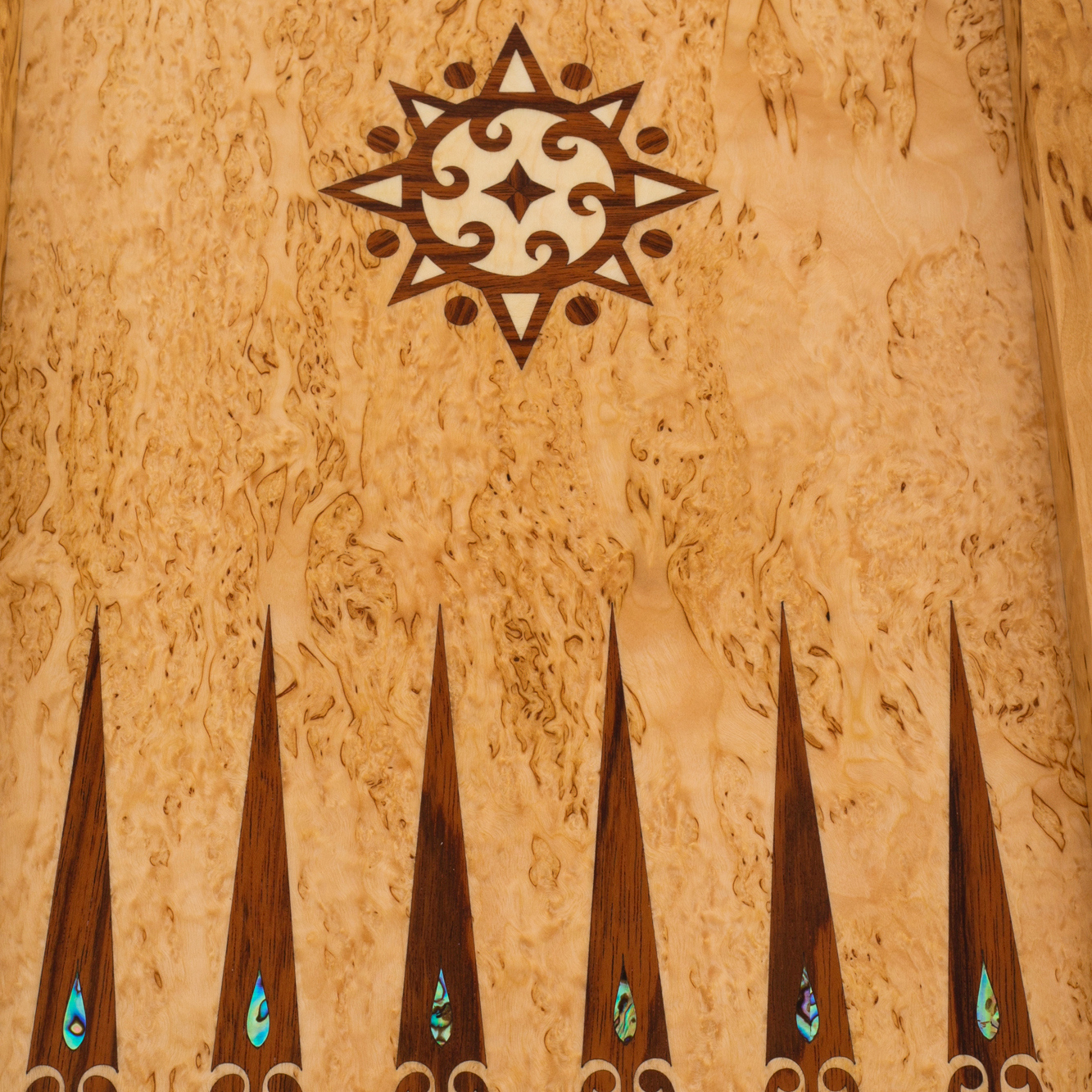 Нардовая доска «Жемчужина востока» выполнена из древесины "Огненное перо", которая обладает уникальной текстурой и относится эксклюзивным материалам для декоративной отделки высокохудожественных изделий.