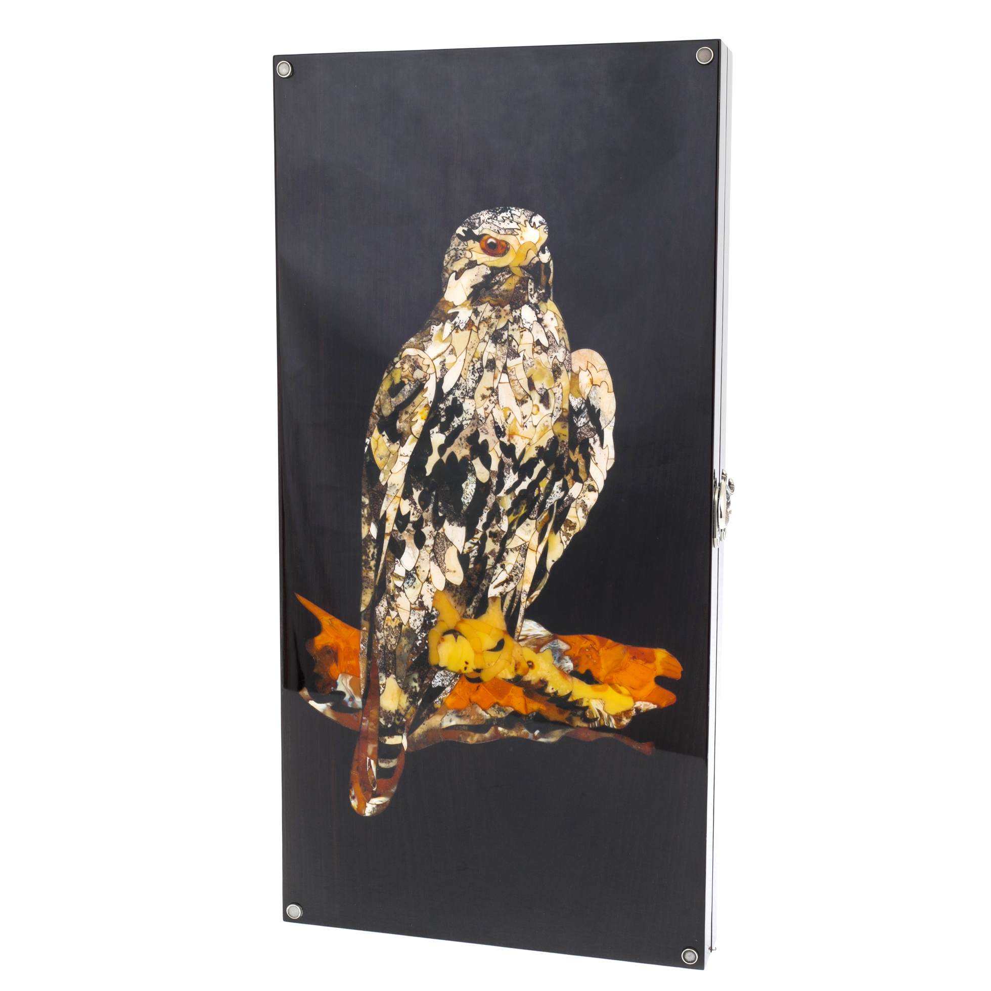 Нарды «Арабский сокол» — это не просто игра, а художественный артефакт, сочетающий в себе роскошь, символику и природное богатство. Крышка оформлена мозаичным изображением сокола, выложенным из натурального янтаря, чьи оттенки варьируются от светлого меда до насыщенного коньяка. Сокол — знак благородства, чести и силы — воплощён с филигранной точностью, создавая образ, достойный коллекции восточных правителей. Внутри — игровое поле из ценного дерева, инкрустированное янтарными стрелами и вставками из светлого рога. Каждая деталь — фишки, кубики, орнамент — выполнена вручную и завершает общую симфонию восточной эстетики.