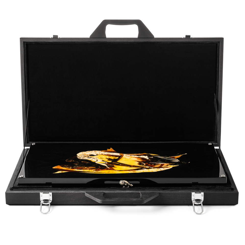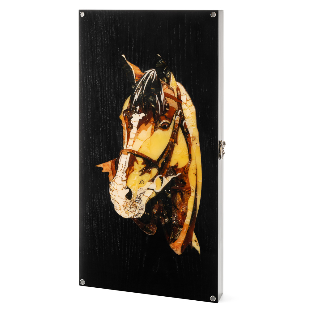 На внешней стороне игровой доски — мозаичное панно из янтаря с изображением волка. Игровое поле выдержано в том же стиле и дополнено волчьими следами. Каждый камень янтарной мозаики подобран по цвету, размеру и рисунку и гармонично смотрится на темном фоне. Игра света в кусочках янтаря создает ощущение движения — кажется, что дикий зверь замер лишь на мгновение, но в любой момент готов к прыжку. Благодаря потрясающей реалистичности мозаика напоминает картину, написанную с натуры.