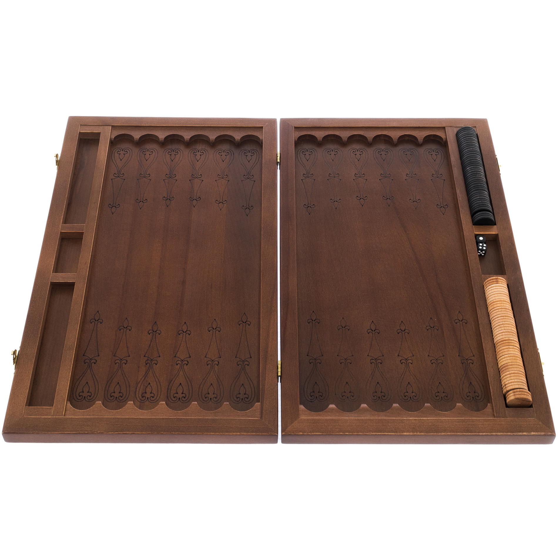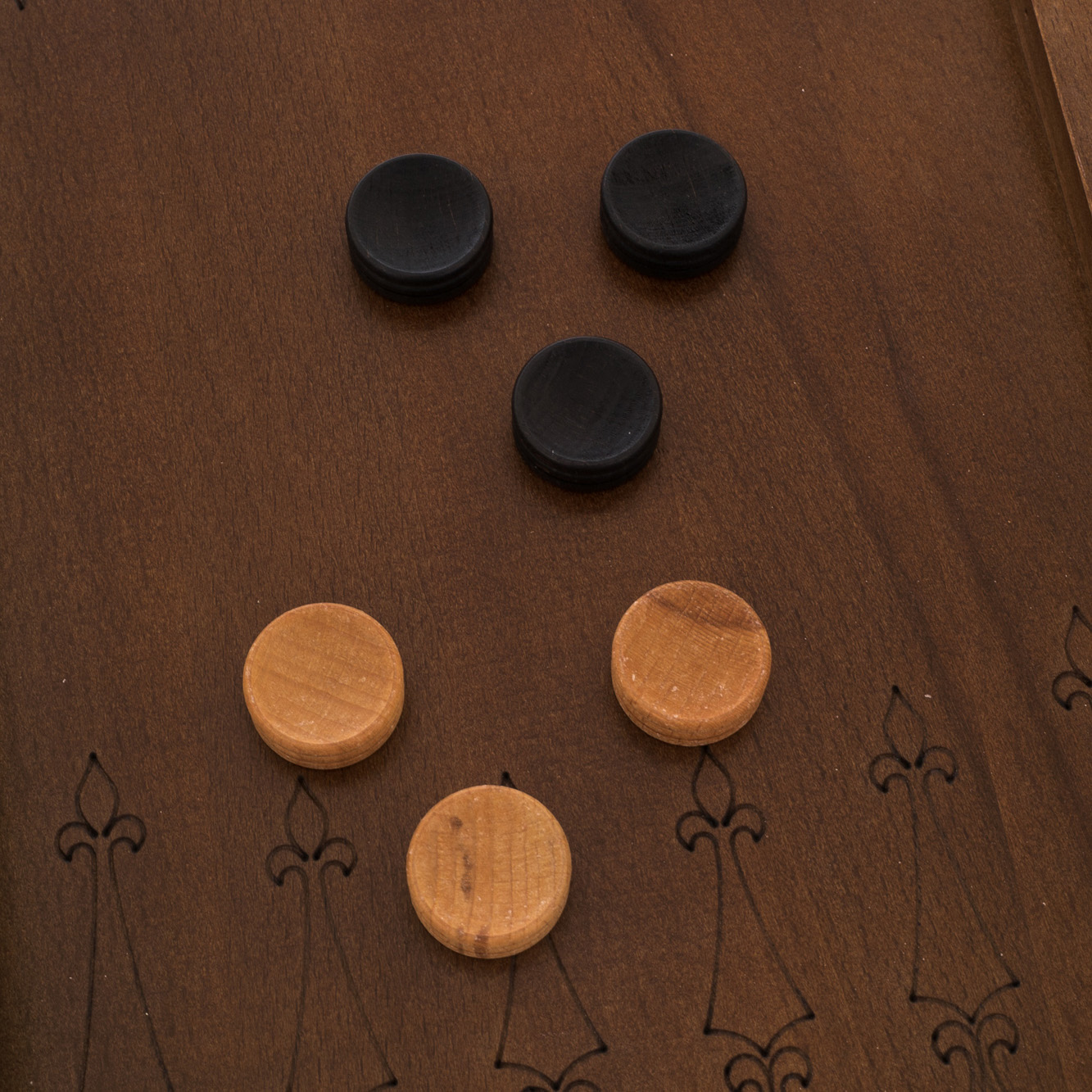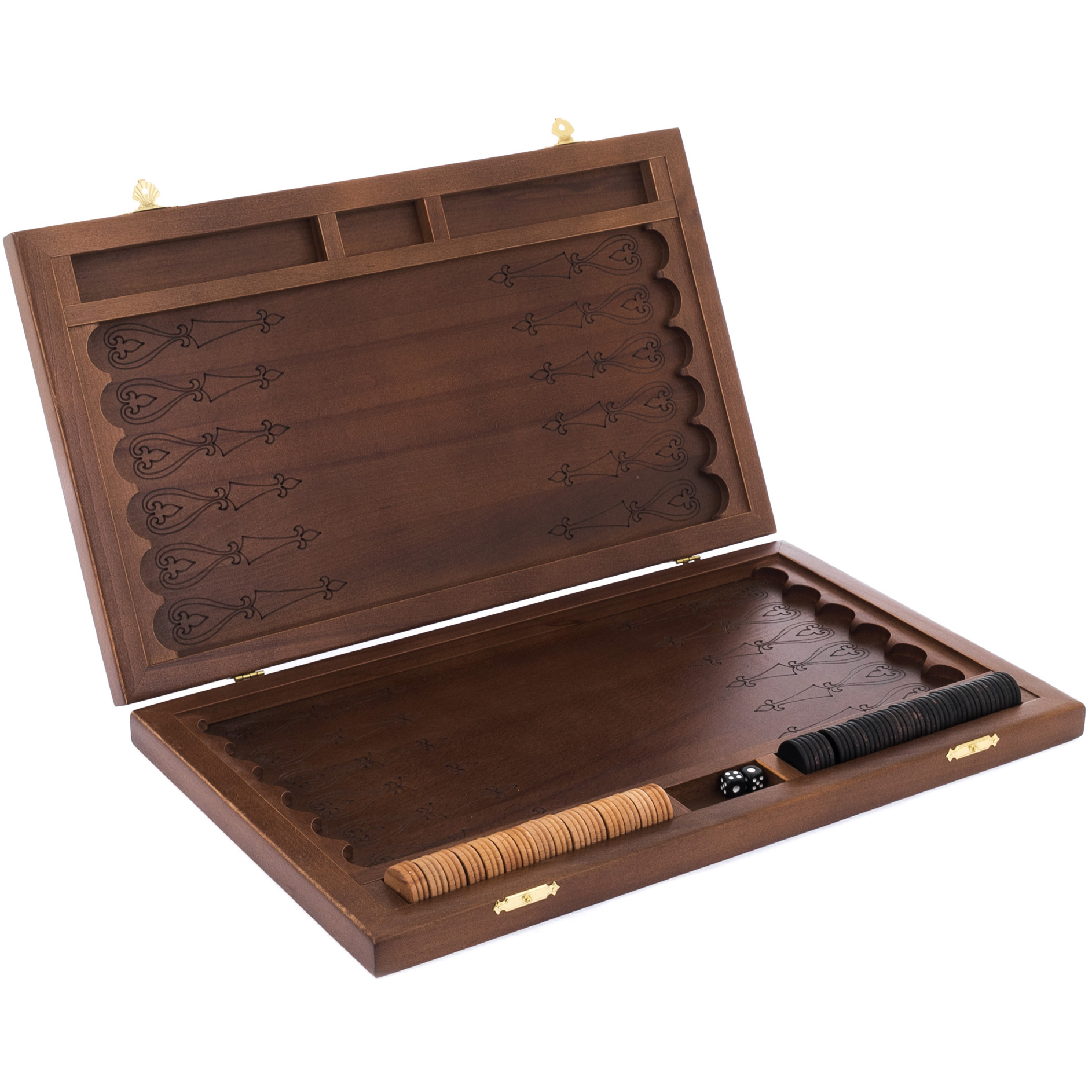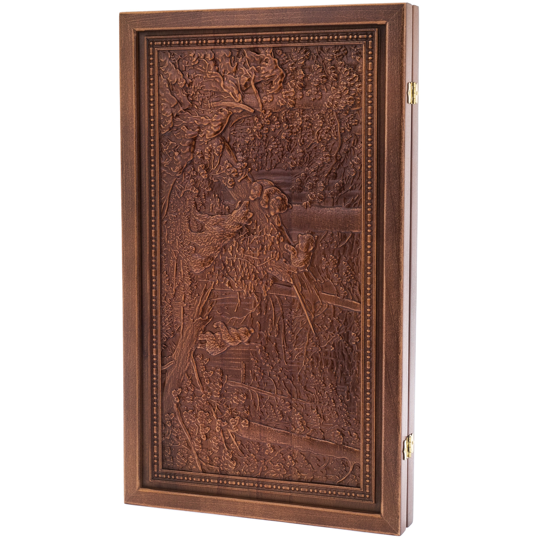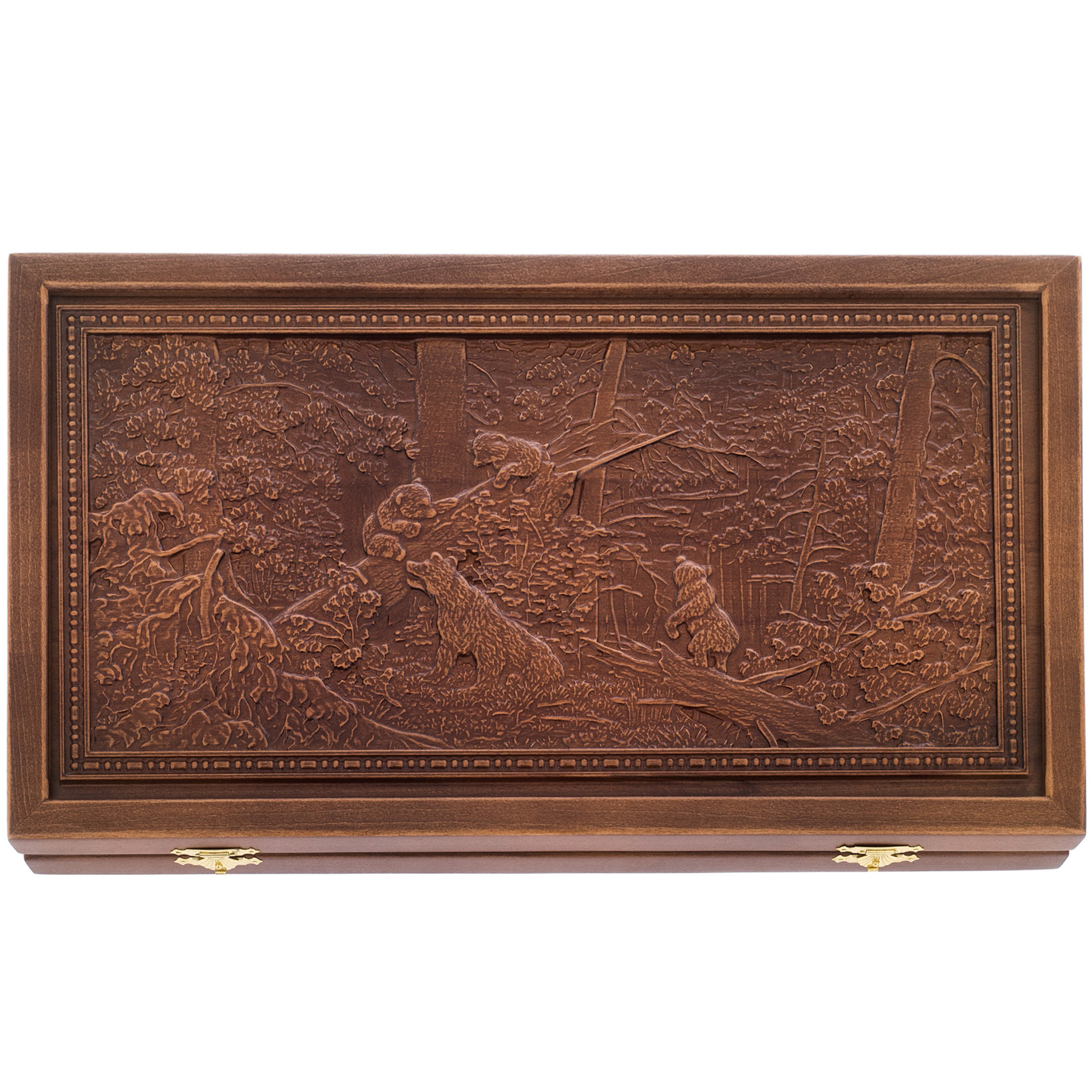Данные нарды "Мишки в лесу" изготавливаются на нашем производстве из массива бука. Для придания эффекта благородной старины данная серия нард обрабатывается декоративной патиной. Лицевая сторона украшена резьбой. Доска соответствует всем требованиям профессионалов и любителей игры в нарды: деревянные фишки диаметром 29 мм имеют комфортные для захвата углубления по центру, удобные ячейки (лузы), ложемент для хранения фишек и костей по краю игрового полотна. В комплект входят фишки и зары.