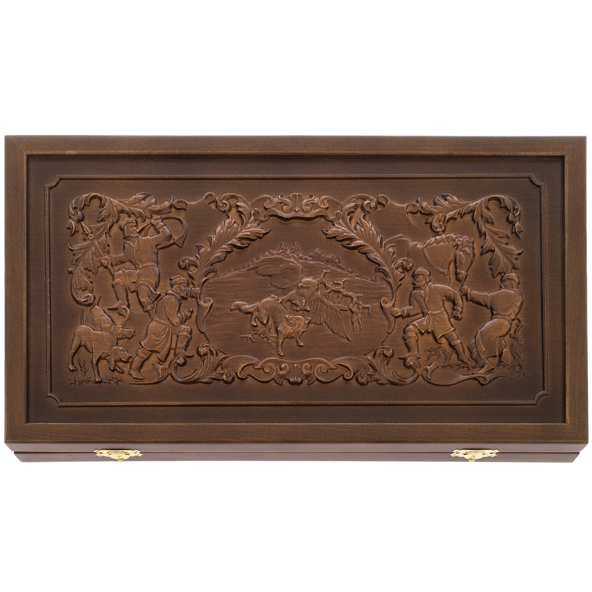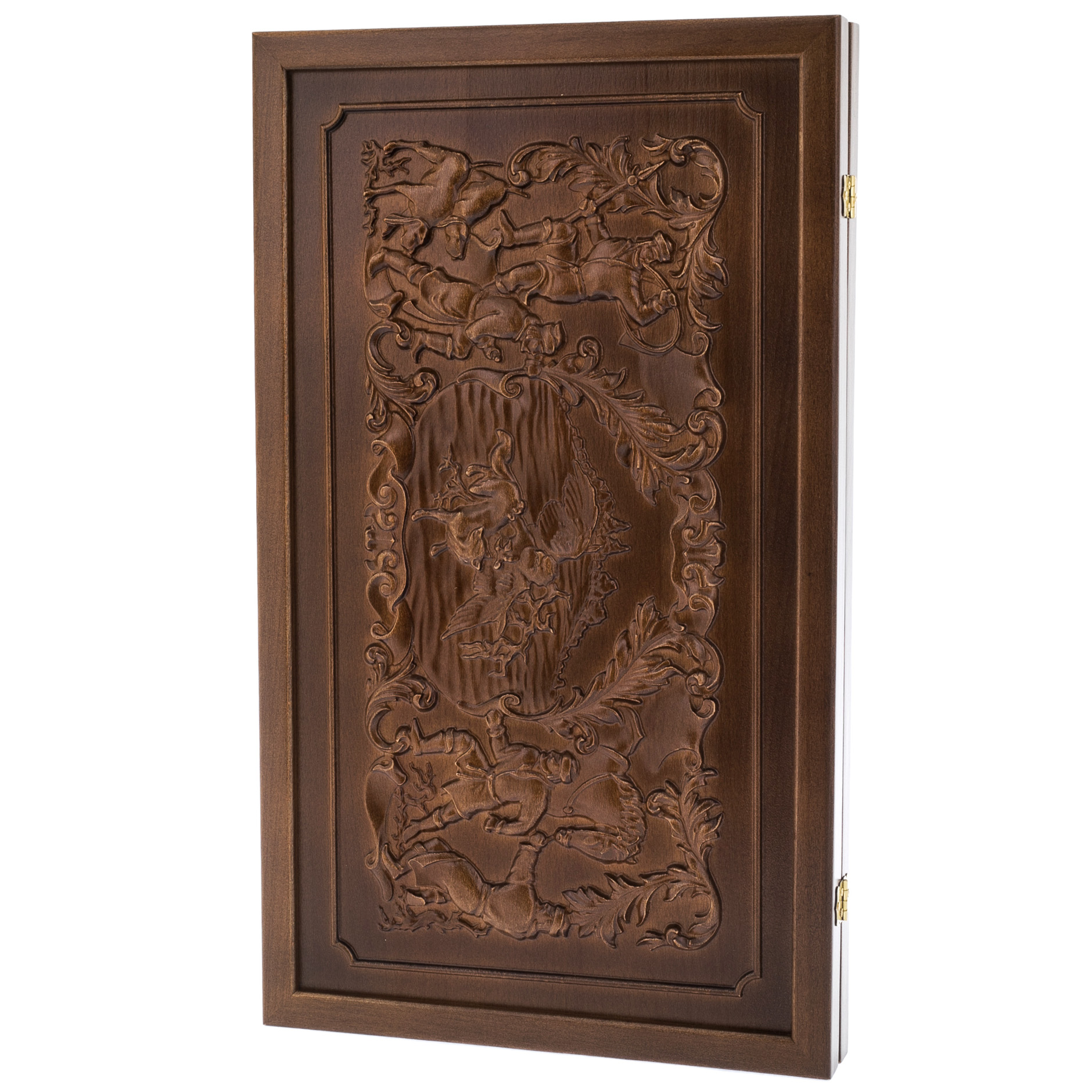 Нарды «Соколиная охота» "рассказывают" о красивом охотничьем обряде с участием прирученных птиц. Эти нарды изготовлены из массива патинированного бука. Лицевая сторона украшена резьбой с изображением фрагмента охоты. Доска соответствует всем требованиям профессионалов и любителей игры в нарды: деревянные фишки диаметром 29 мм имеют комфортные для захвата углубления по центру, удобные ячейки (лузы), ложемент для хранения фишек и костей по краю игрового полотна. В комплект входят фишки и зары.
