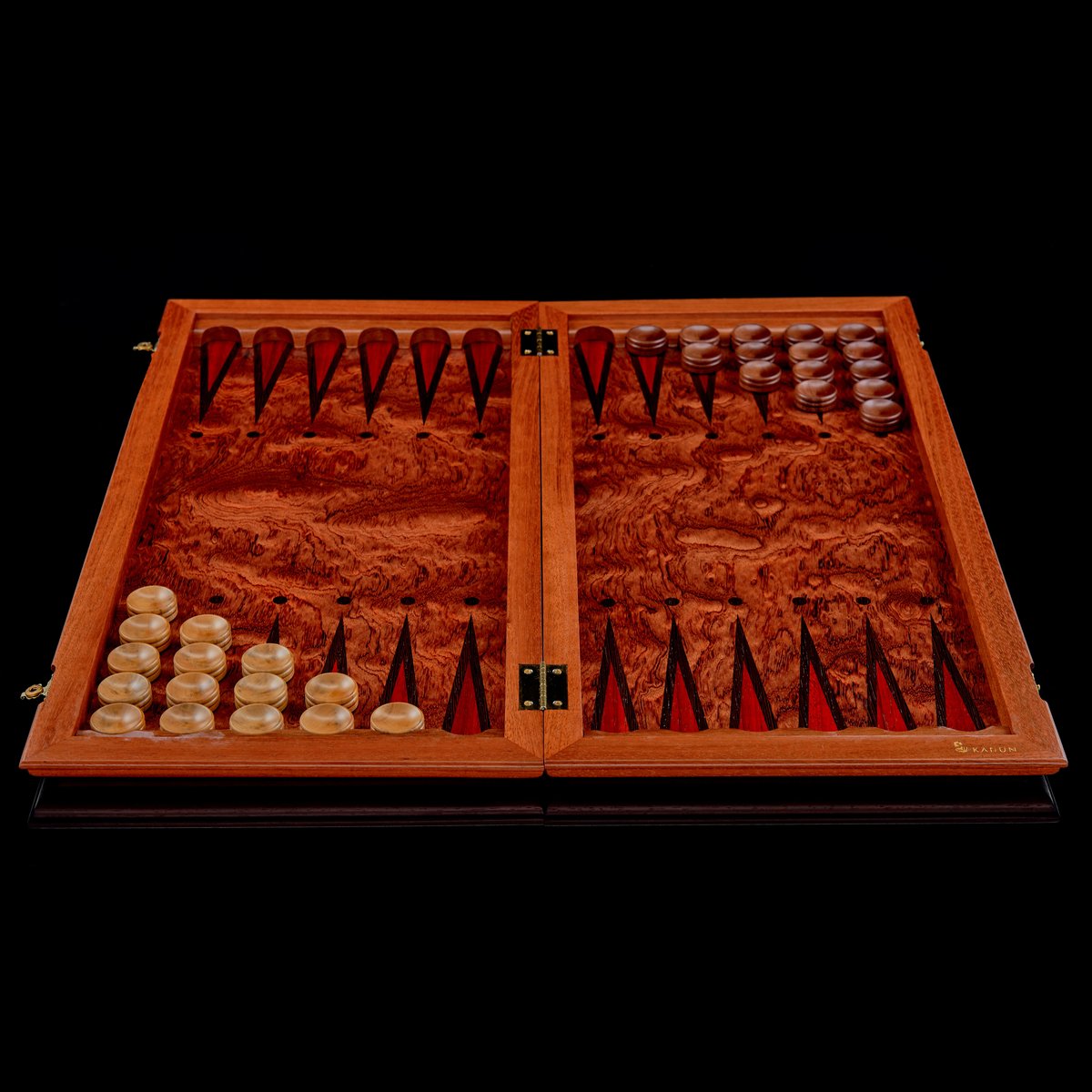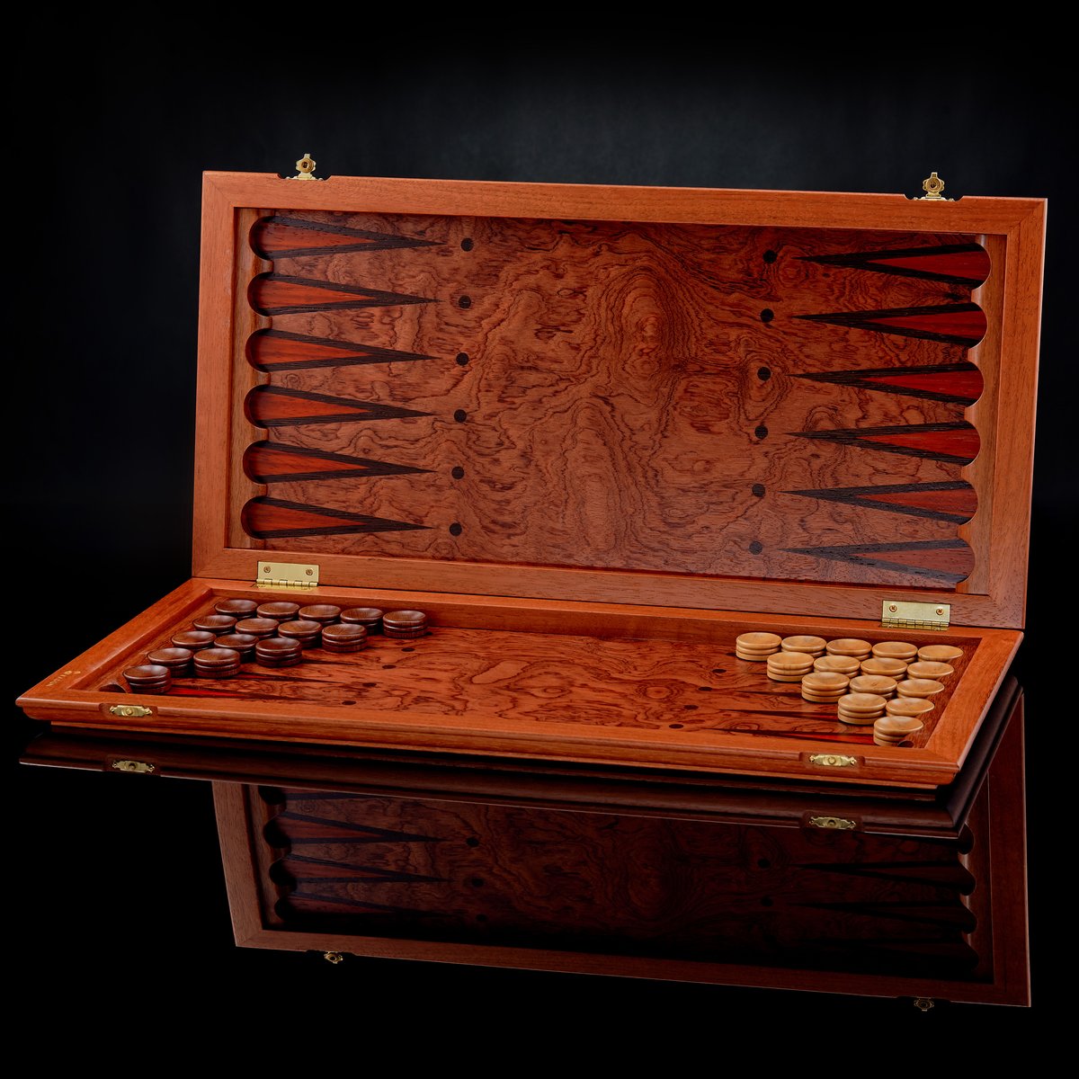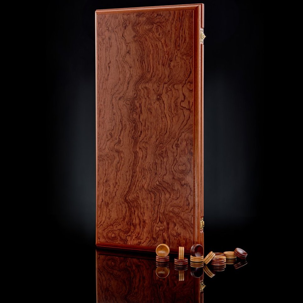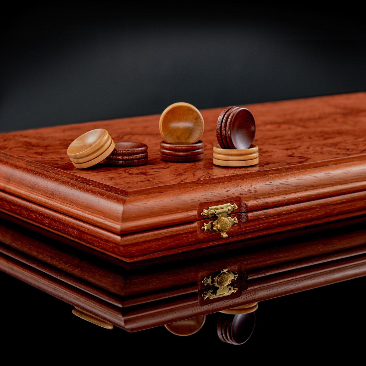 Шашки:светлые - мовингу, темные - красное дерево сапеле, подклеены фетром. Диаметр 27 мм, 30 шт.