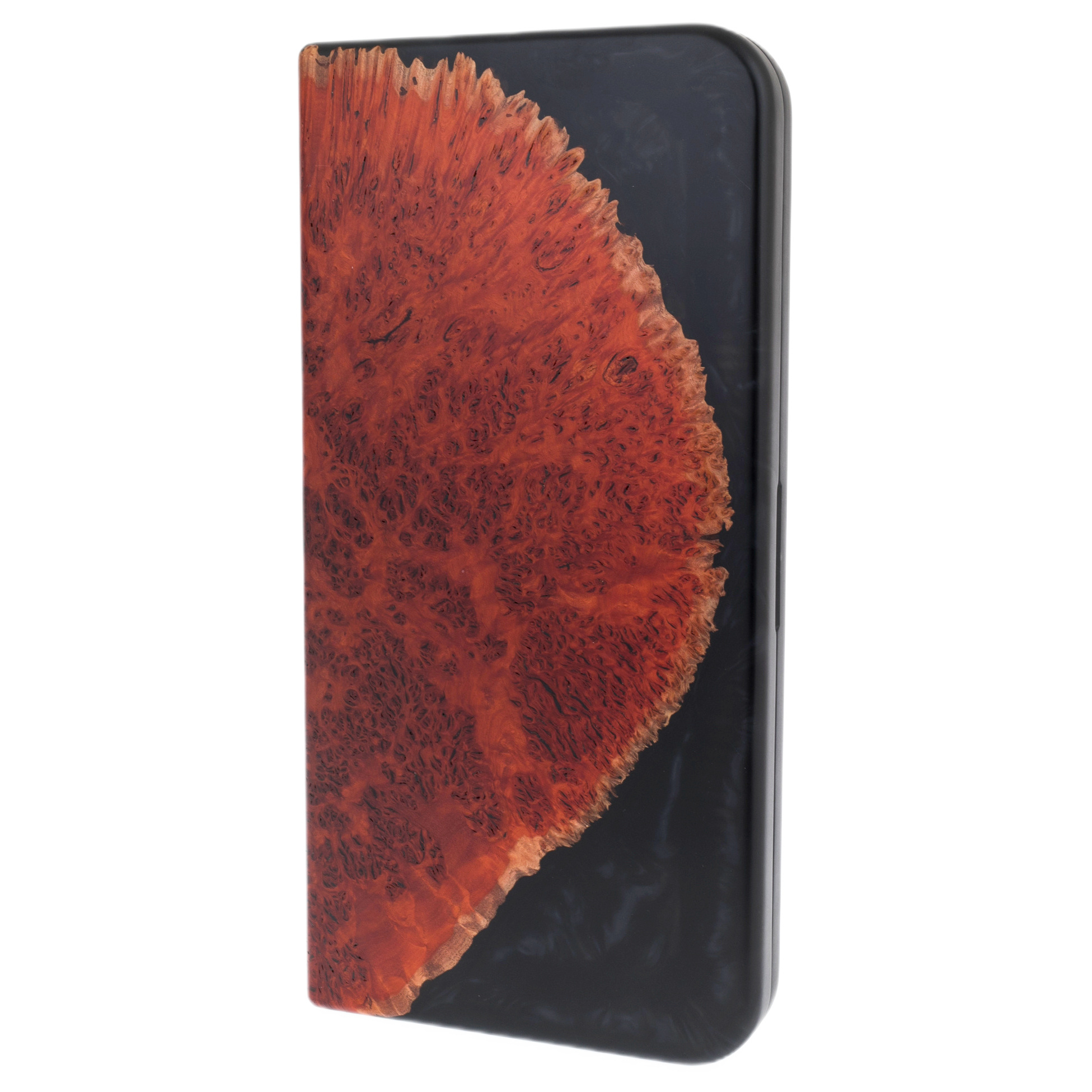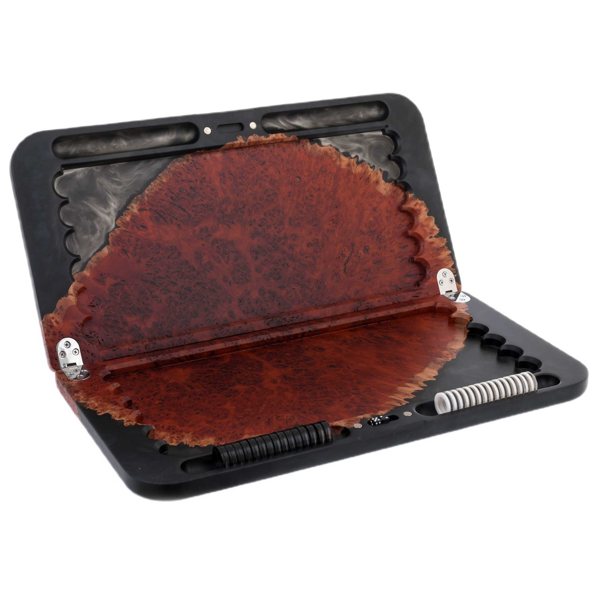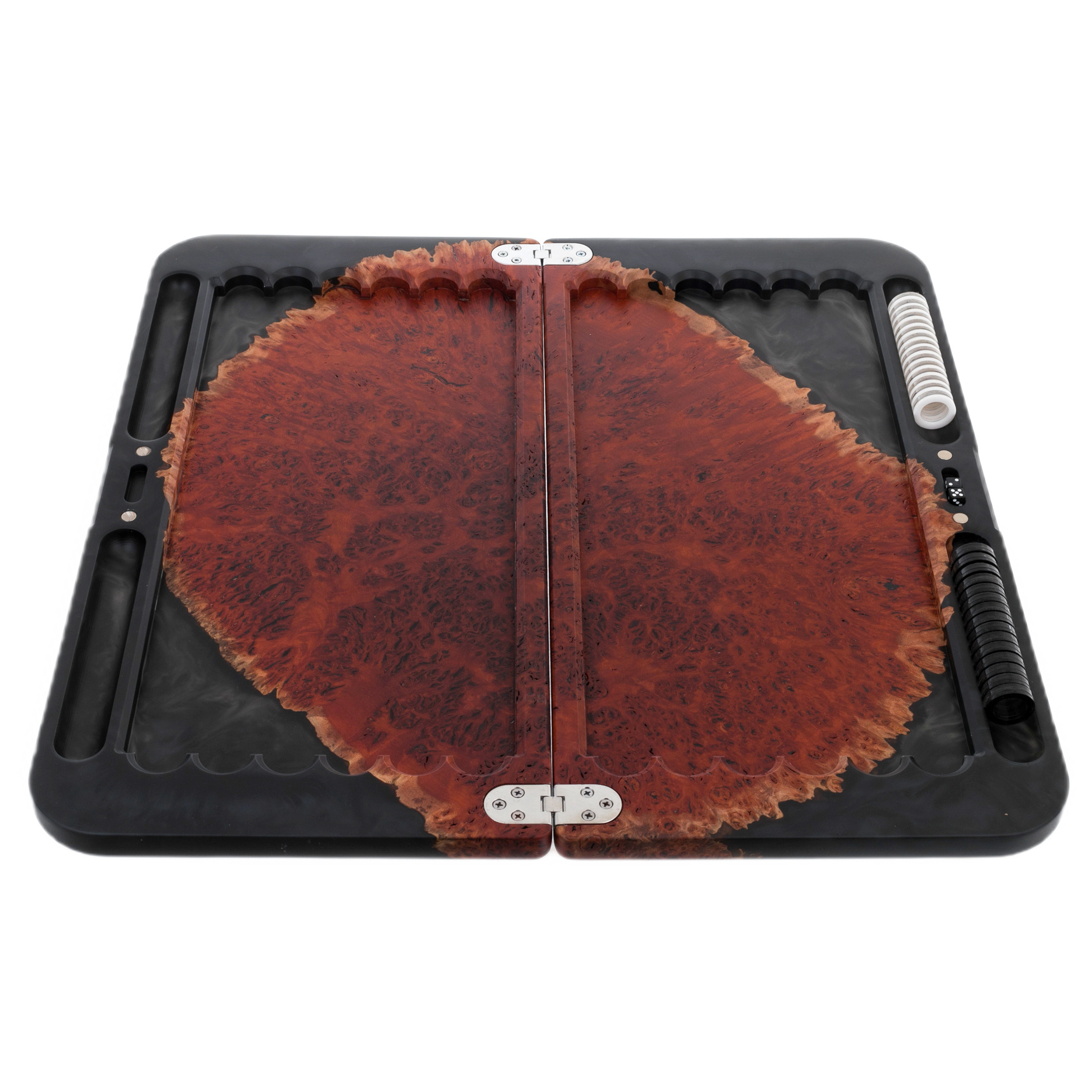 Нарды из дерева ярра и эпоксидной смолы — выразительный и харизматичный предмет, созданный для тех, кто ценит неординарные формы и безупречное исполнение. Сердцевина выполнена из капа ярра — редкой и благородной породы с огненно-красным оттенком и сложной, живой текстурой, напоминающей пульсирующую поверхность лавы. Контрастная рамка из чёрной полупрозрачной смолы с мраморными переливами не просто подчёркивает центр композиции, а задаёт ему графическую чёткость, превращая игру в эстетическое переживание.
