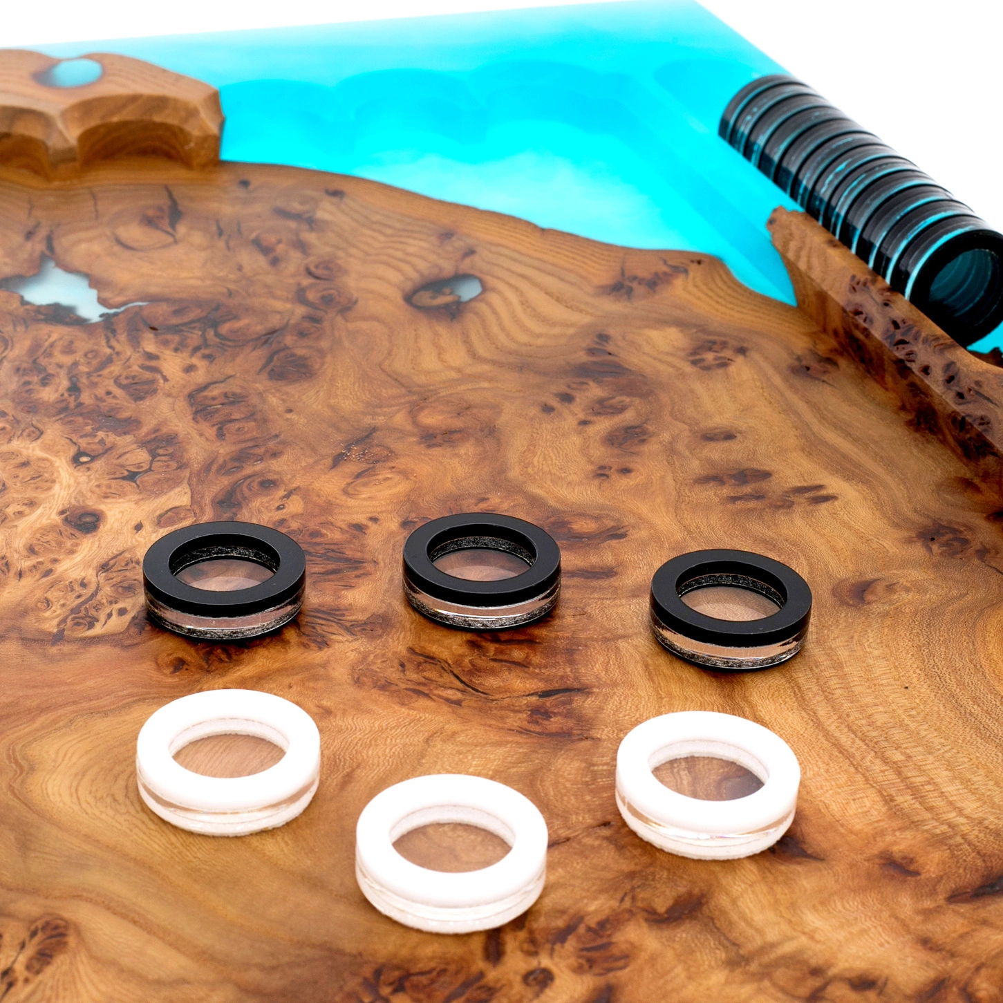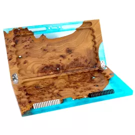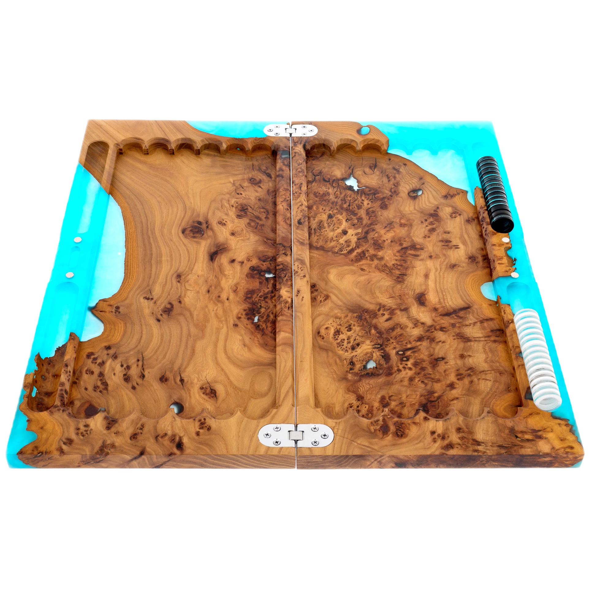 В раскрытом состоянии композиция приобретает особую художественность. Внутреннее поле вырезано с точной симметрией, при этом природный рисунок капов и сучков образует уникальный орнамент, не повторяющийся ни в одном экземпляре. Голубая смола обрамляет игровую зону, усиливая ощущение глубины и света. Металлические петли аккуратно интегрированы в конструкцию, боковые отделения предназначены для хранения фишек, что делает набор практичным и удобным для регулярной игры.