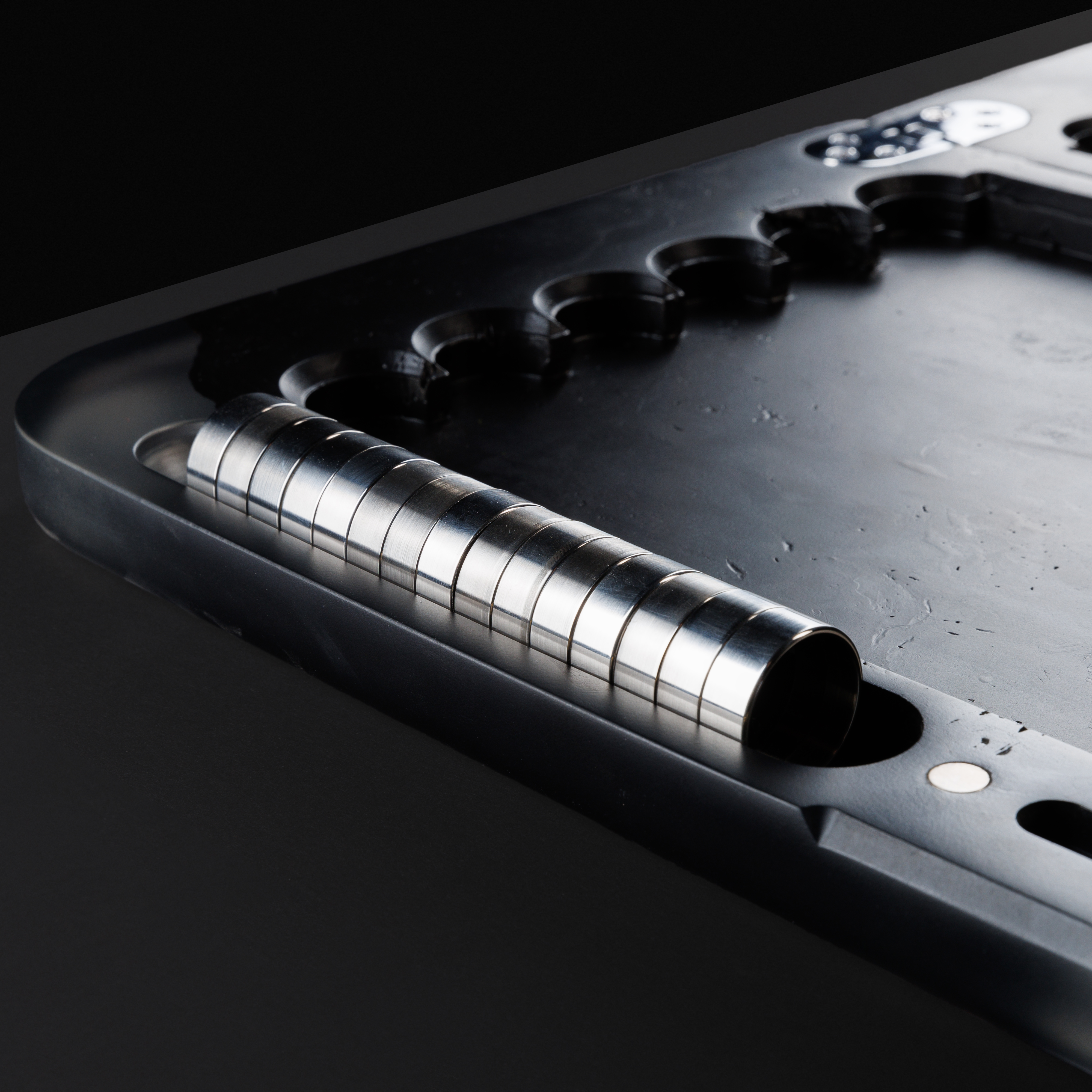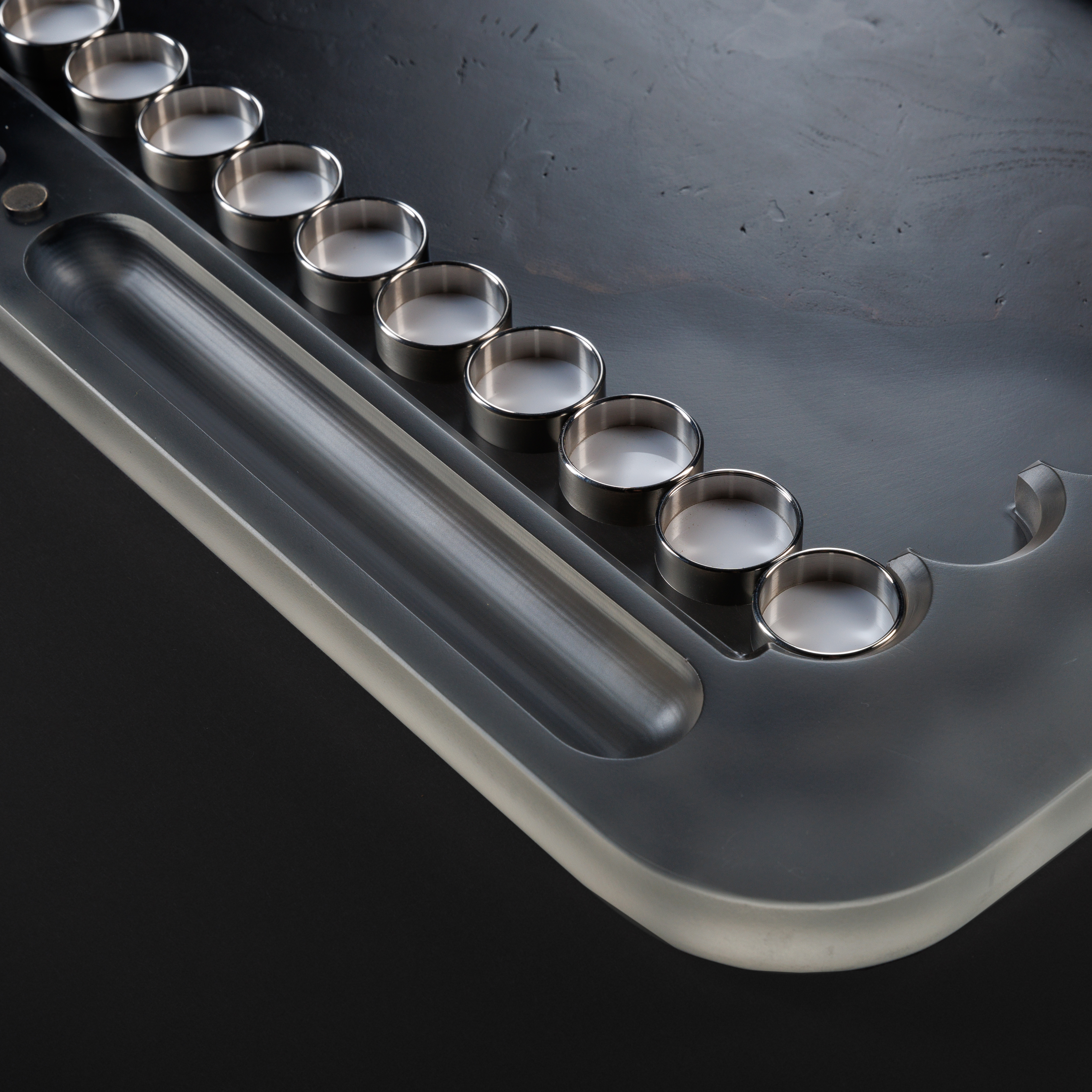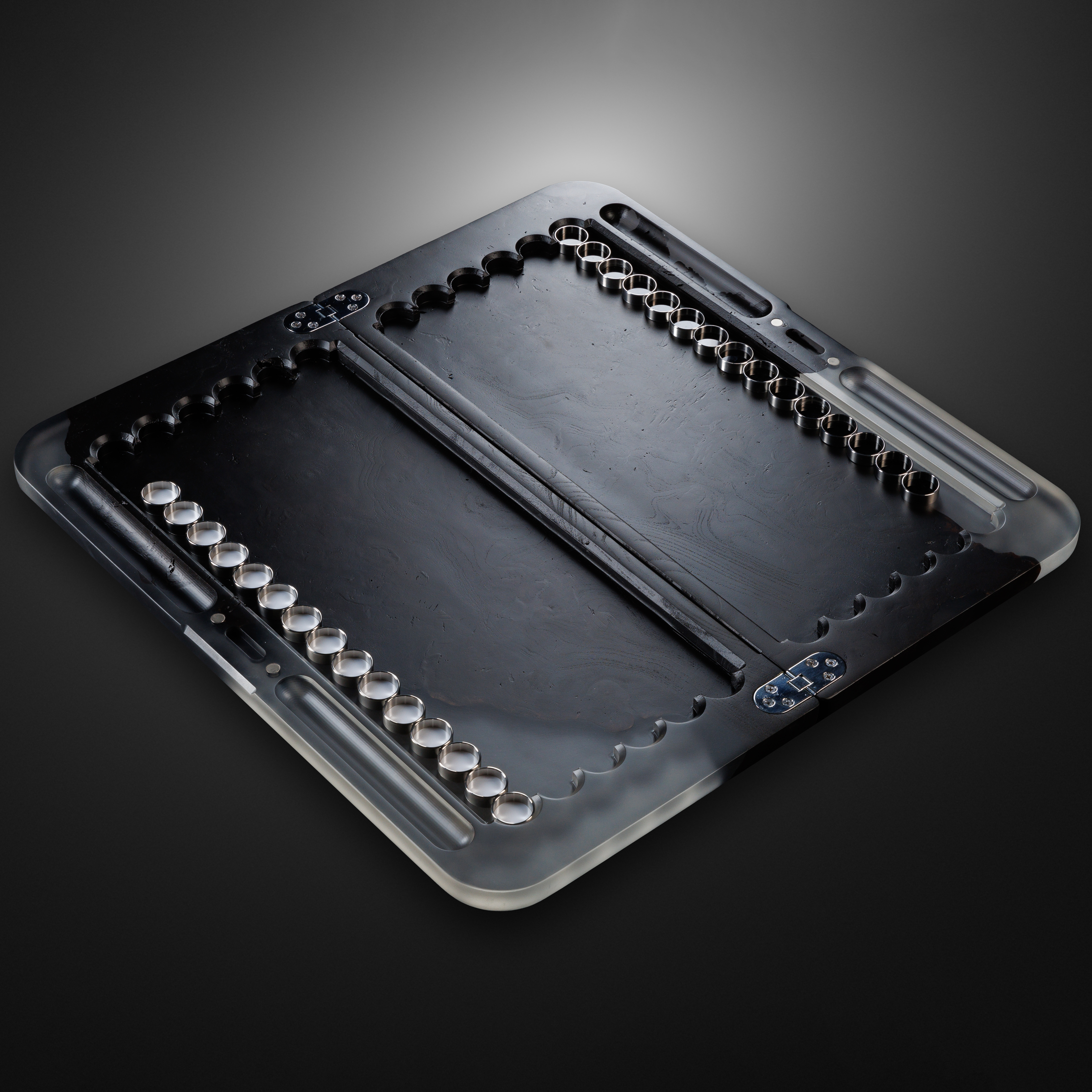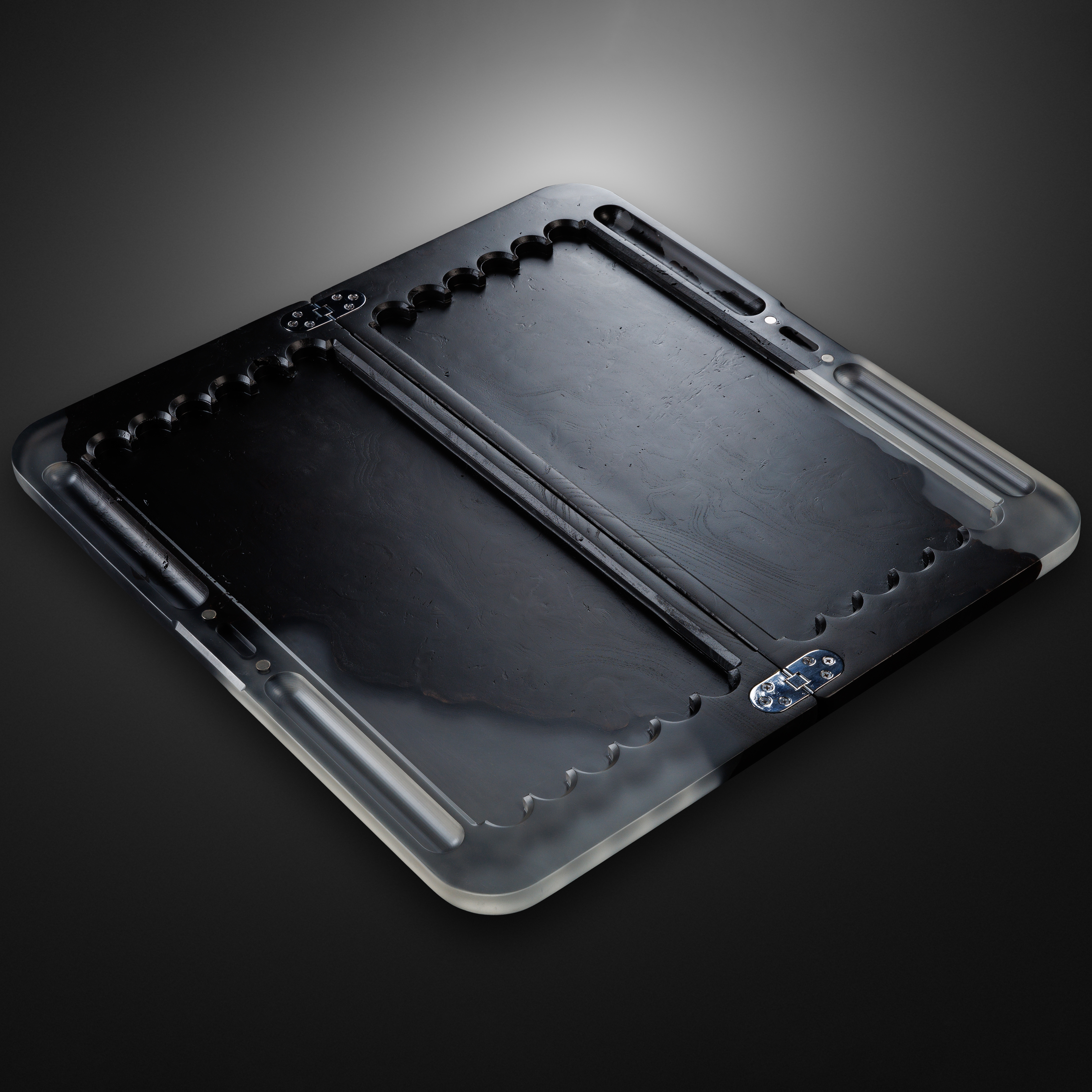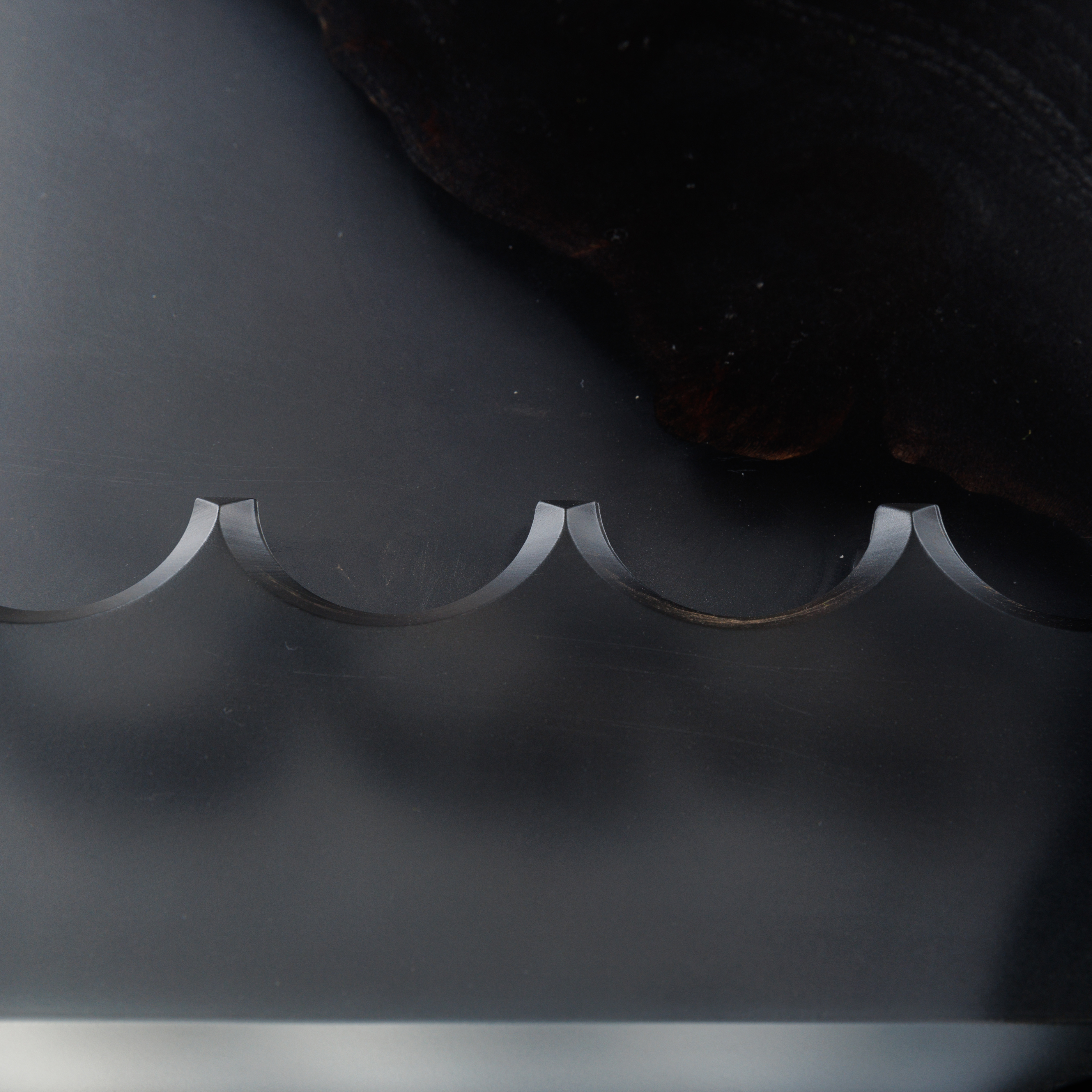 Нарды из карагача и эпоксидной смолы — это предмет силы, сдержанной роскоши и безукоризненного вкуса. Массив дерева с выразительной текстурой капа, окрашенный в глубокий тёмный тон, будто погружён в плотную дымку — чёрную смолу с полупрозрачными гранями и графитовым свечением. Гладкая поверхность изделия притягивает взгляд, создавая ощущение монолитности и мощи. Каждая выемка под фишки, каждый стык и линия корпуса выведены с ювелирной точностью, а металлические петли утоплены в структуру корпуса так, чтобы не нарушать идеальной геометрии