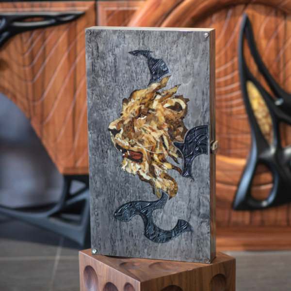 На внешней стороне игровой доски — мозаичное панно из янтаря с изображением волка. Игровое поле выдержано в том же стиле и дополнено волчьими следами. Каждый камень янтарной мозаики подобран по цвету, размеру и рисунку и гармонично смотрится на темном фоне. Игра света в кусочках янтаря создает ощущение движения — кажется, что дикий зверь замер лишь на мгновение, но в любой момент готов к прыжку. Благодаря потрясающей реалистичности мозаика напоминает картину, написанную с натуры.