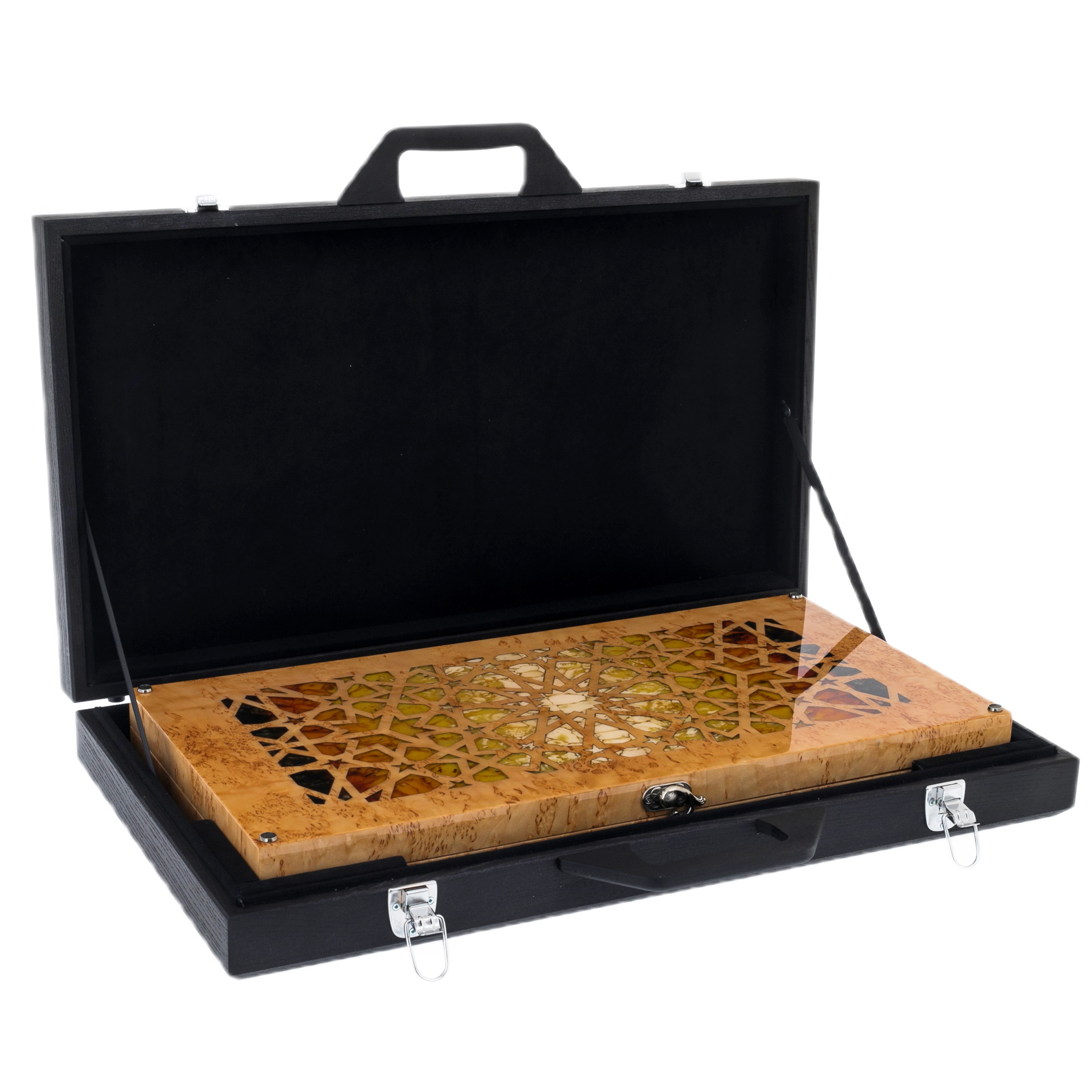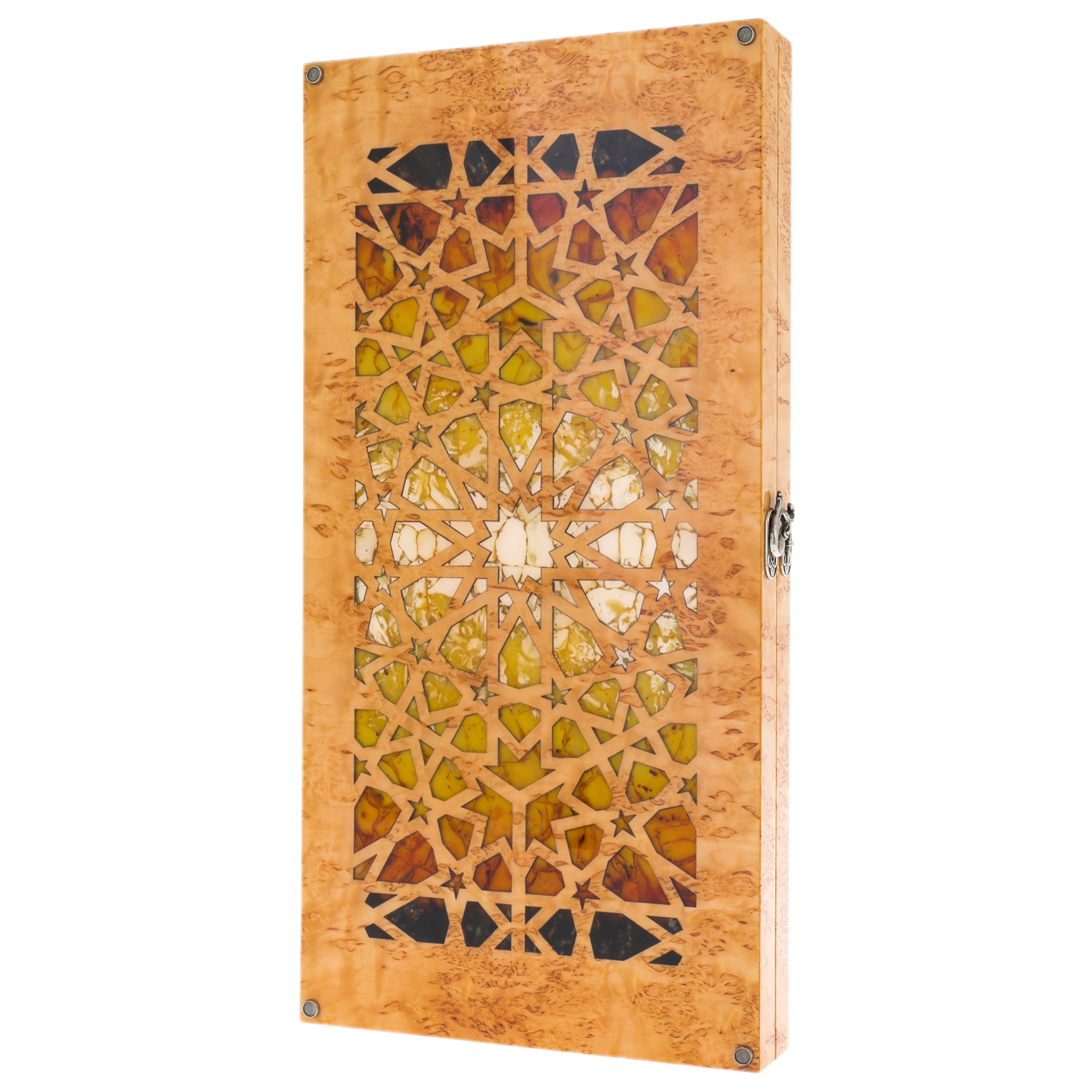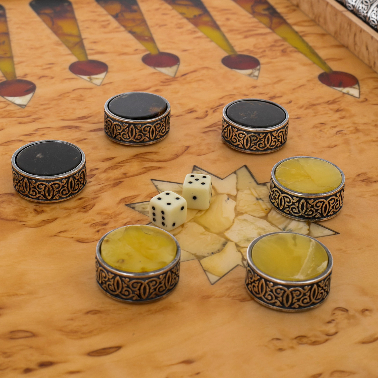 Изготовленные из карельской березы и натурального янтаря, эти нарды являбются воплощением диалога природы и искусства. Янтарь, рожденный в недрах Земли миллионы лет назад, словно хранит в себе солнечный свет, запечатанный в смоле, и теперь оживает на поверхности доски в виде сверкающих мозаичных узоров. Эта мозаика напоминает о восточных дворцах и магических орнаментах, украшающих их своды – столь же таинственных, как звездное небо над пустынями Аравии.