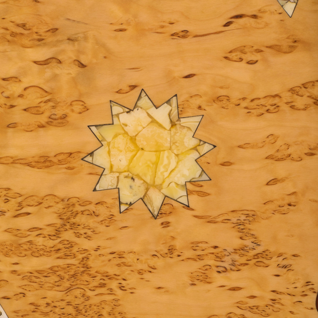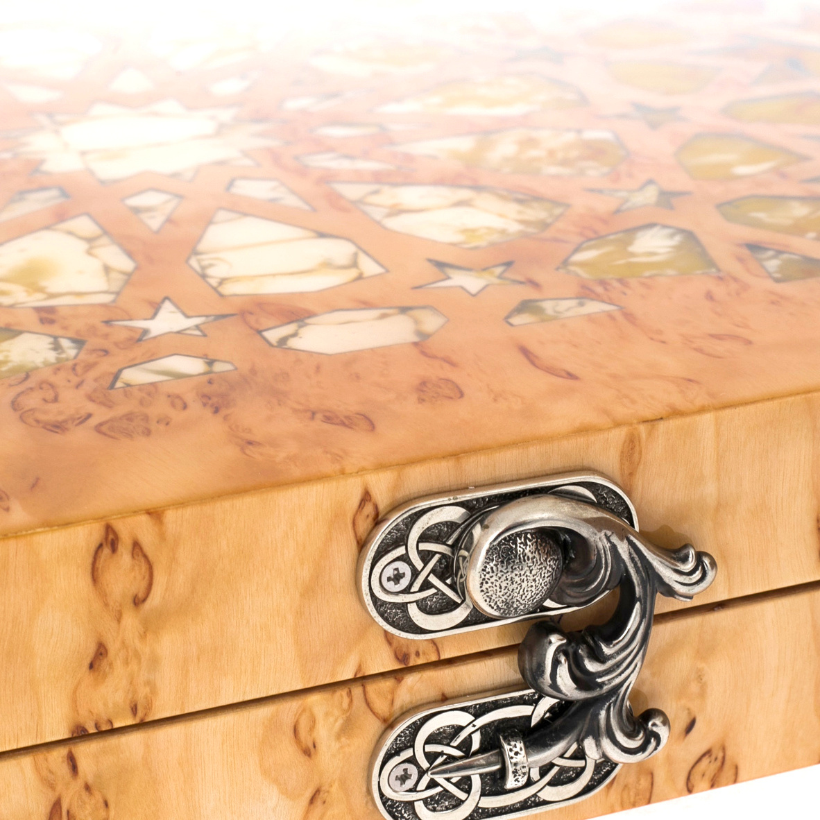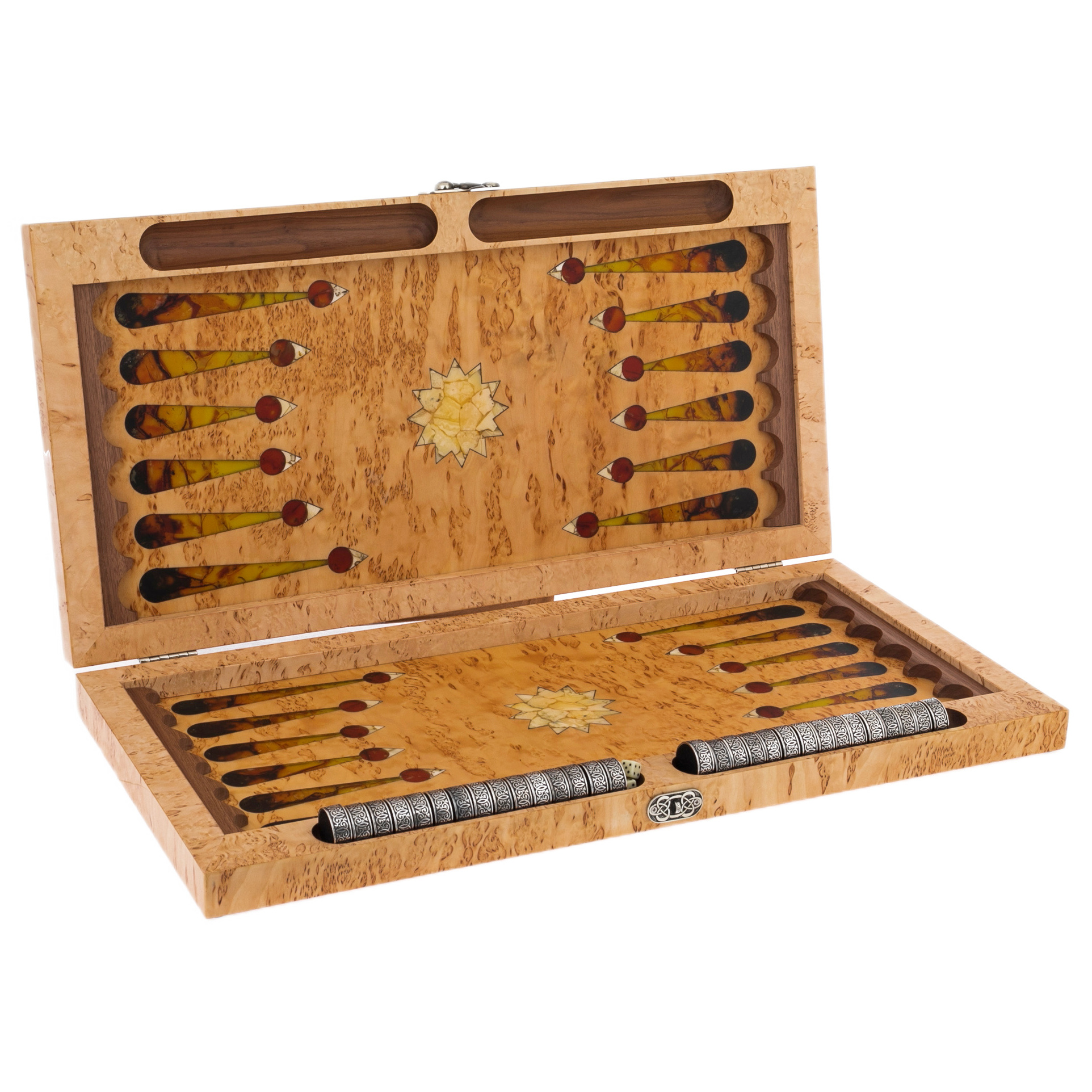 Изготовленные из карельской березы и натурального янтаря, эти нарды являбются воплощением диалога природы и искусства. Янтарь, рожденный в недрах Земли миллионы лет назад, словно хранит в себе солнечный свет, запечатанный в смоле, и теперь оживает на поверхности доски в виде сверкающих мозаичных узоров. Эта мозаика напоминает о восточных дворцах и магических орнаментах, украшающих их своды – столь же таинственных, как звездное небо над пустынями Аравии.