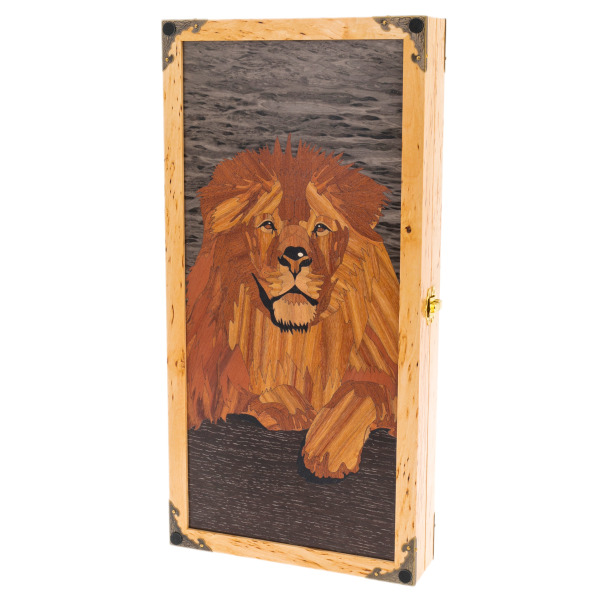 Великолепный шедевр из карельской березы — нарды, воплощающие силу и величие природы. На крышке резного футляра высечен образ льва, символа власти, благородства и внутренней мощи. Его гордая осанка, проницательный взгляд и пышная грива, созданные из тончайших слоев ценных пород дерева, напоминают о древних легендах, в которых лев являлся властелином всех зверей.
