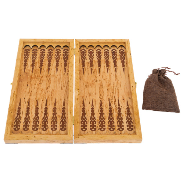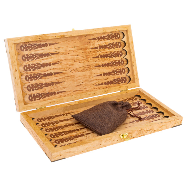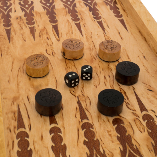 Каждый элемент этого набора — искусное переплетение традиций и мастерства. Внутреннее игровое поле украшено резными восточными орнаментами, словно скрывает в себе наследие великих цивилизаций. Фишки, выполненные из светлого и темного дерева, несут на себе изображение львиных следов — напоминание о том, что лишь уверенный в себе игрок способен оставить свой след в истории побед.