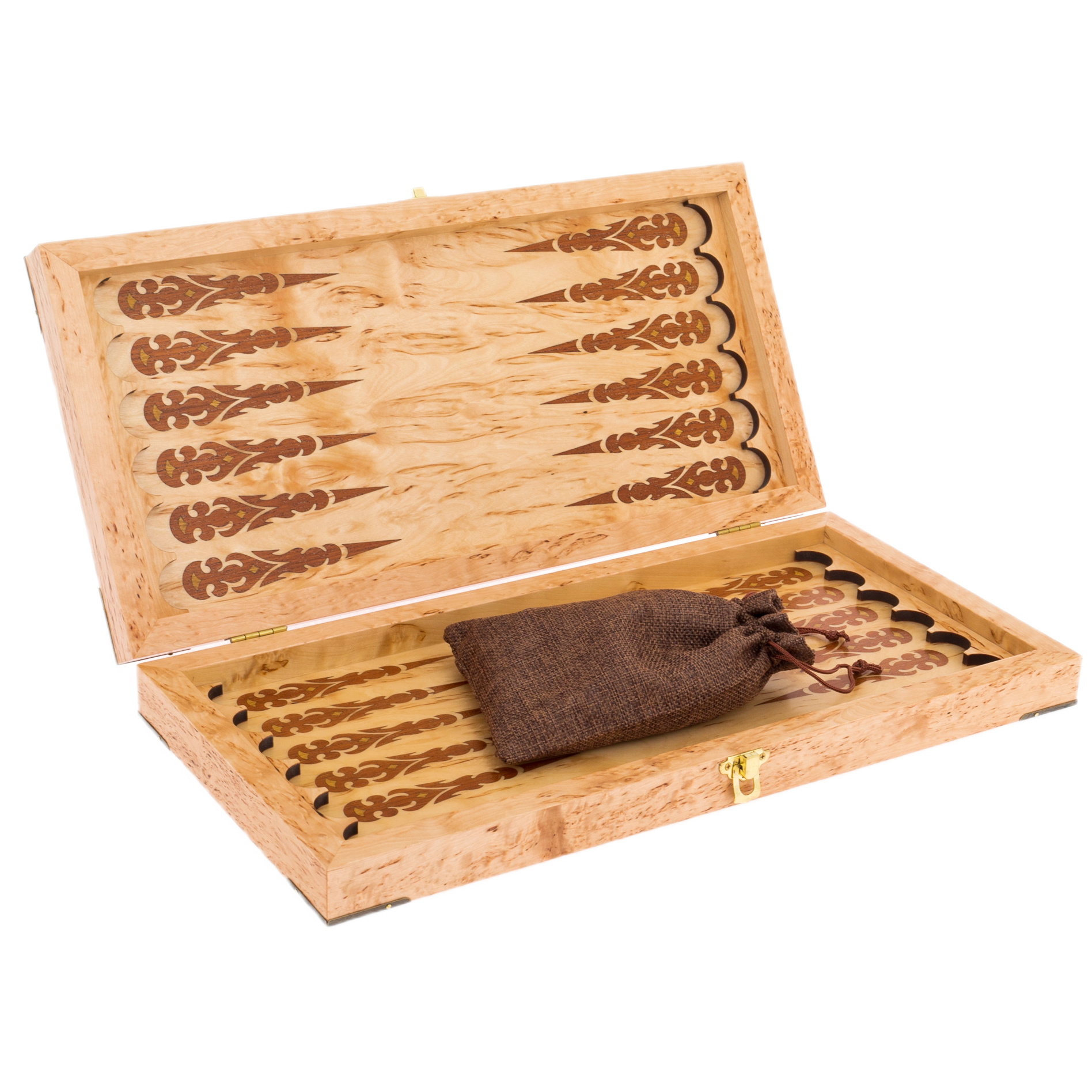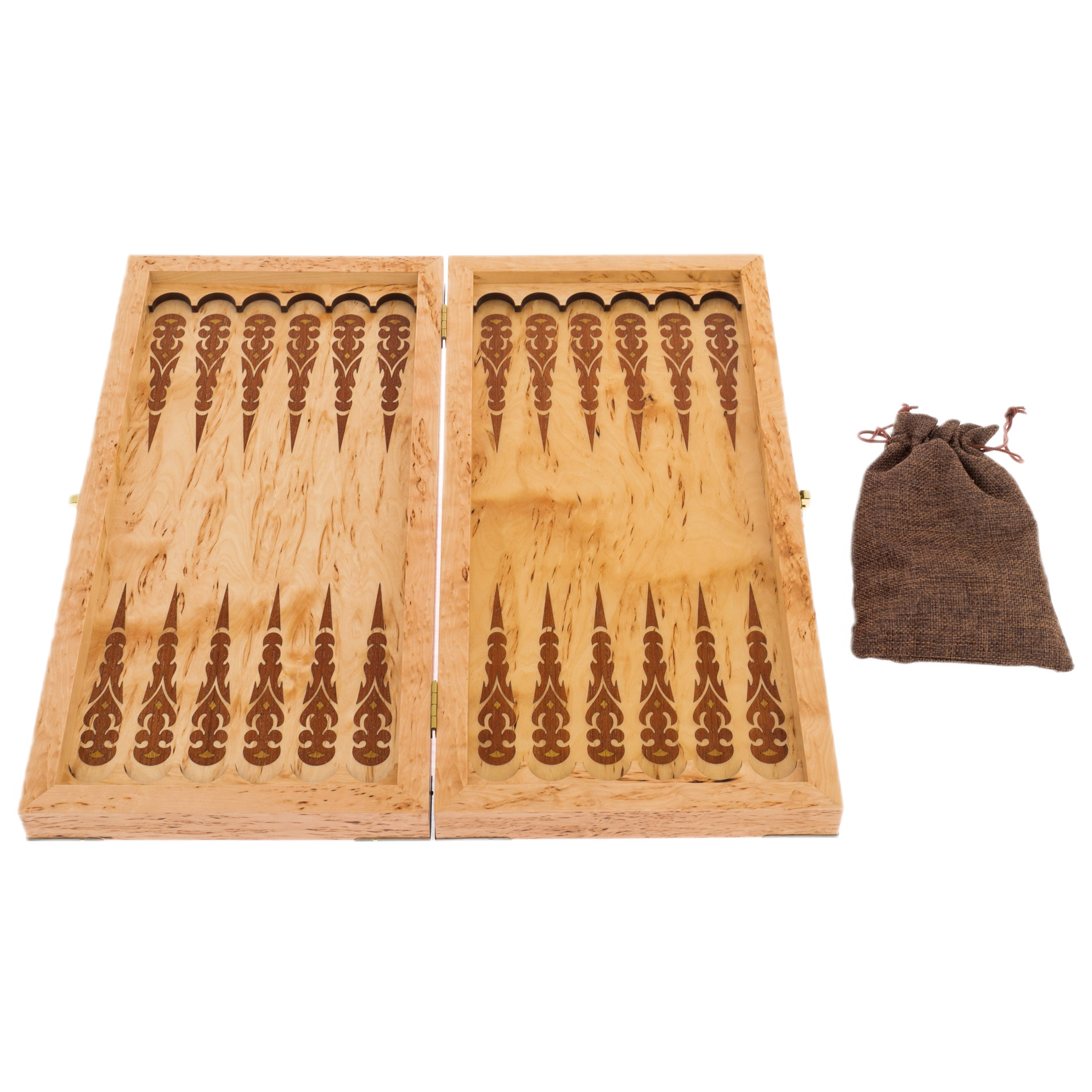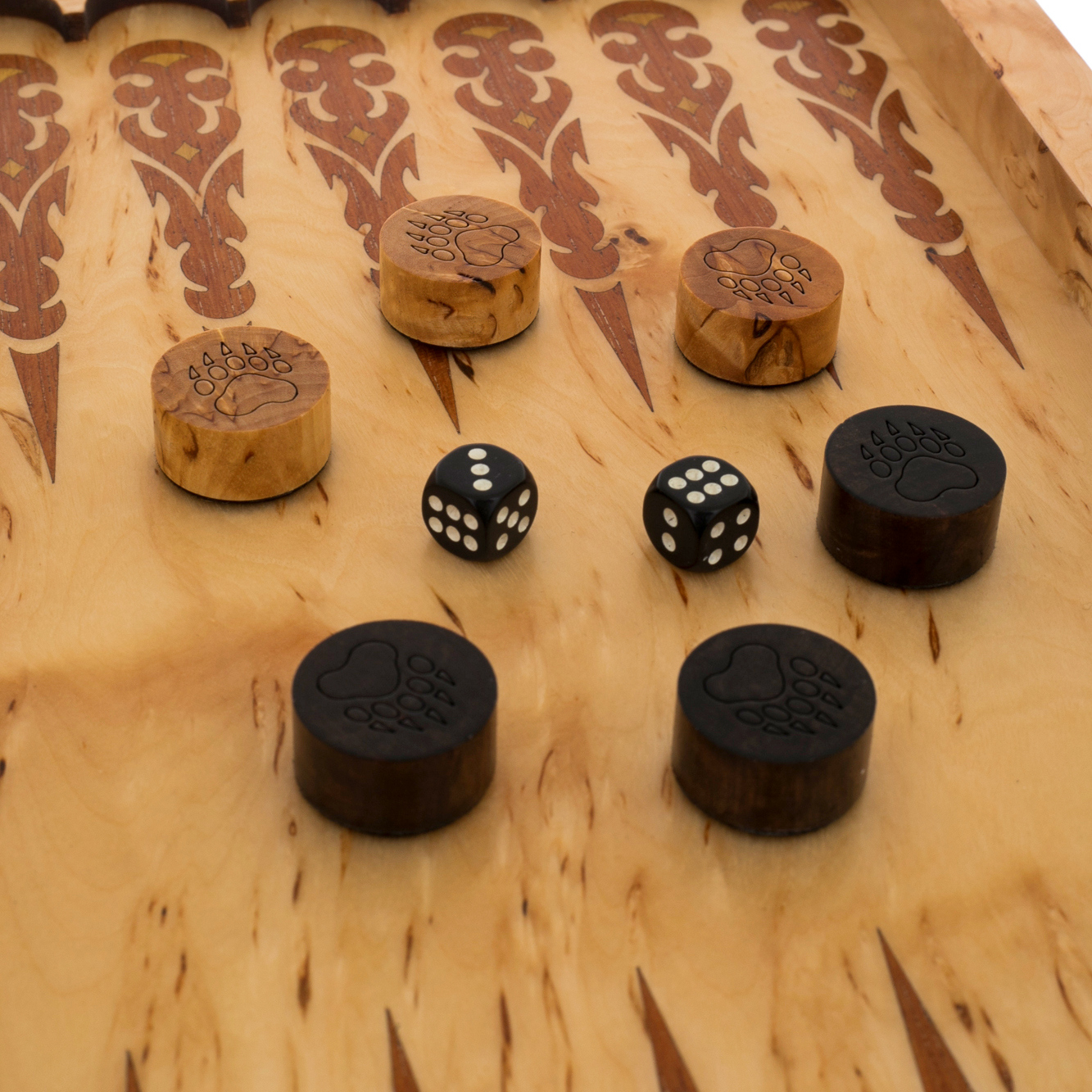 Каждая деталь в этой композиции — дань вековым традициям. Узоры на игровом поле, вырезанные с изысканной аккуратностью, создают впечатление старинных персидских миниатюр, в которых за каждым завитком скрыта тайна. Фишки, контрастные как день и ночь, словно напоминают о балансе силы и стратегии, а их украшение в виде медвежьих следов говорит о том, что только уверенные шаги ведут к победе.
