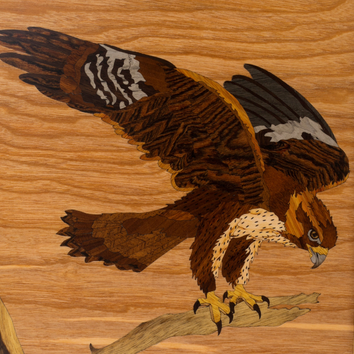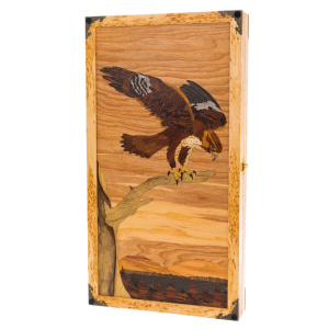 На внешней стороне игровой доски — мозаичное панно из янтаря с изображением волка. Игровое поле выдержано в том же стиле и дополнено волчьими следами. Каждый камень янтарной мозаики подобран по цвету, размеру и рисунку и гармонично смотрится на темном фоне. Игра света в кусочках янтаря создает ощущение движения — кажется, что дикий зверь замер лишь на мгновение, но в любой момент готов к прыжку. Благодаря потрясающей реалистичности мозаика напоминает картину, написанную с натуры.