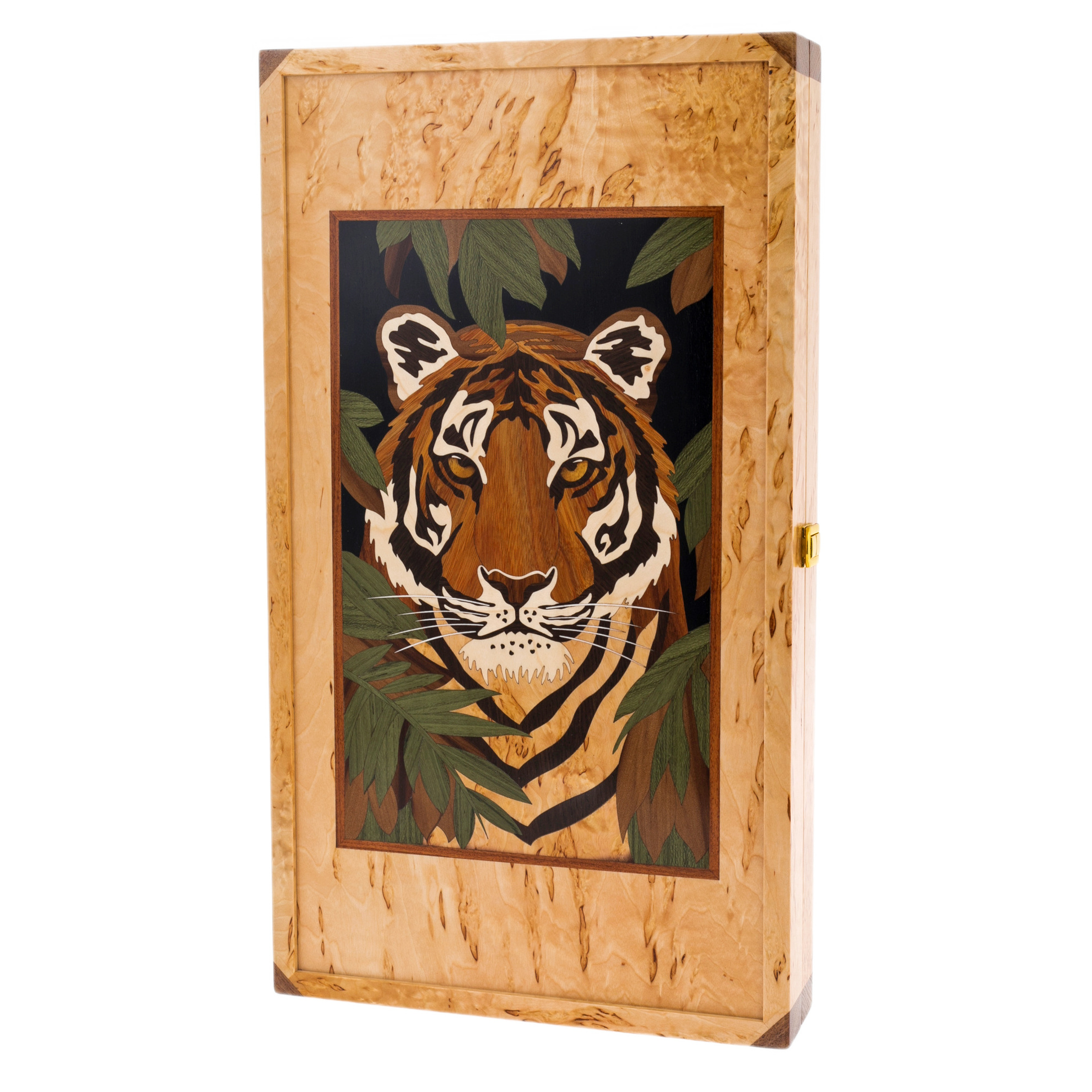 Нарды из карельской берёзы «Тигр» — это настоящее произведение декоративно-прикладного искусства, сочетающее благородство натурального дерева и силу символа. На крышке изделия выполнено изображение тигра — мощного, внимательного, готового к стремительному броску. Мастерская инкрустация из ценных пород древесины создаёт впечатление живого взгляд.