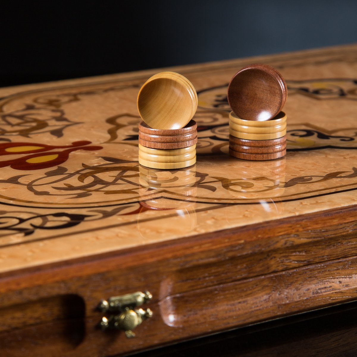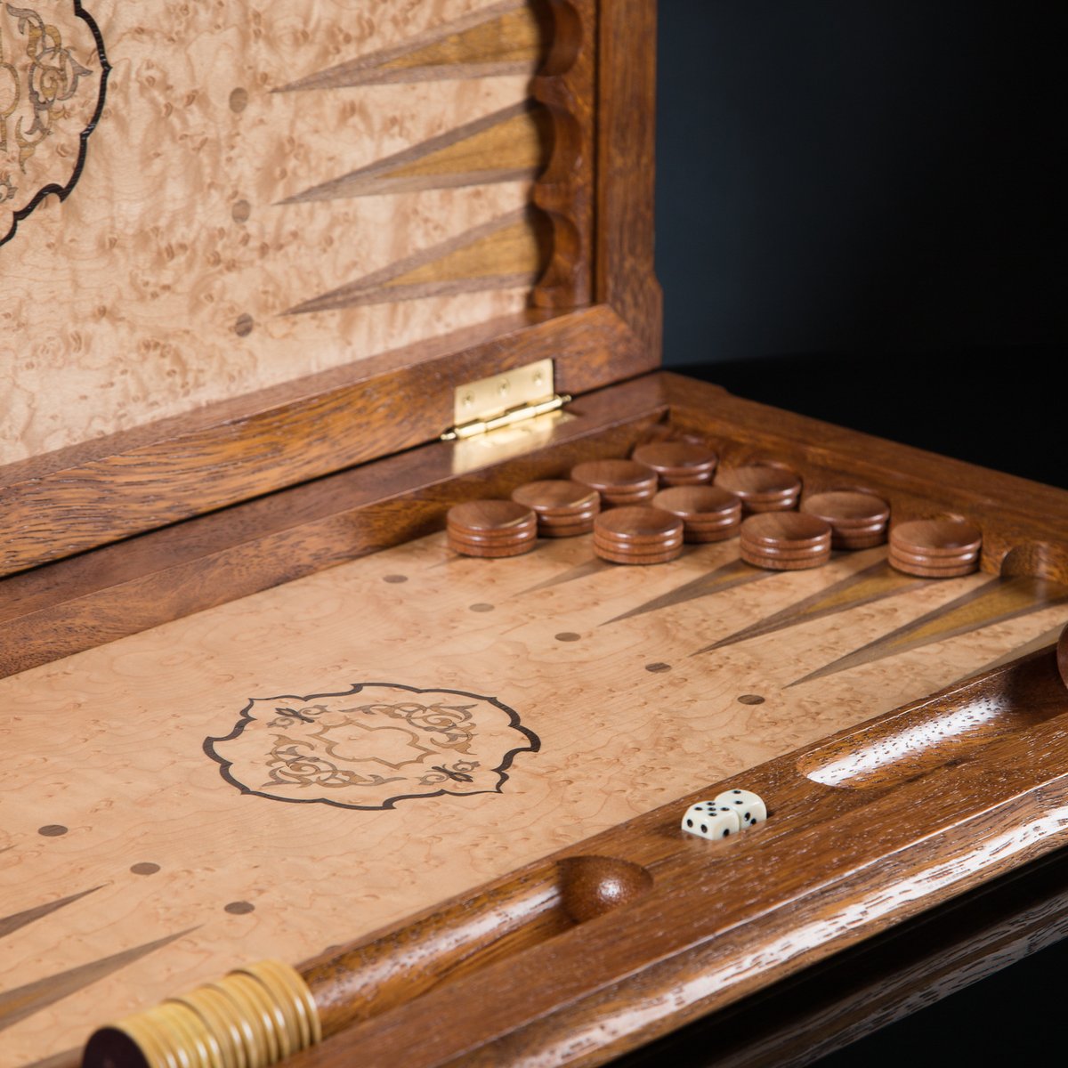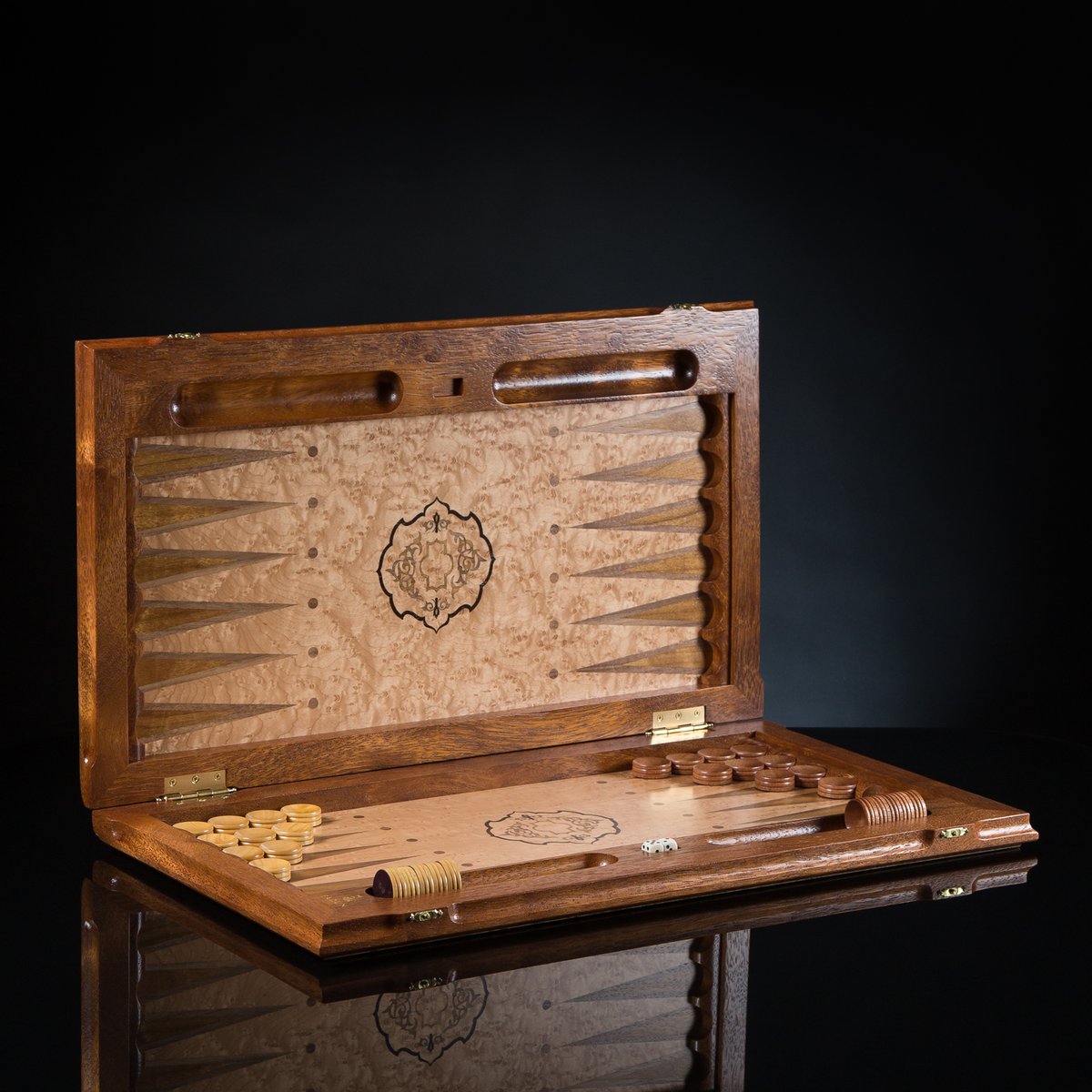 Нардовая доска «Жемчужина востока» выполнена из древесины "Огненное перо", которая обладает уникальной текстурой и относится эксклюзивным материалам для декоративной отделки высокохудожественных изделий.