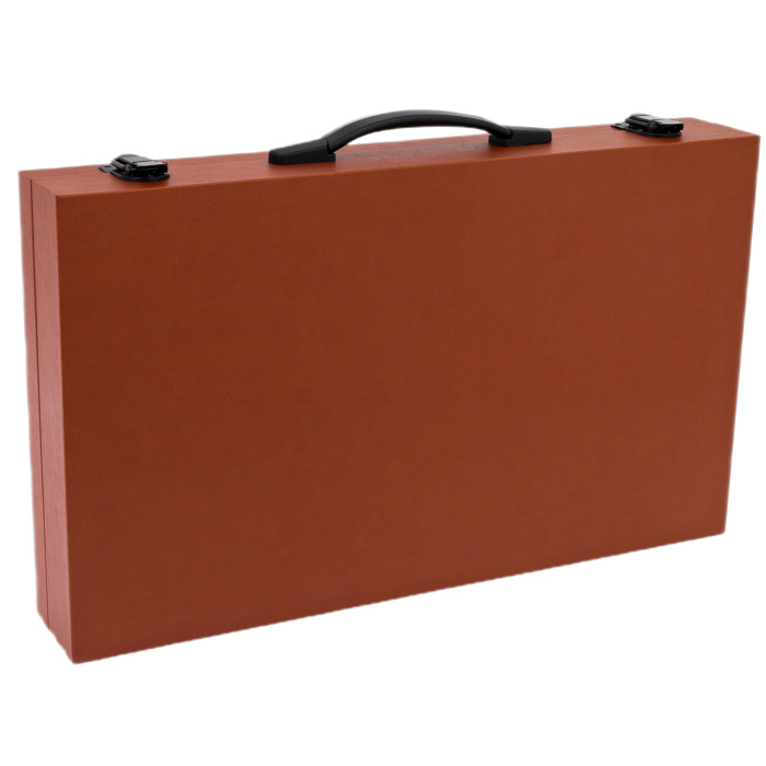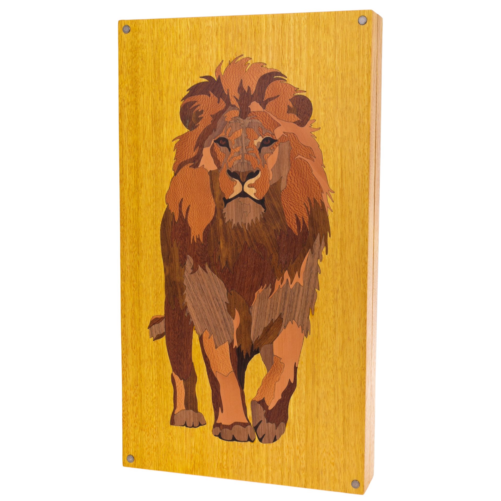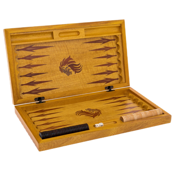Внутреннее поле выполнено в той же манере: строгая симметрия клиновидных дорожек, выложенных древесиной тёмных тонов, сочетается с центральным символом льва, задающим игру особую энергетику. Петли скрытого монтажа выдерживают многолетнюю эксплуатацию, а высокие борта с аккуратно выбранными нишами для фишек обеспечивают безукоризненное удобство. Гладкая текстура мовингу, дающая характерный золотистый отлив, подчеркивает премиальный уровень работы и вносит в изделие то редкое ощущение предмета, созданного не просто опытной рукой, а рукой мастера.