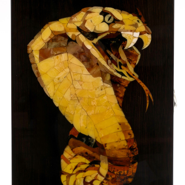 На крышке изображена янтарная кобра — символ грации, скорости и смертельной точности. Её извивающийся силуэт, выполненный из золотистого янтаря, будто струится солнечными лучами, замершими в камне. Она словно страж, охраняющий покой владельца и готовый атаковать по первому его велению. Её взгляд — это вызов, её поза — это напоминание о том, что власть всегда принадлежит тем, кто умеет ею распоряжаться.