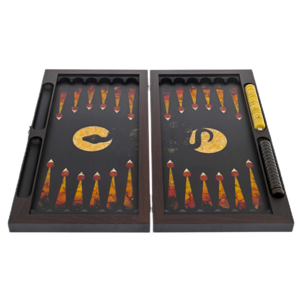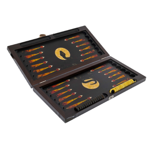 Игровое поле нард — это целый мир, где инкрустации из янтаря создают впечатление потока энергии, движущегося с каждым ходом шашек. Яркие узоры, будто пламя, перетекают в спокойные линии дуба, напоминая о балансе между решительностью и мудростью. Шашки, выполненные из янтаря двух оттенков, представляют собой дуэль света и тьмы, вдохновляя на поиск гармонии и победы в любой игре.