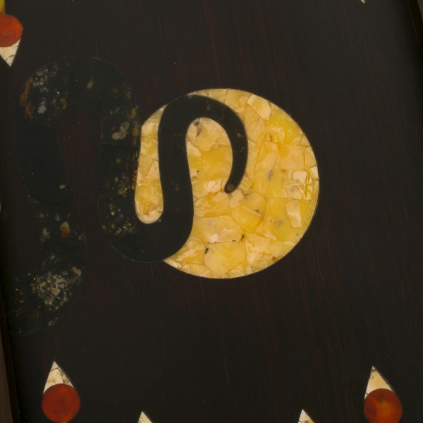 На внешней стороне игровой доски — мозаичное панно из янтаря с изображением волка. Игровое поле выдержано в том же стиле и дополнено волчьими следами. Каждый камень янтарной мозаики подобран по цвету, размеру и рисунку и гармонично смотрится на темном фоне. Игра света в кусочках янтаря создает ощущение движения — кажется, что дикий зверь замер лишь на мгновение, но в любой момент готов к прыжку. Благодаря потрясающей реалистичности мозаика напоминает картину, написанную с натуры.