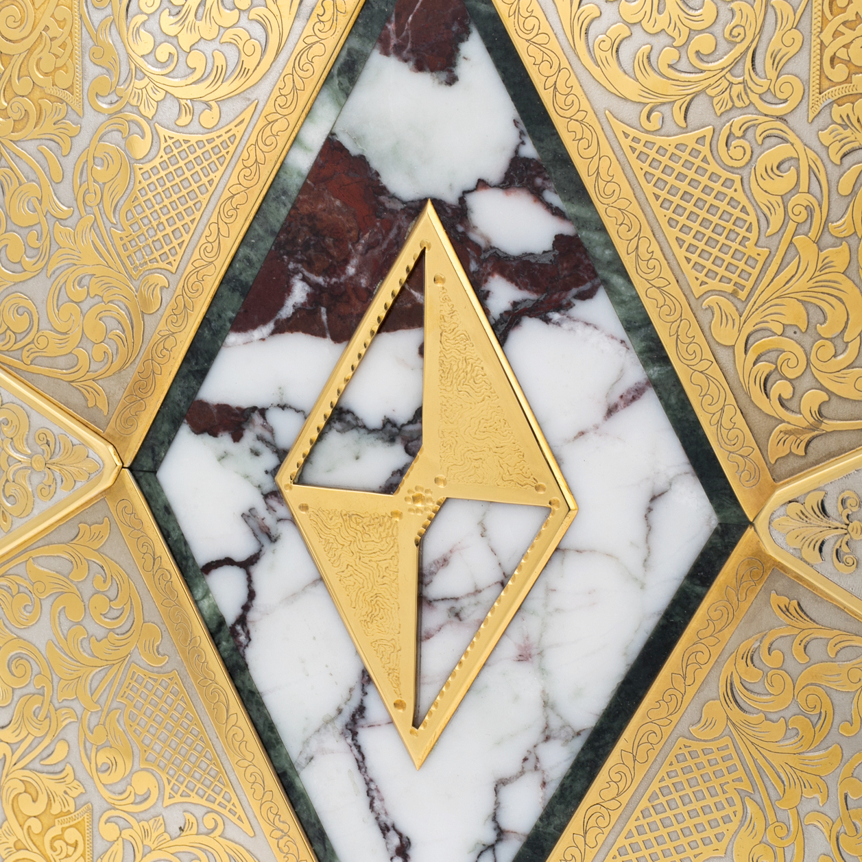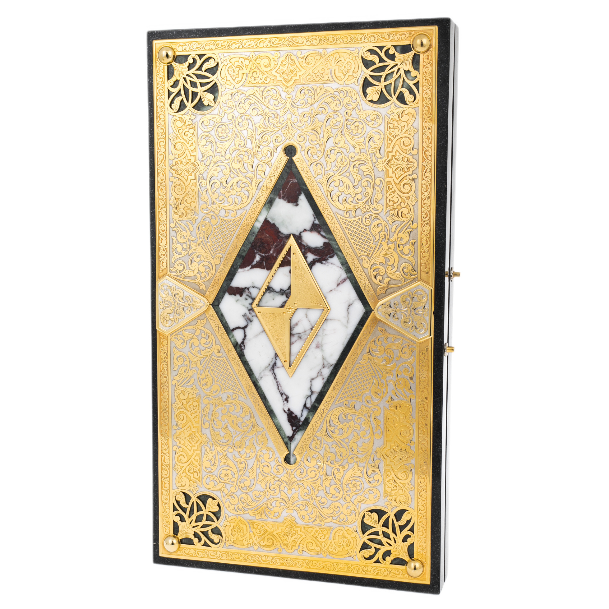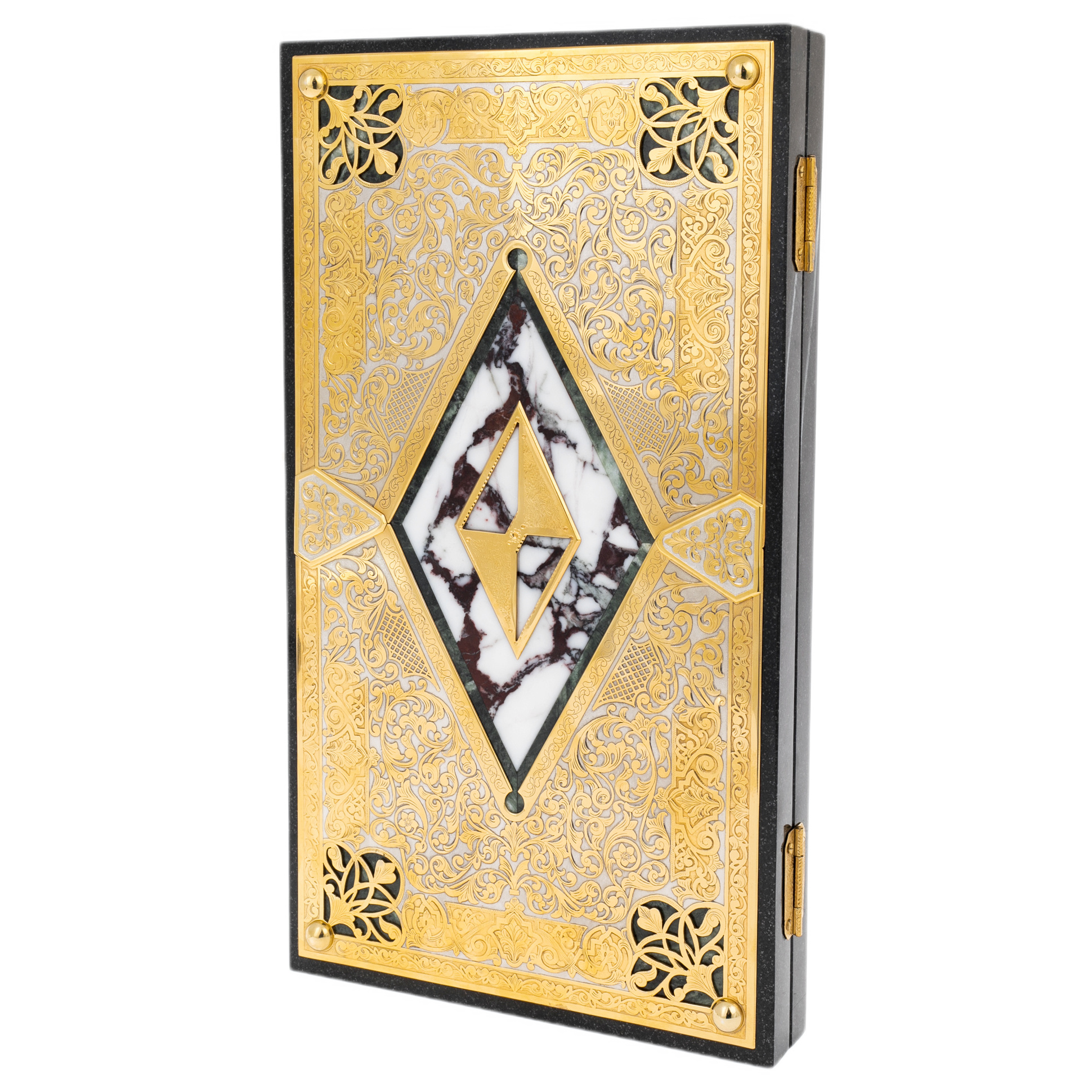 Нарды из мрамора и долерита «Ромб» — это воплощение классической роскоши, где благородные материалы сочетаются с филигранной точностью исполнения. Корпус изделия создан из плотного долерита, наделённого природной глубиной цвета и монументальностью камня, который веками служил символом силы и вечности. Поверхность декорирована вставками из мрамора, чьи белые и бордовые прожилки образуют уникальный природный рисунок, а центр композиции венчает ромб, инкрустированный золочёными элементами и заключённый в орнаментальную рамку ручной гравировки.